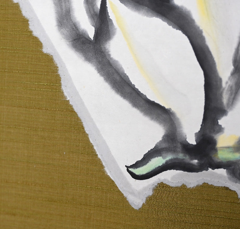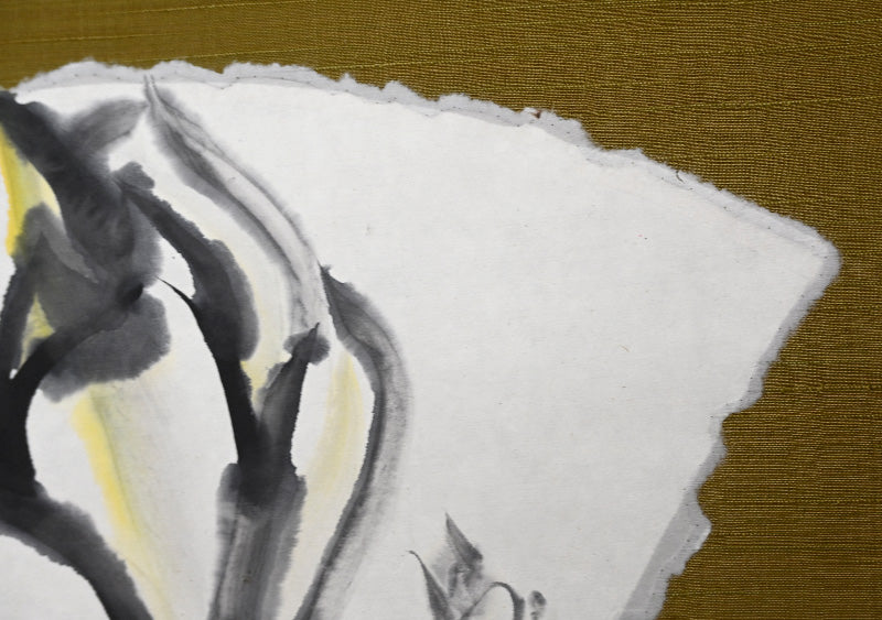 Delicate white @etals open quietly on the fan shaped paper canvas of this scroll by Nomura Seiroku enclosed in the original signed wooden box titled Shiroi Hana (White Flower). Ink and light color on paper mounted on green fabric extended with gold, the scroll is 52.5 x 120 cm (21 × 47 inches) and is in excellent condition.