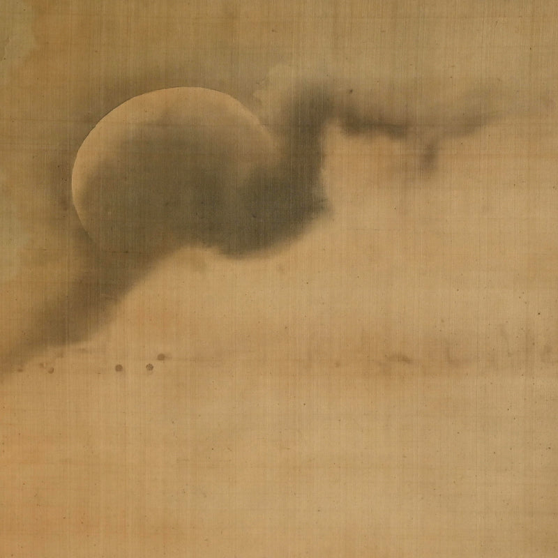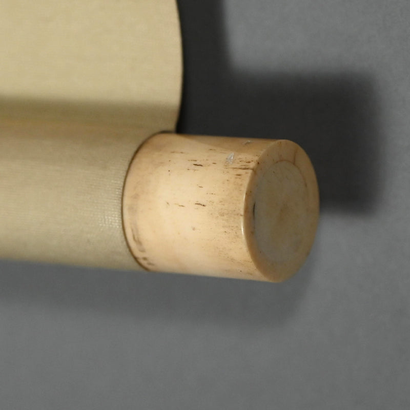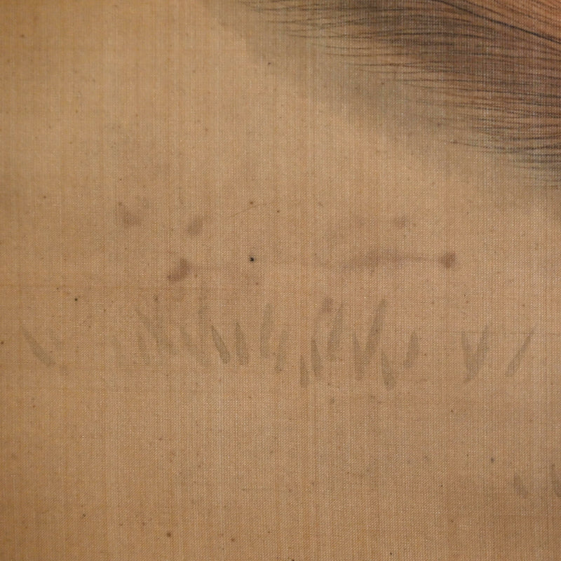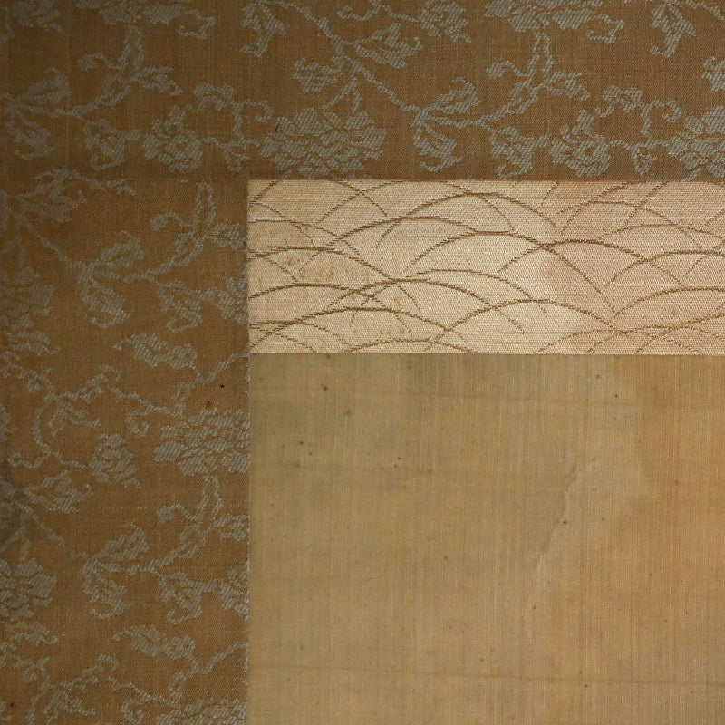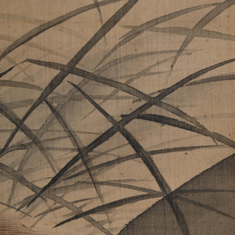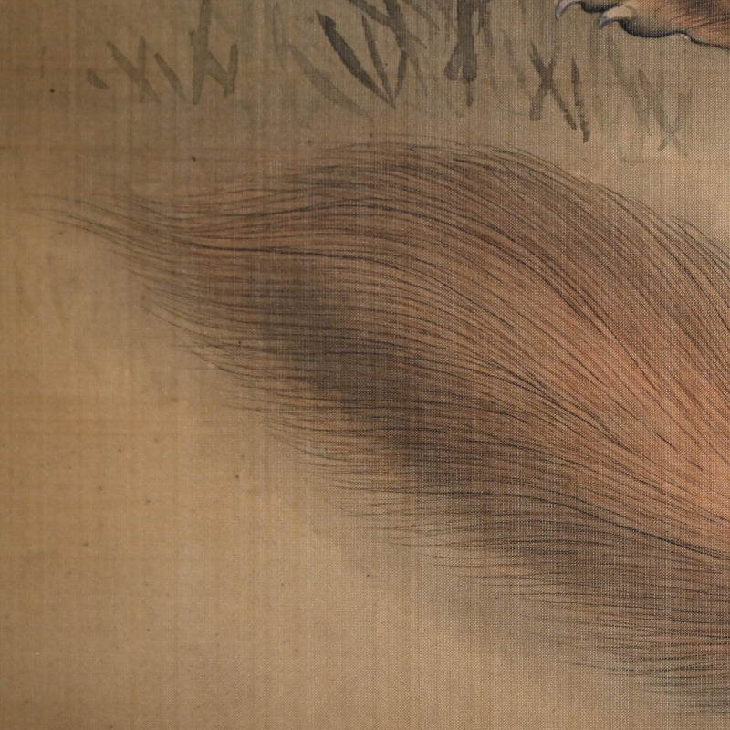 A painting of a fox in dried grass by Mori Tetsuzan mounted in pale beige silk patterned with vines and featuring bone rollers. Tetsuzan’s painting style blends the Kano-school training inherited from his father Shuho, the keen animal studies characteristic of his adoptive father Sosen, and the naturalistic realism of the Maruyama school. His works are marked by a distinctive ability to envelop his subjects in a rich atmospheric setting, creating compositions of notable emotional resonance. Although best known for animal subjects—like Sosen, but extending beyond monkeys to a wide range of less commonly depicted creatures—he approached each motif with refined observation and sensitivity. The scroll is 51 x 180 cm (20 x 71 inches). Nearly the entire silk canvas has been stained with water, perhaps some flood many decades ago, and has been cleaned and remounted in a more modern frame sensitive to the origins and comes enclosed in a wooden box.