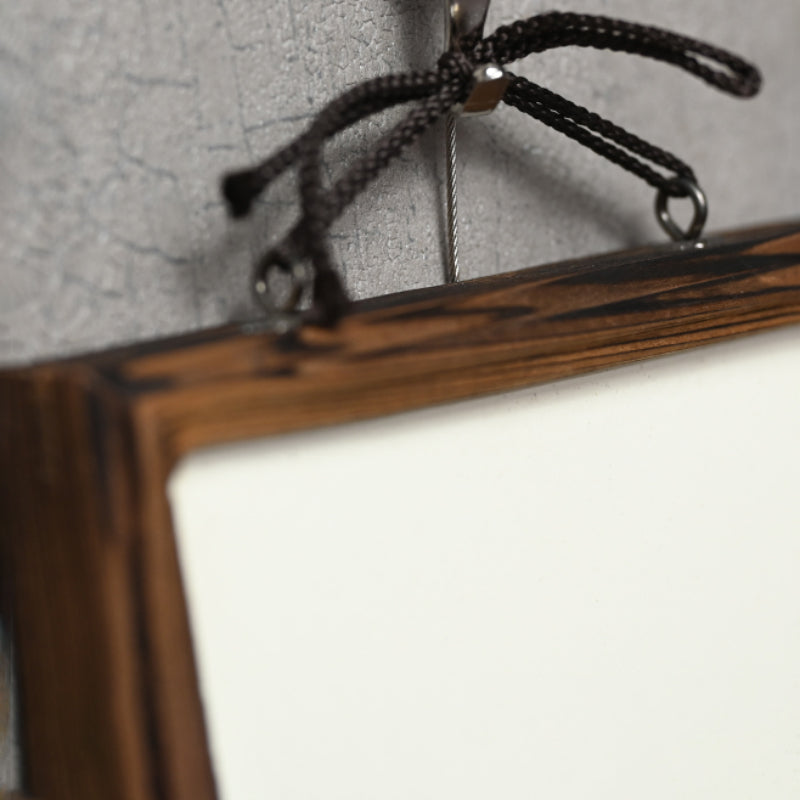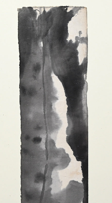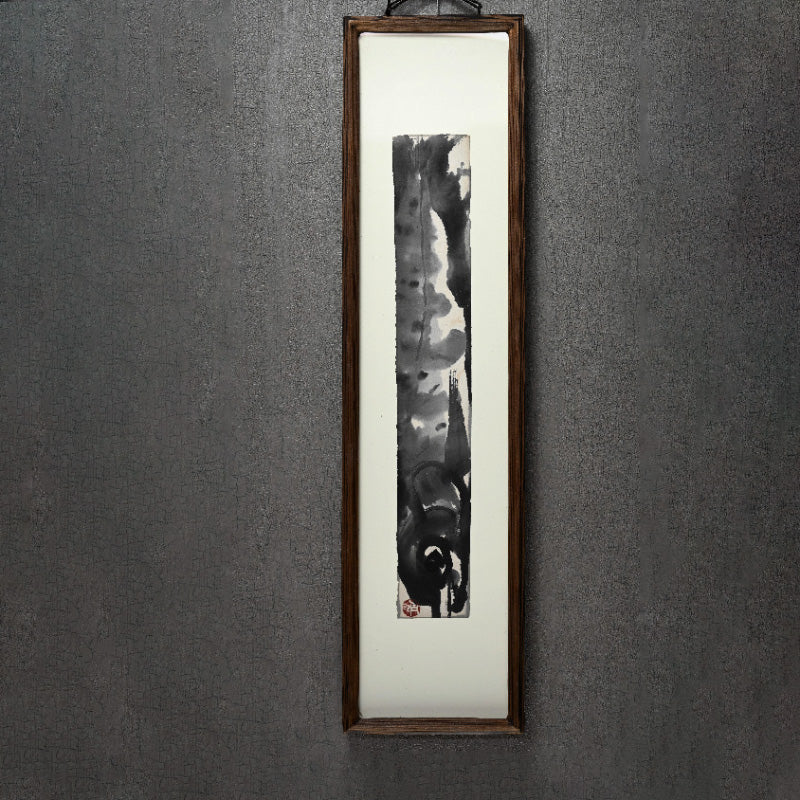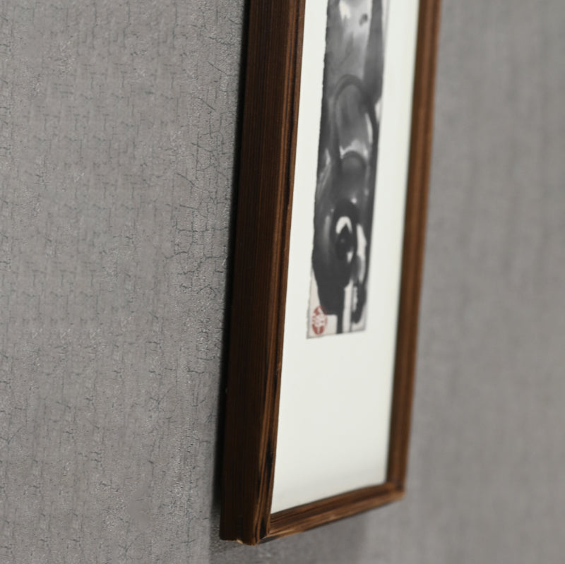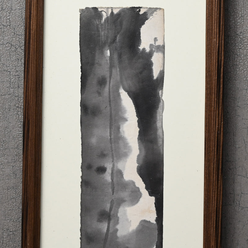 This strip of hand-made washi paper is dominated fully by the image of a salted and skewered sweet fish (Yamame) prepared for grilling in the traditional way, along the irori fireplace. Ink on paper mounted in a burnt cedar frame. The image is 37 x 6 cm (14-1/2 x 2-1//2 inches). The frame is 55 x 14 x 2.4 cm (22 x 5-1/2 x 1 inches) and it is in excellent condition.