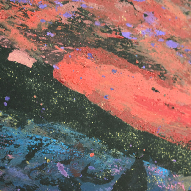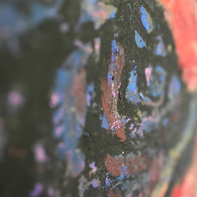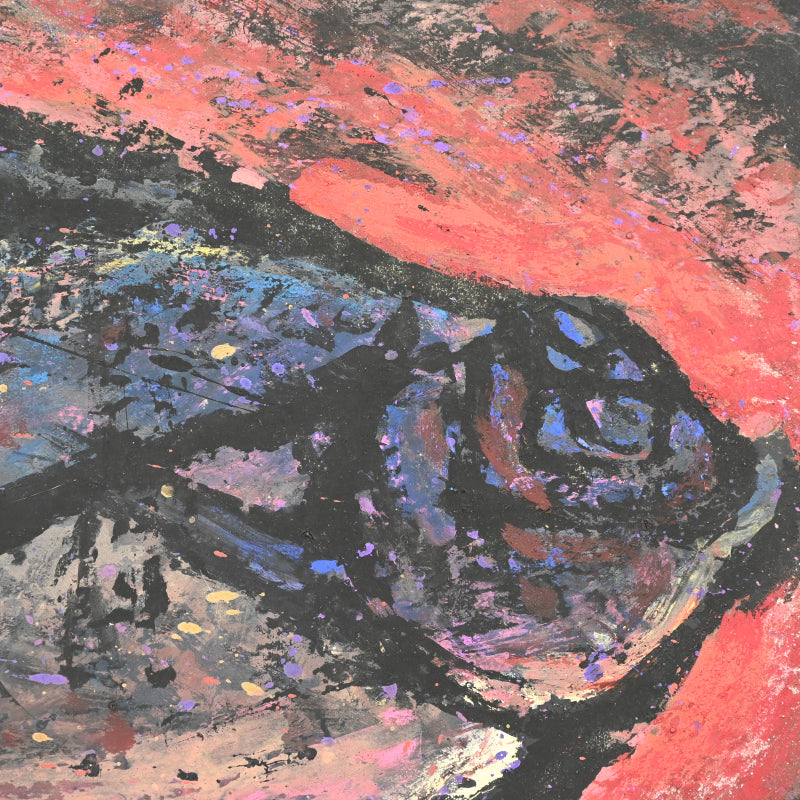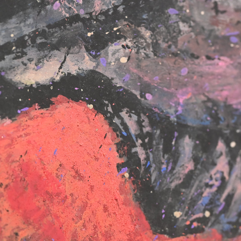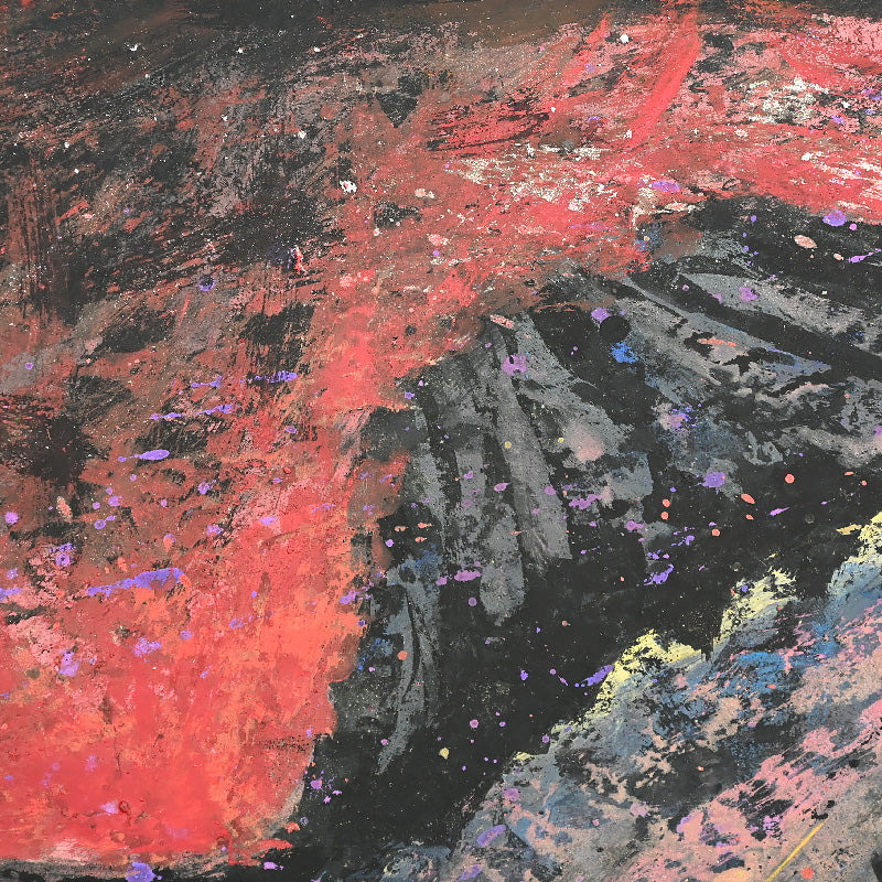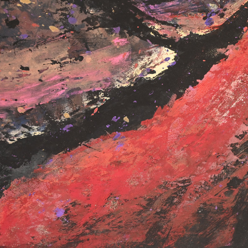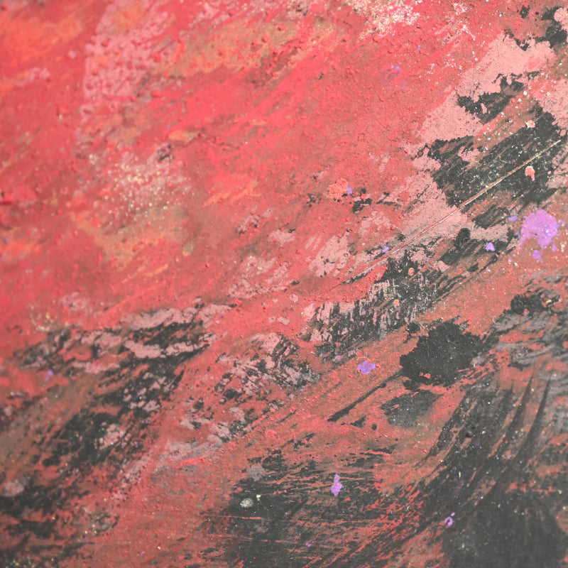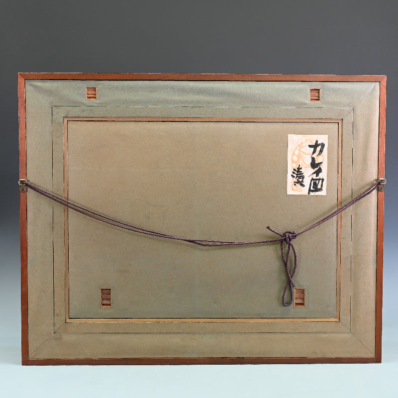 Red and black dominate this work by Nomura Seiroku mounted in the original period wooden frame. Although this looks similar to oil painting, it is in fact mineral pigment on paper mounted on a panel in the traditional Nihonga style. The painting itself is 33.5×45.5 cm (13-1/4 x 18 inches), with the frame it is 49.5×61.5×4.5,cm (19-1/2 x 24 x 2 inches) and is in overall excellent condtion, with some insignificant chips on the edges of the frame.