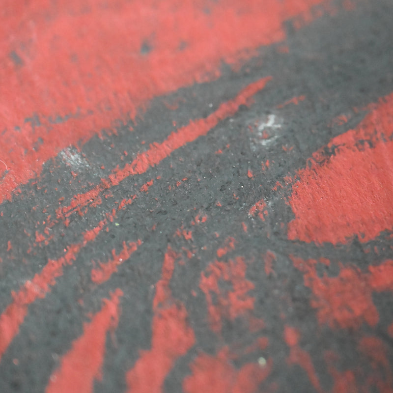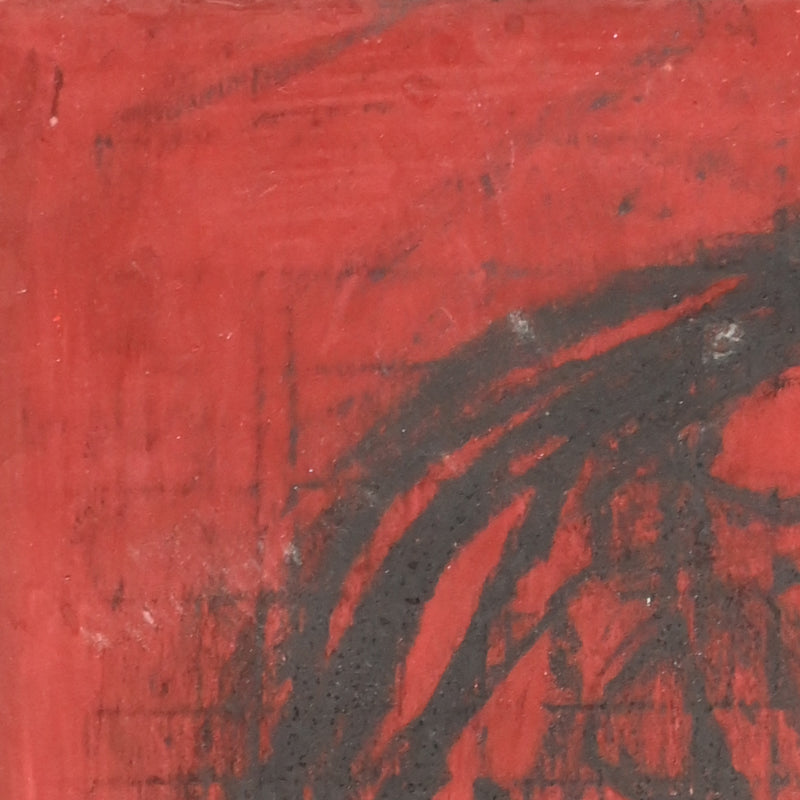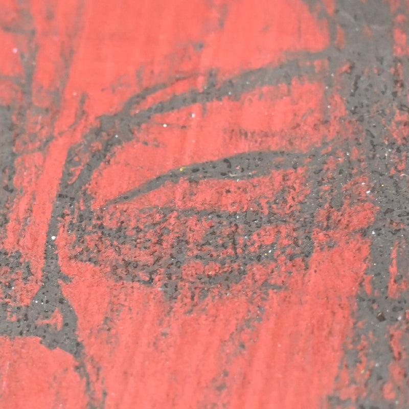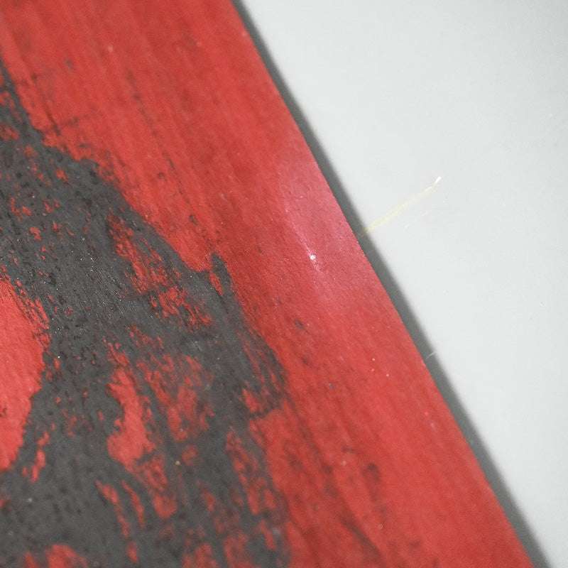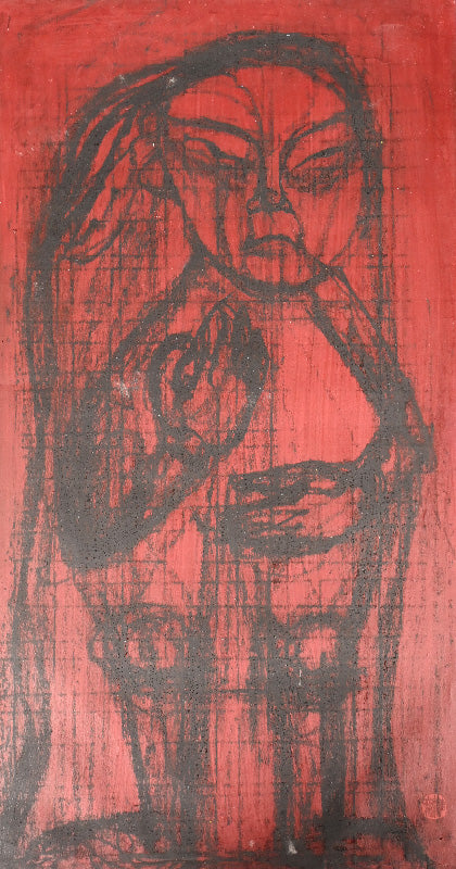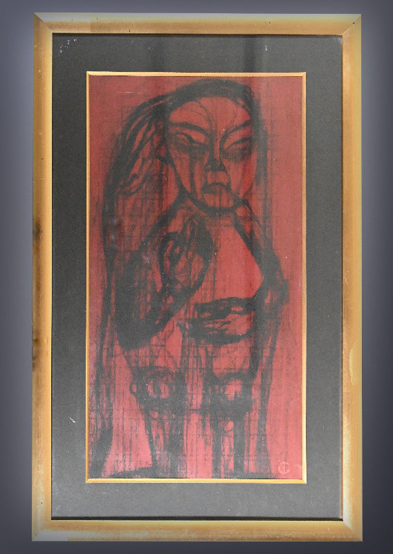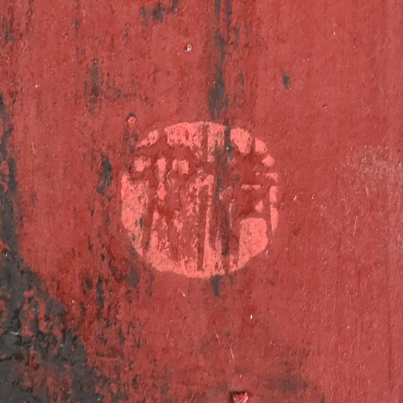 Mineral pigment on paper mounted in wooden frame, and border matting A frightful image of a stout female figure on red by Nomura Seiroku, performed with mineral pigment on paper mounted in a gold gilded wood frame with black mat. The frame size is 78 × 52 × 2.5 cm (30-3/4 x 20-1/2 x 1 inches), the painted image is: 33 x 59 cm (13 x 23-1/2inches) and is in excellent condition, there are scratches and losses to the gilding on the frame.
