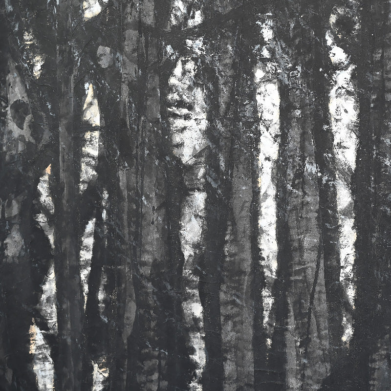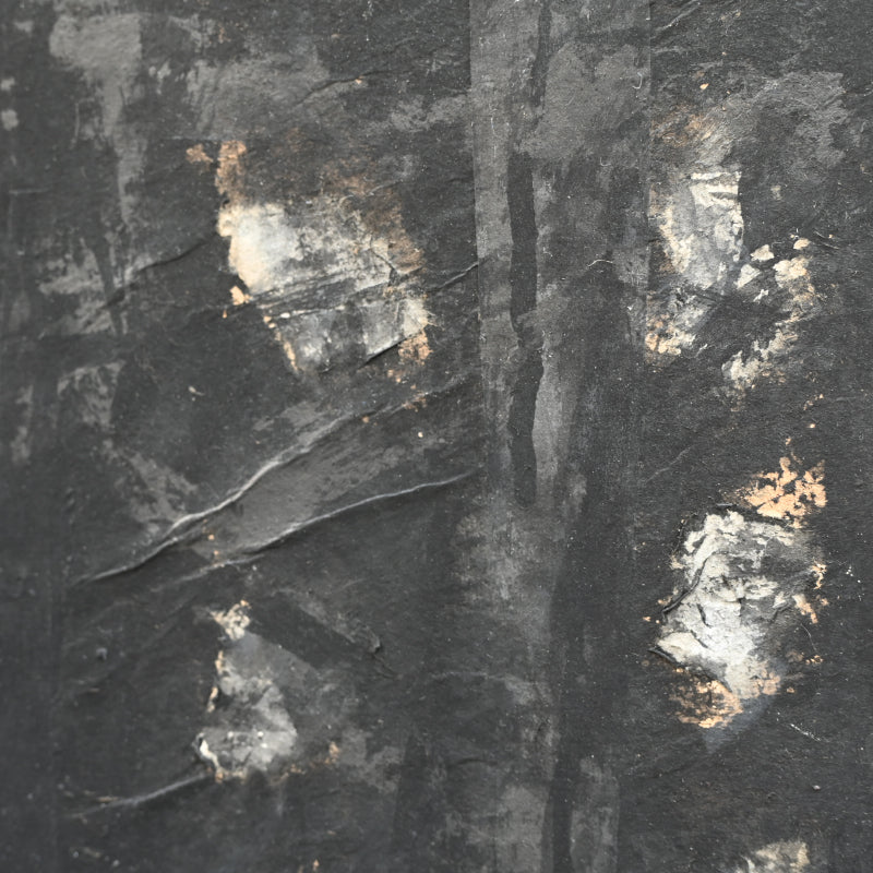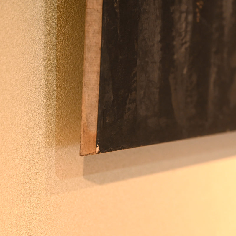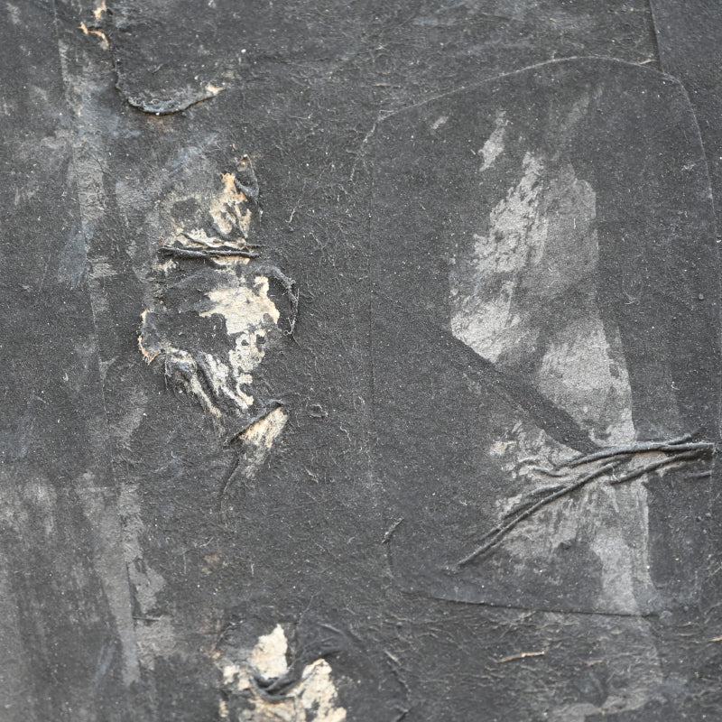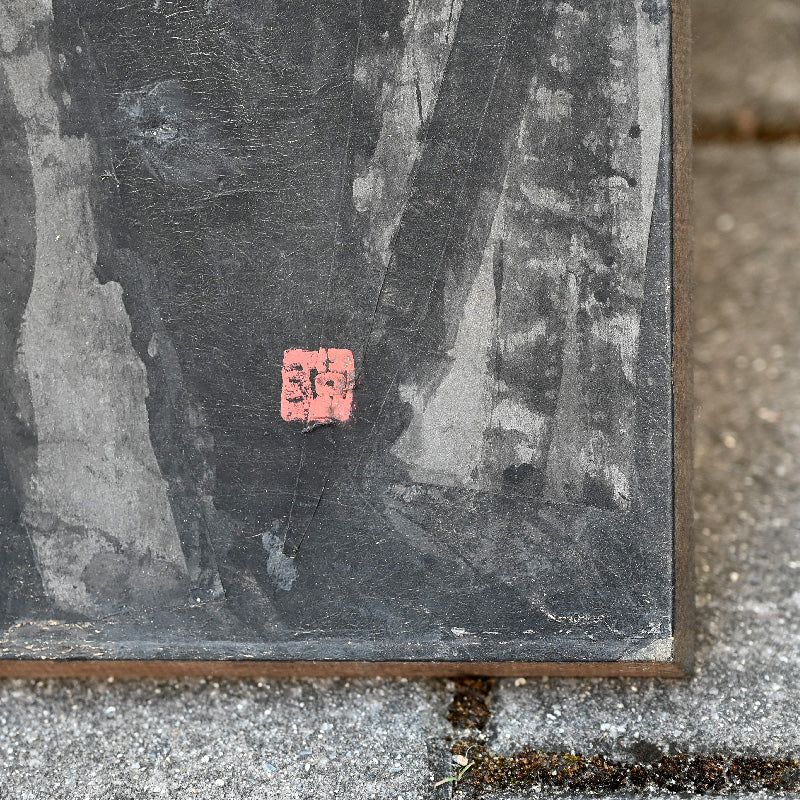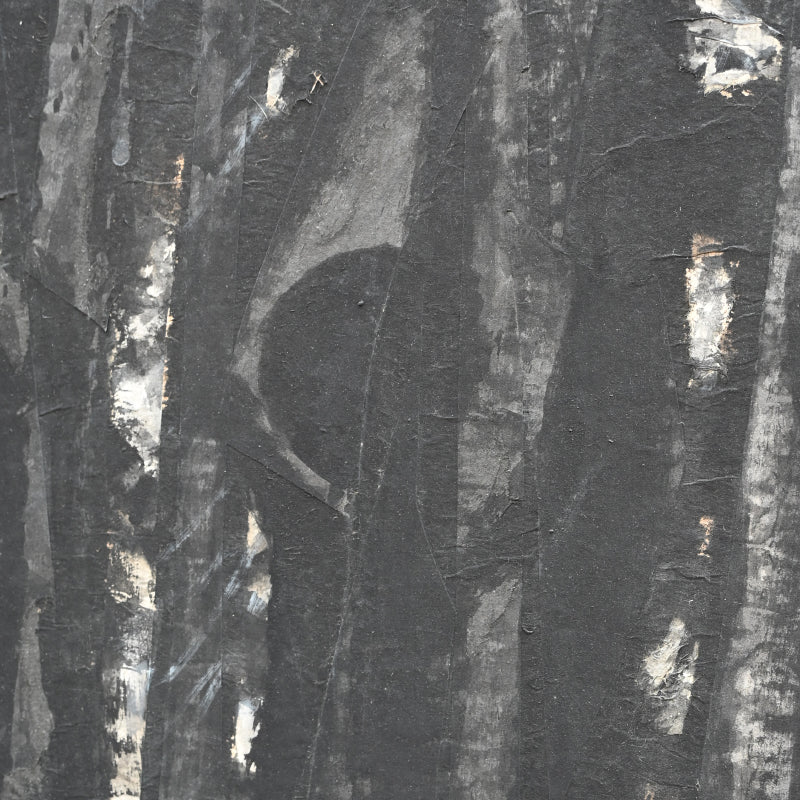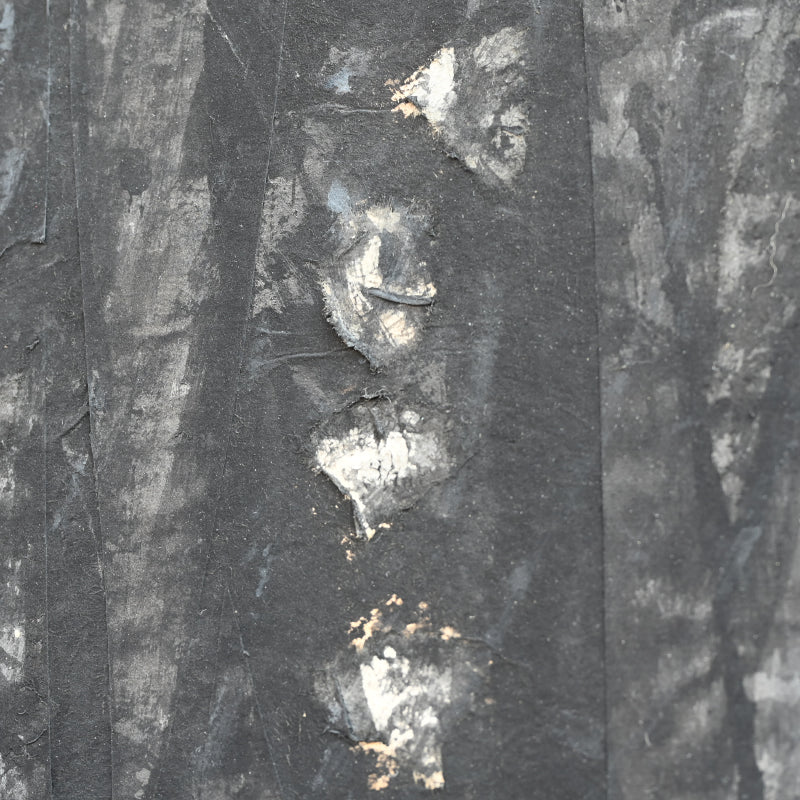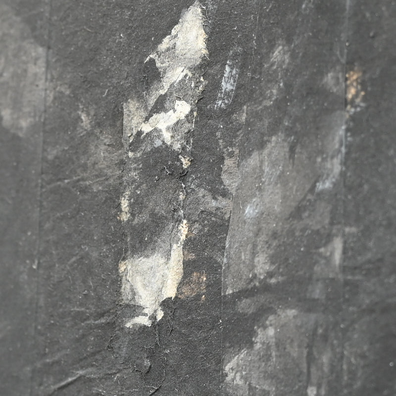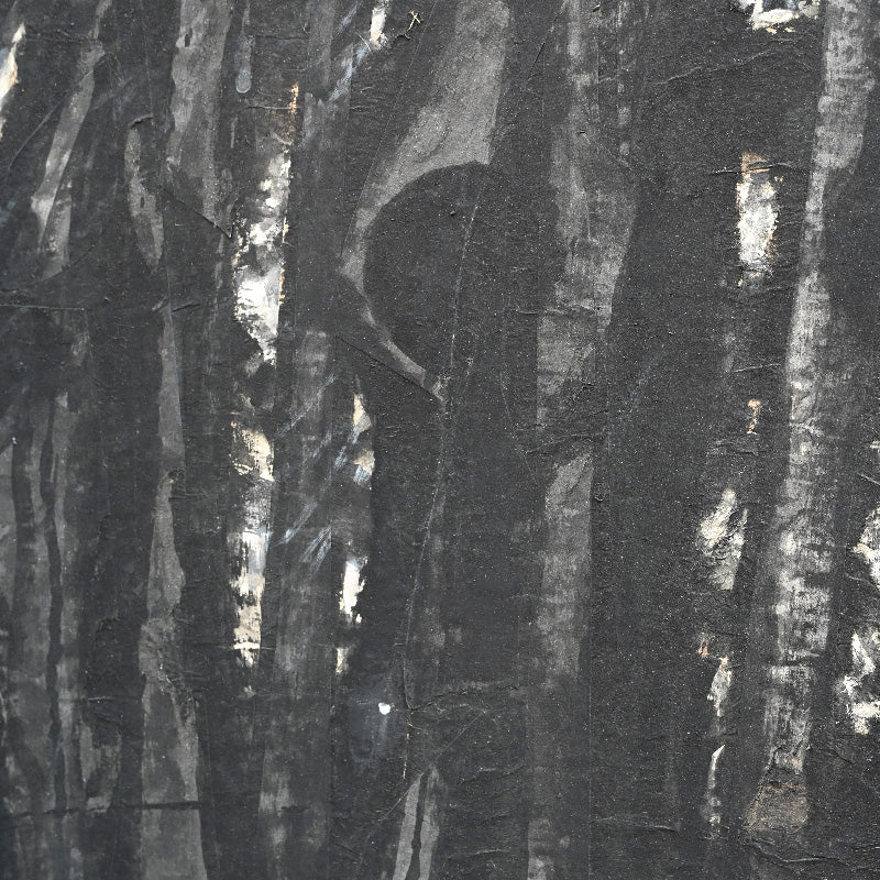 Torn paper is layered to form the canvas for this unusual ink painting by master of the genre Nomura Seiroku titled Mori Kara (From the forest) published in the Museum catalog Nomura Seiroku by the Yamanashi Prefectural Museum of Art (2000, Figure 21 page 115). According to the Museum it was painted in 1971. Here Seiroku has applied vertically torn strips of paper then applied dark vertical strokes of ink, intimiating not just through the color the image of the forest, but also via the texture of the paper canvas itself. It is 215 x 70.5 x 1.5 cm (84-1/2 x 27-3/4 inches) mounted on a wood framed panel in excellent condition.