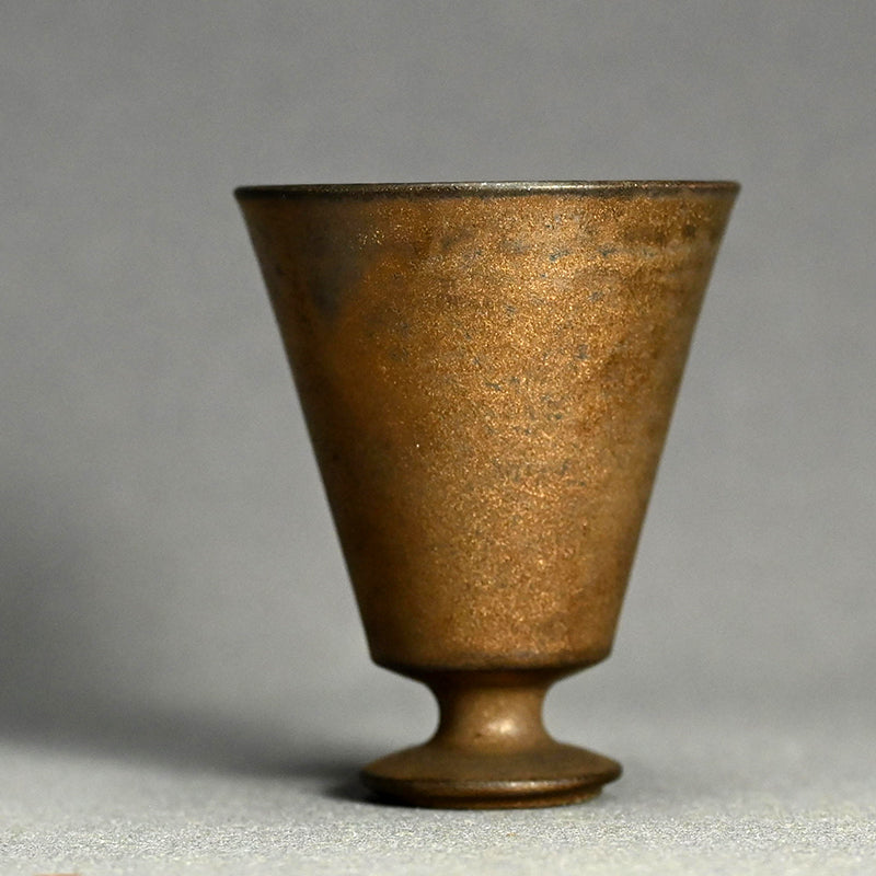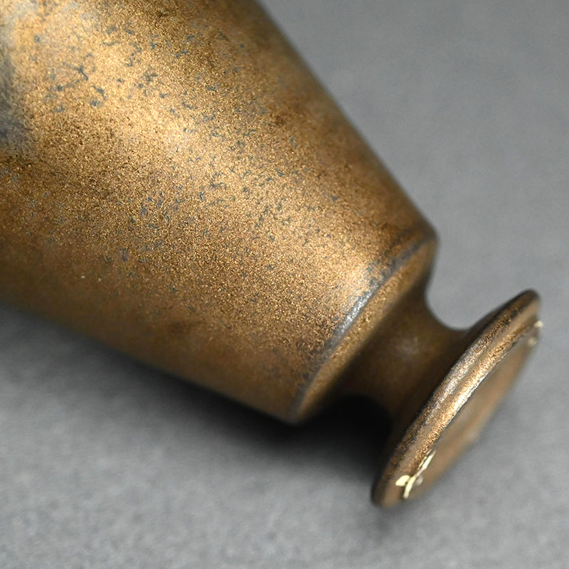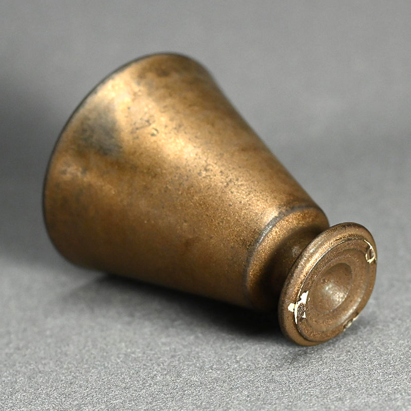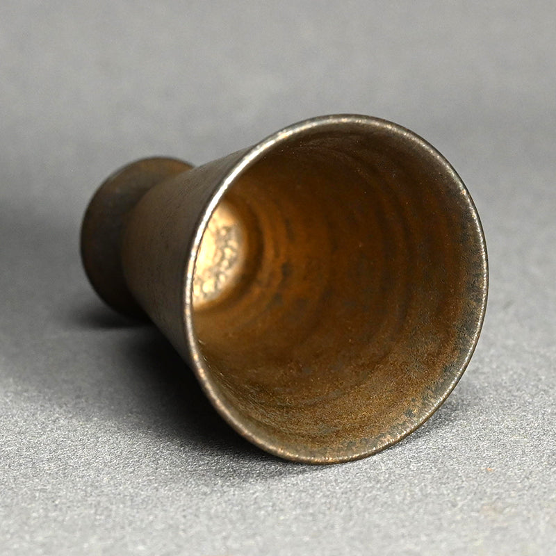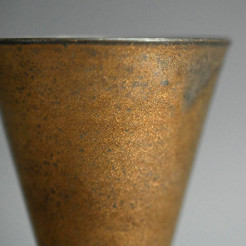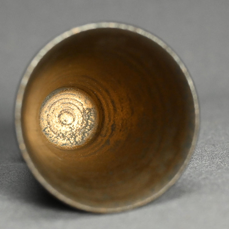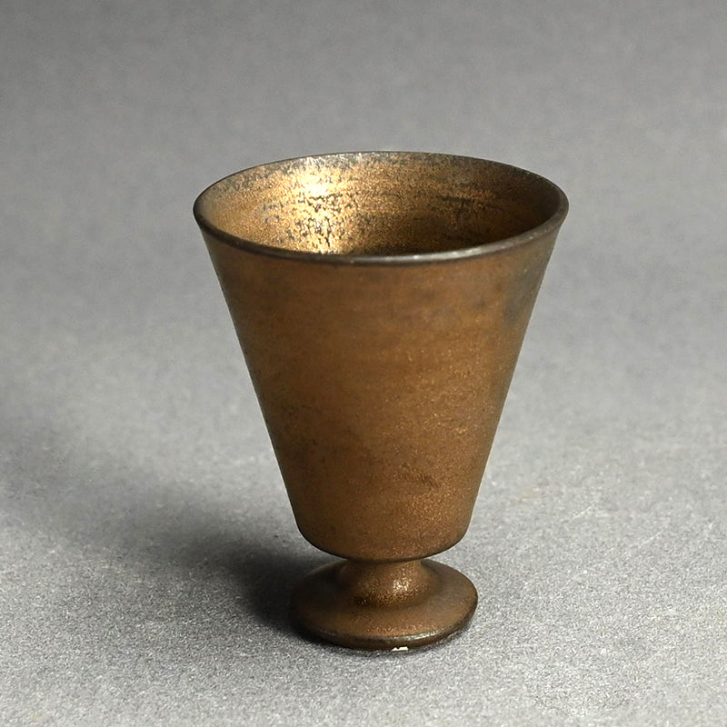 Light gathers softly within this elegant guinomi, its warm gold surface recalling the mellow glow of aged bronze, by Matsushita Hiroki, enclosed in the original signed wooden box titled “Fugen Gold Guinomi.” The gently tapering form rises from a small pedestal foot, its thinly thrown walls revealing delicate turning marks inside the vessel that catch and reflect light across the metallic interior. Part of the artist’s Fugen series, the work reflects Matsushita’s exploration of extremely thin ceramic bodies finished with restrained metallic patinas that evoke ancient metal while preserving the quiet warmth of clay. 6.6 cm (2-1/2 inches) in diameter and 8.1 cm (3-1/4 inches) tall, it is in excellent condition and was acquired directly from the artist before his passing.