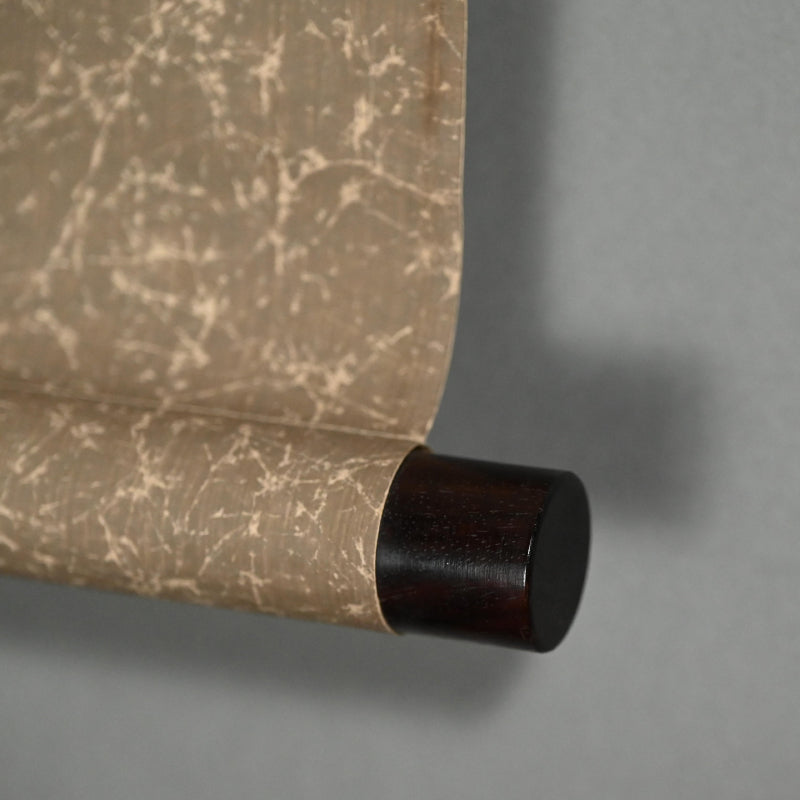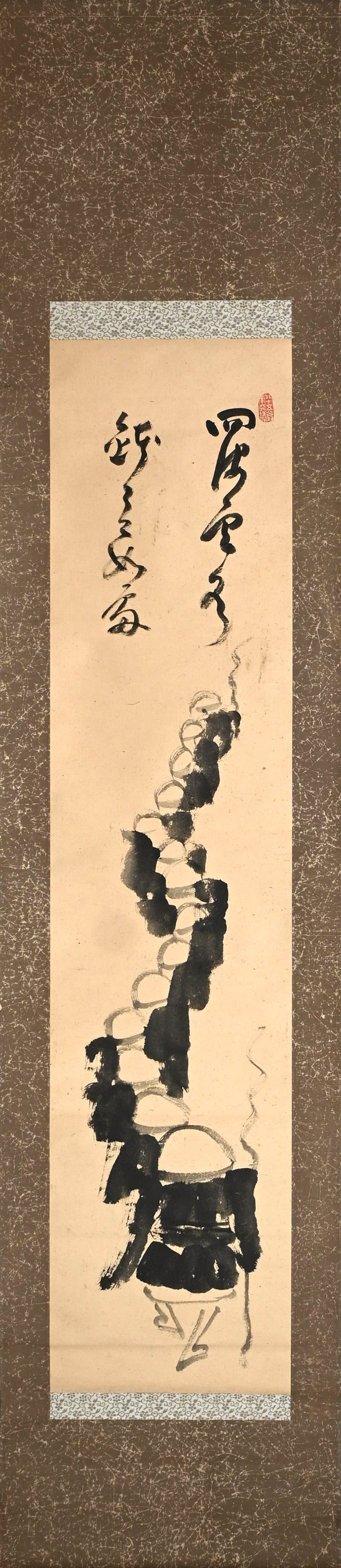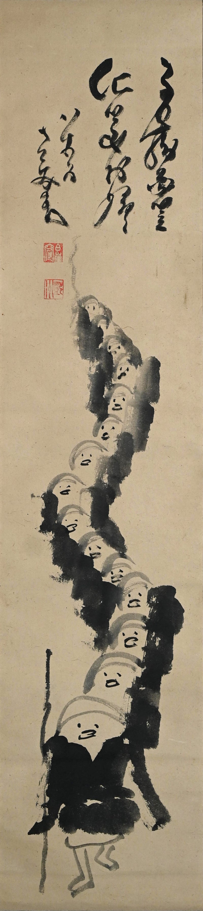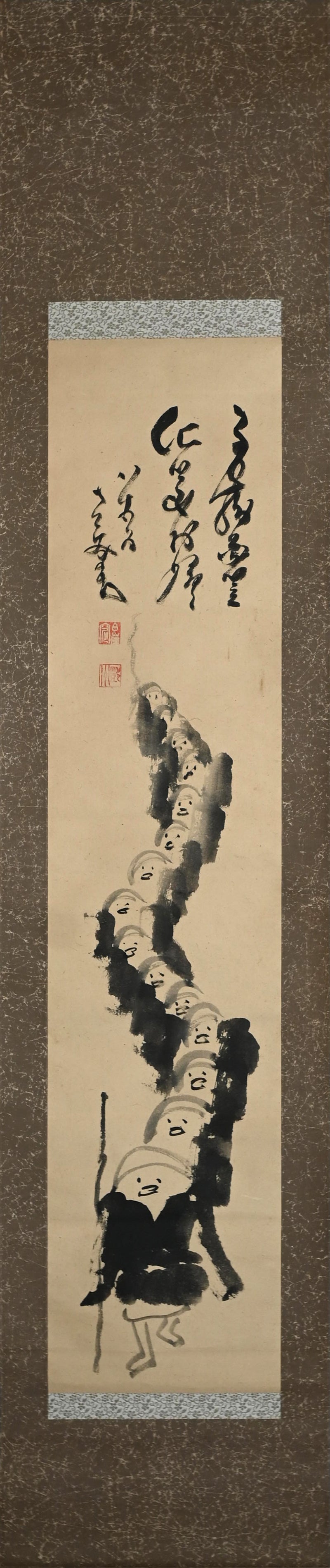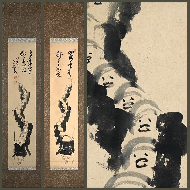 A pair of scrolls featuring monks coming and going on begging rounds by Nakahara Nantenbo. Ink no paper bordered in momigami paper with wood rollers.  Each scroll is 40.8 x 187.5 cm (16 x 74 inches) and are in fine condition.