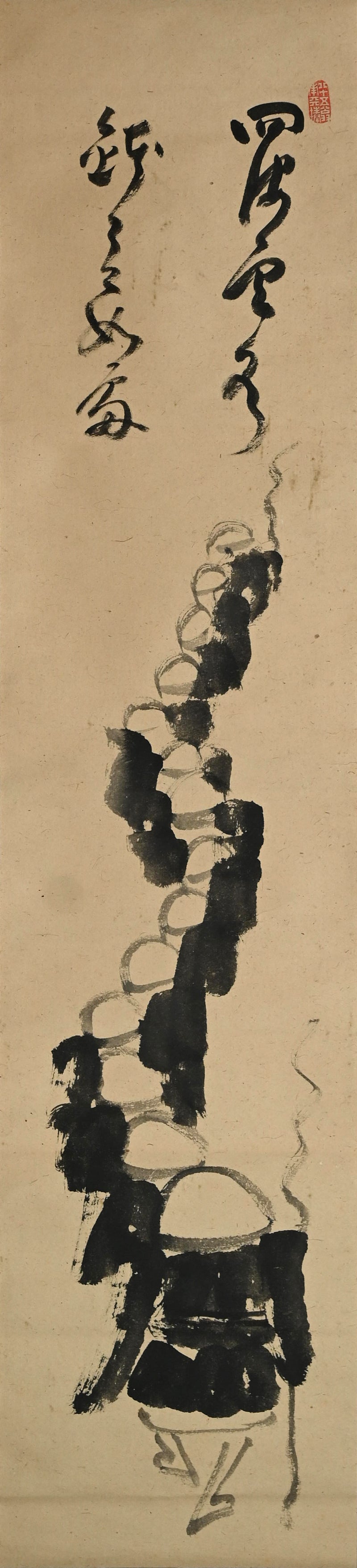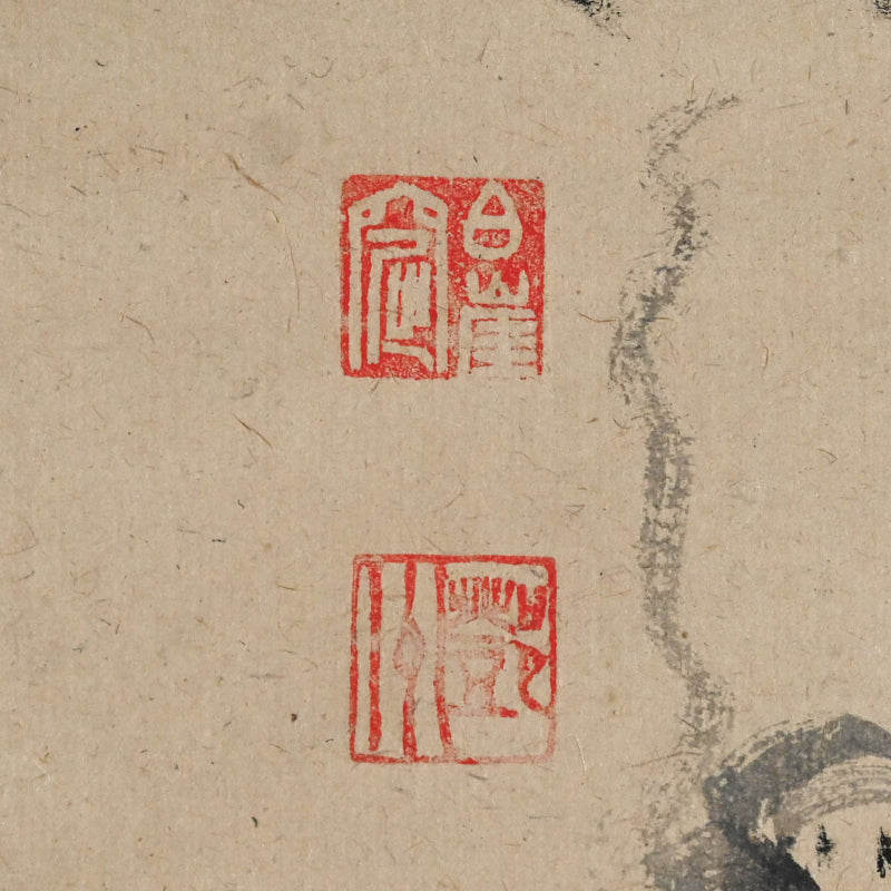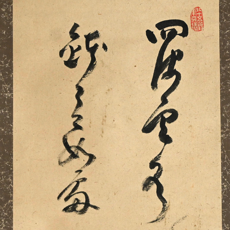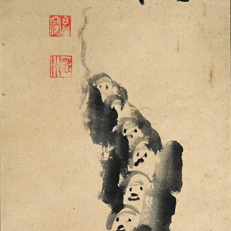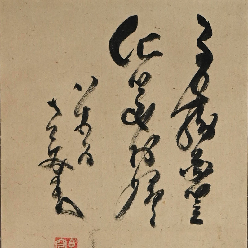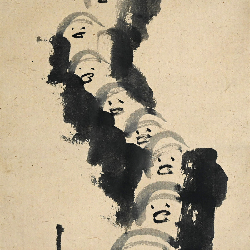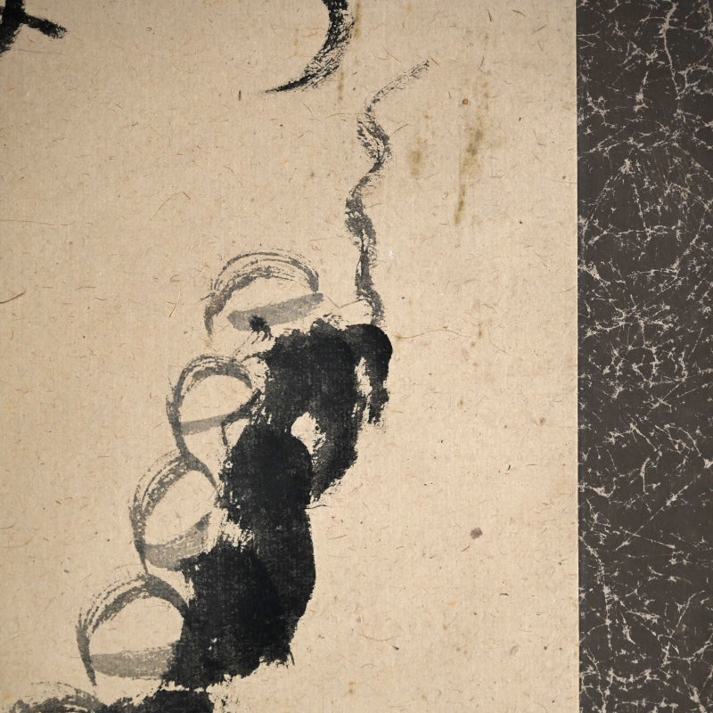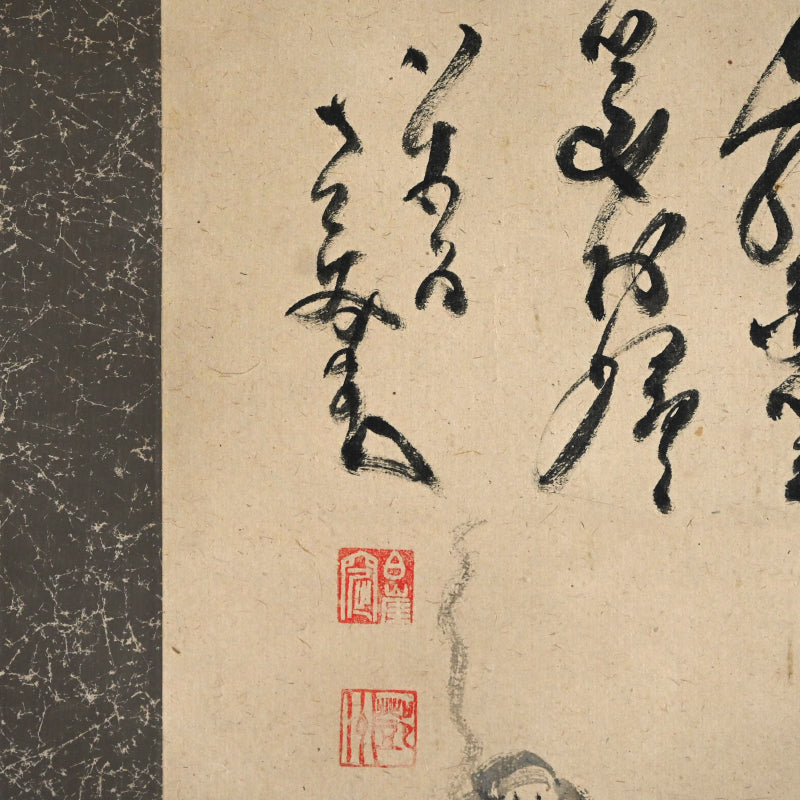 Nakahara Nantenbo, (Toju Zenchu), did not start painting in earnest until he was already more than 65 years old. Despite this relatively advanced age he was one of the most productive and important Zenga artists in the Meiji/Taisho era and without a doubt the best-known 20th century Zen painter in the West.   He derived his name Nantenbo from his bo (staff) cut from a 200-year-old Nanten tree. He used it to instruct his students and was a favorite illustration in his well known adage "To he who answers a strike of the Nanten; To he who refrains a strike of the Nanten".  Born Keisuke to the Shioda samurai family in Karatsu, Saga Prefecture in North-West Kyushu, he resolved to become a monk at the age of 7.  At the age of 11 he began his training in the Yuko-ji temple in Hirado where he received the name Nakahara Toju. Six years later he traveled to Kyoto to receive training at Empukuji temple. Most of his mature life he spent traveling and teaching. After meeting Yamaoka Tesshu (1836-1888) in 1885 they established a Zen training center at the Dorin-ji temple. Both men greatly influenced each other. He became abbot of Zuigan-ji, Matsushima in 1891 and in 1902 abbot of Bairin-ji and Kaisei-ji. In 1908 he was named the 586th kancho (Chief Abbot) of Myoshin-ji, but spent the remainder of his life at Kaisei-ji.  Much admonished in his lifetime for his firebrand ways and infamous for angering superiors, his reputation and charisma did much to promote the revival of Zen in the early 20th century.  For more information on this important Zen Master, see the art of 20th Century Zen by Stephen Addis and Audrey Yoshiko Seo.