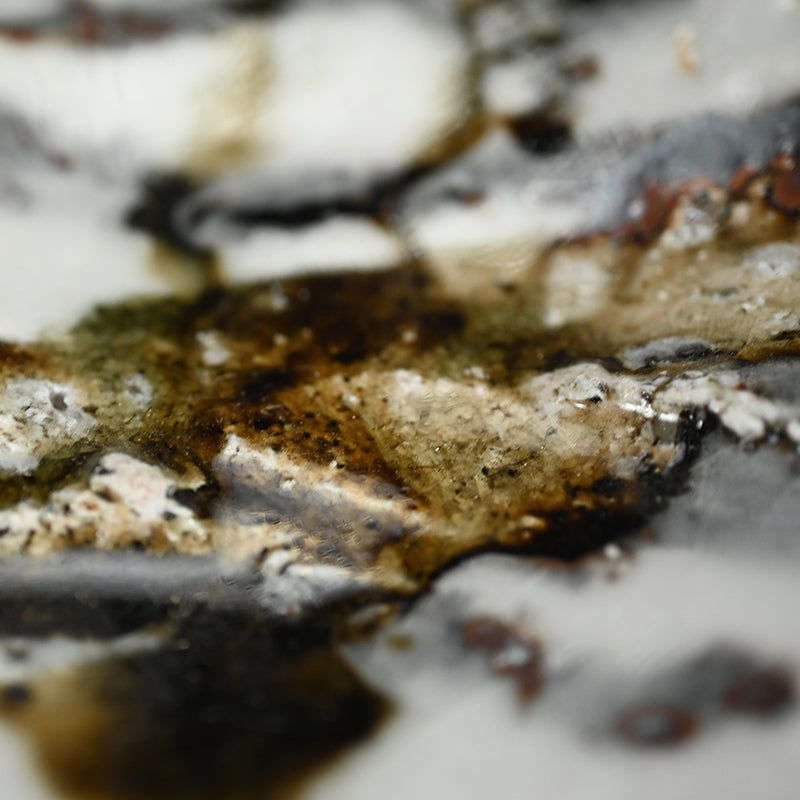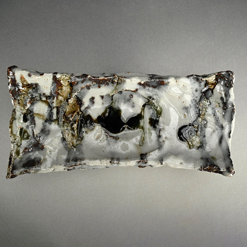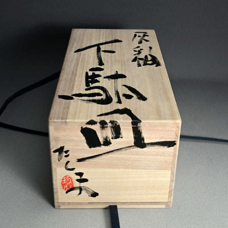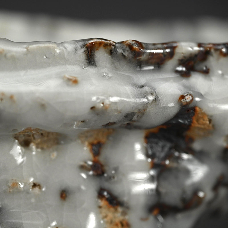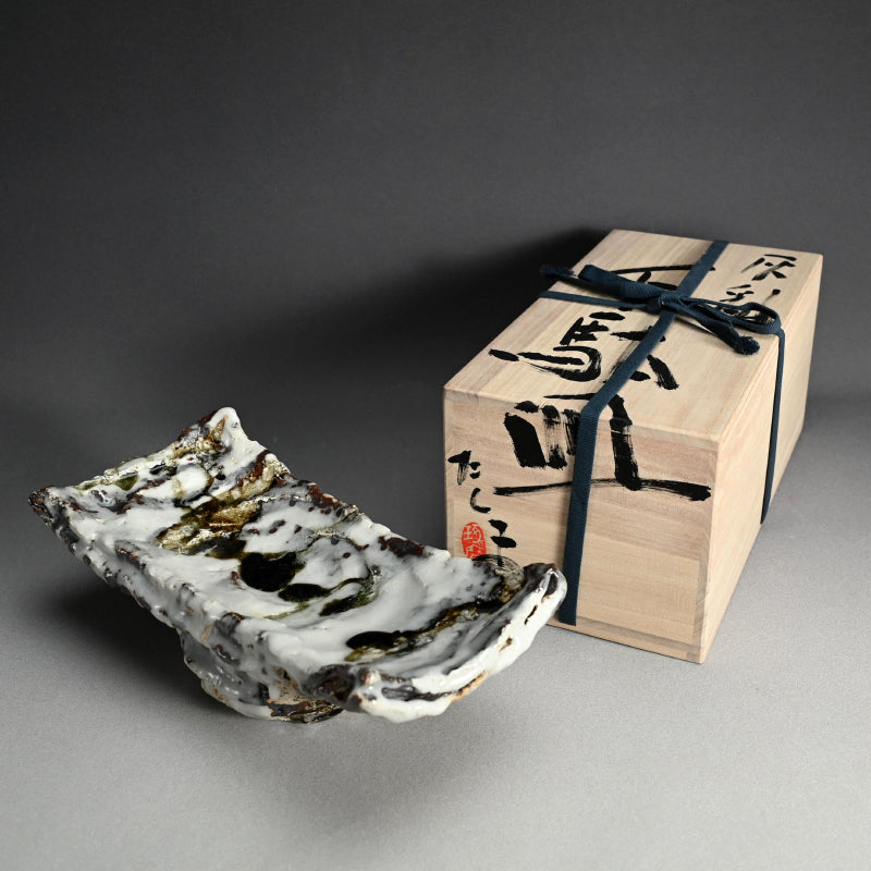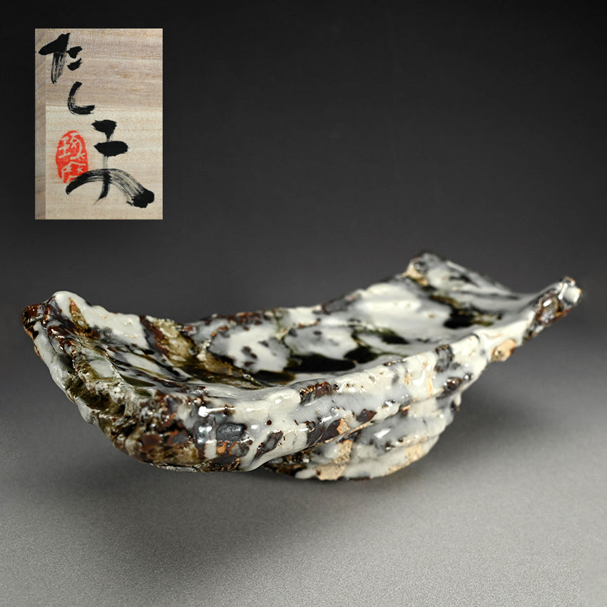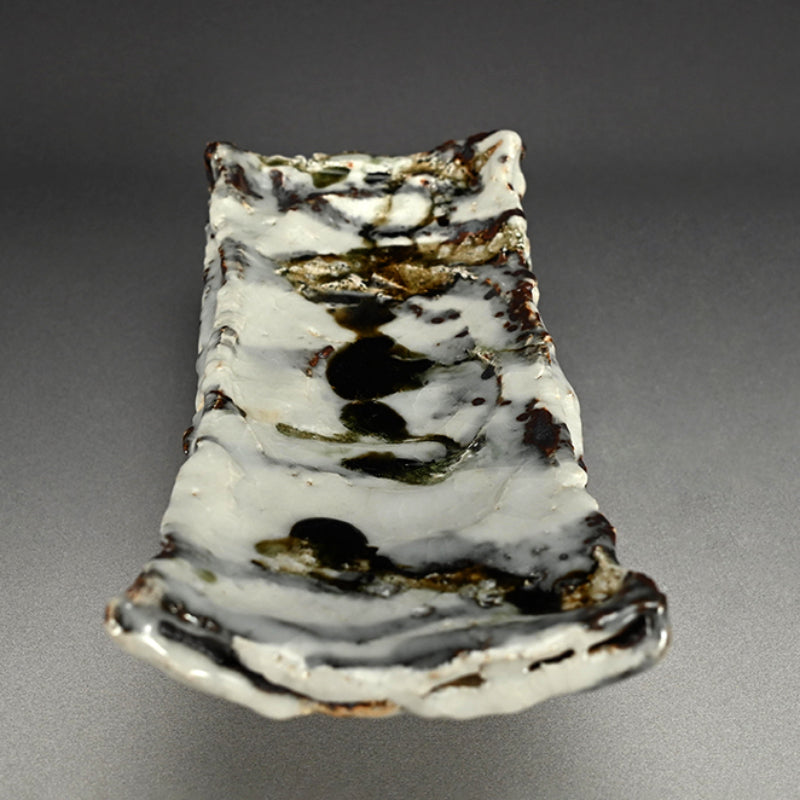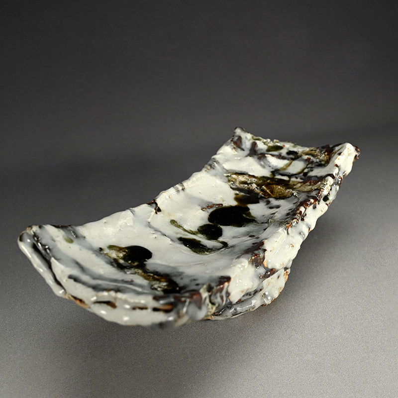 One of his most popular new forms, a large arching elevated dish by Murakoshi Takuma covered in white over shadows of iron with areas of crystaline green revealing the clay beneath. It comes enclosed in the original signed wooden box titled Haiyu Geta-zara. It is called a Geta-zara, named after the traditional elevated wooden sandals worn in Japan in previous eras. Quite large it is 36.5 x 17 x 12.5 cm (14-1/2 x 7 x 5 inches) in perfect condition, directly from the artist.