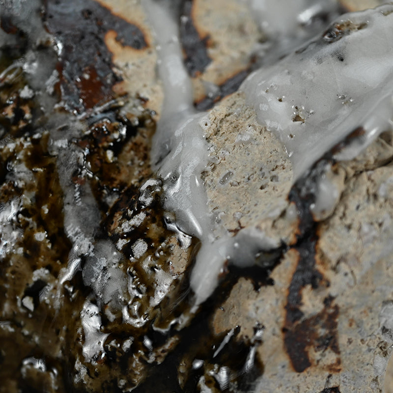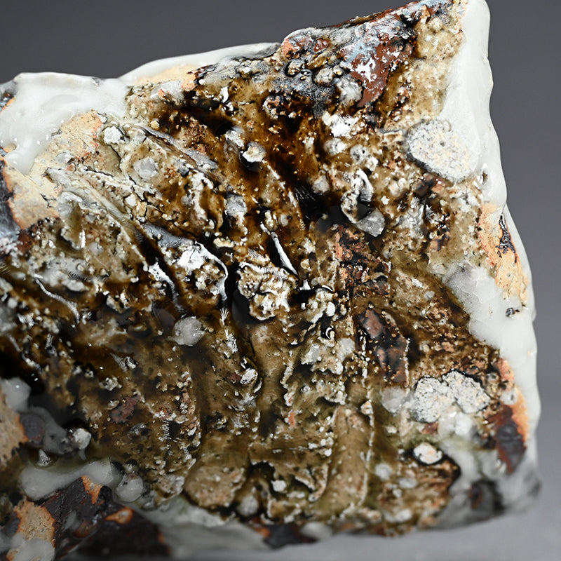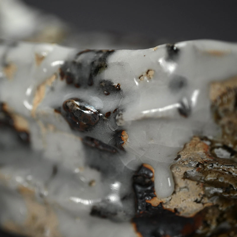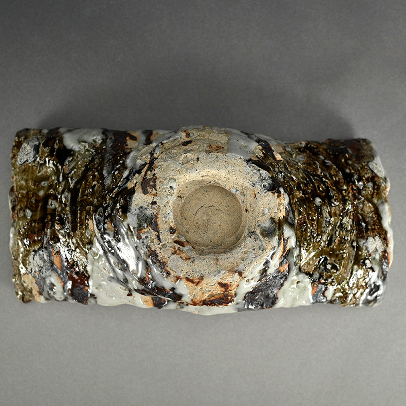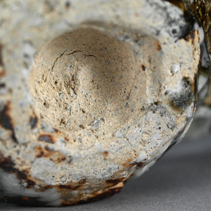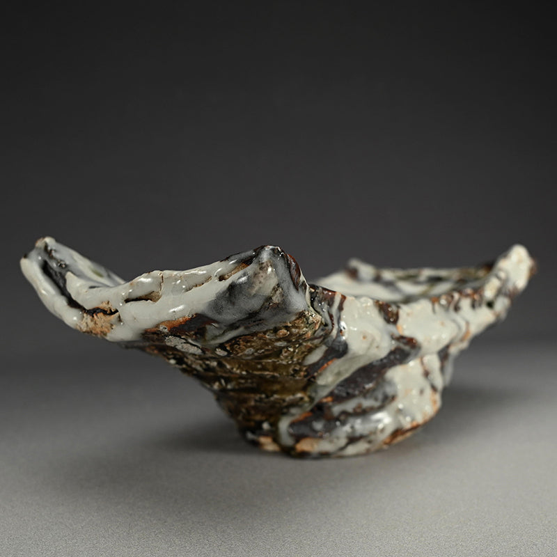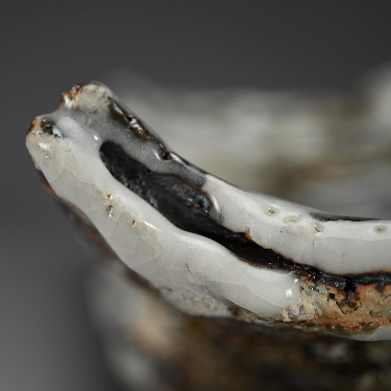 Murakoshi Takuma is one of those enigmas who simply lives to work with clay. He does not seek to make a living through pottery, but through his primal approach has earned a following which keeps his work in high demand. He was born in Aichi prefecture in 1954 and began his stroll down the pottery path in 1980 under the tutelage of Kyoto potter Umehara Takehira. Favoring very rough Shigaraki glaze, he established his own kiln in 1997 in the Kiyomizu pottery district of Kyoto, then moved to Nagaoka in 2002. Although eschewing the world of competitive exhibitions, he has been picked up by many of Japan’s preeminent galleries, including private exhibitions at the prestigious Kuroda Toen of Tokyo’s Ginza District.
