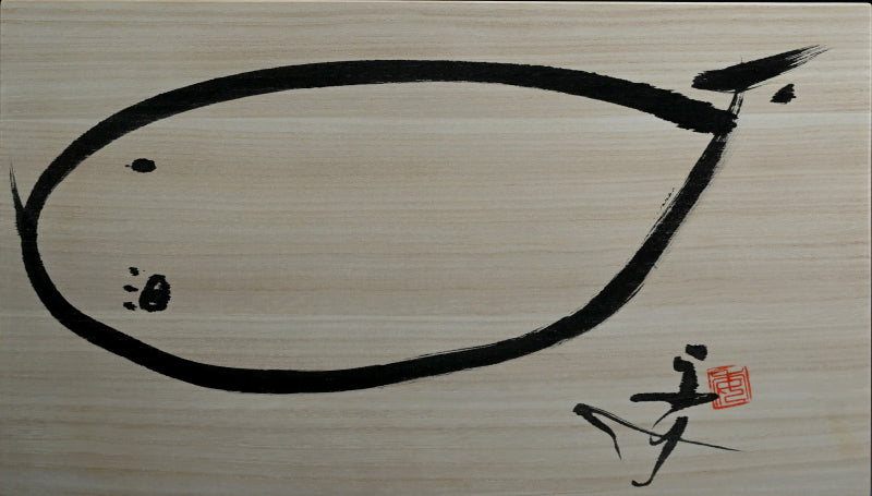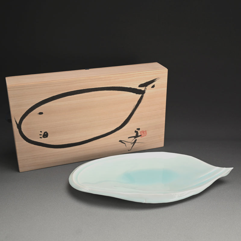 A large tear drop shaped slab of sheer white porcelain covered in trasnsparent green by Kato Tsubusa enclosed in the original signed wooden box decorated with an image of the work. It is 50 x 27.5 x 5 cm (19-1/2 x 11 x 2 inches) and is in excellent condition, directly from the artist this summer.