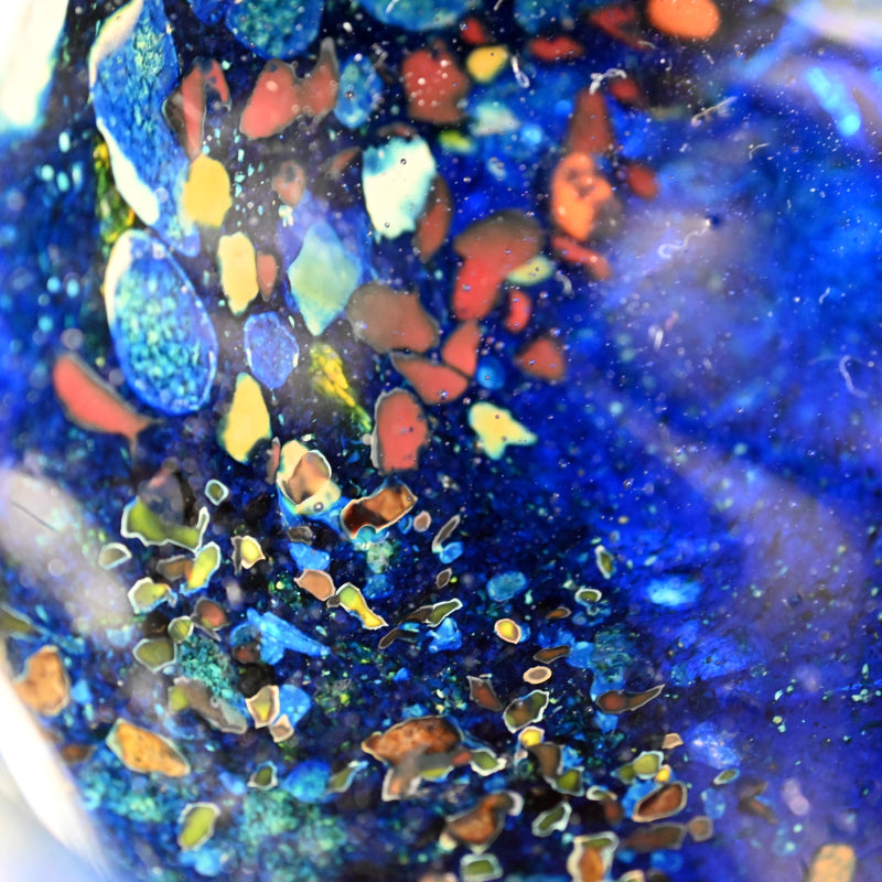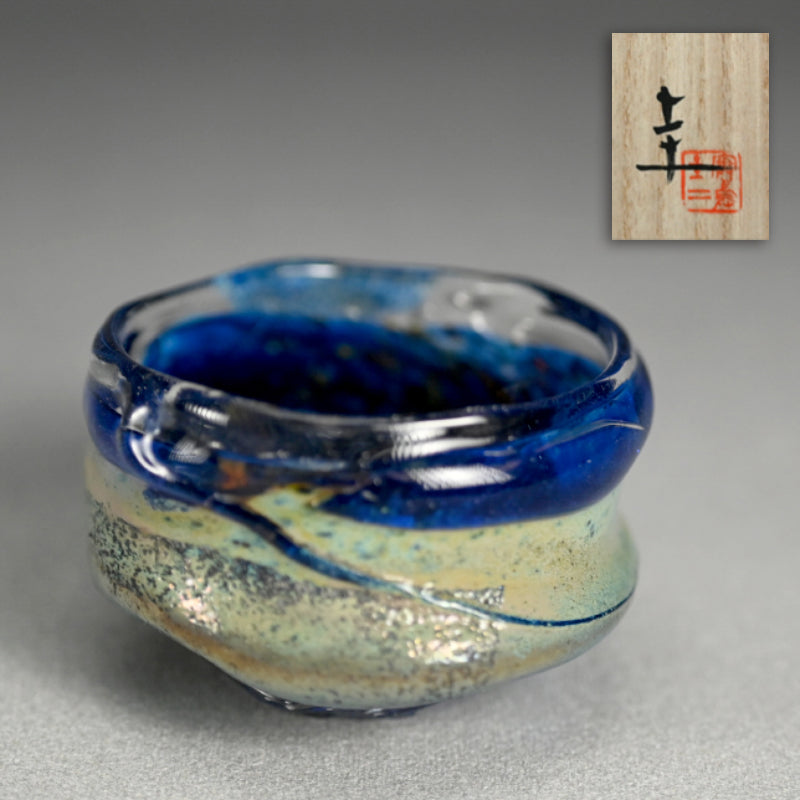 A blown glass sake cup by Okushima Keiji enclosed in the original signed wooden box titled Hari-hai. It is 7 cm (roughly 3 inches) diameter and in excellent condition, directly from the aritist.