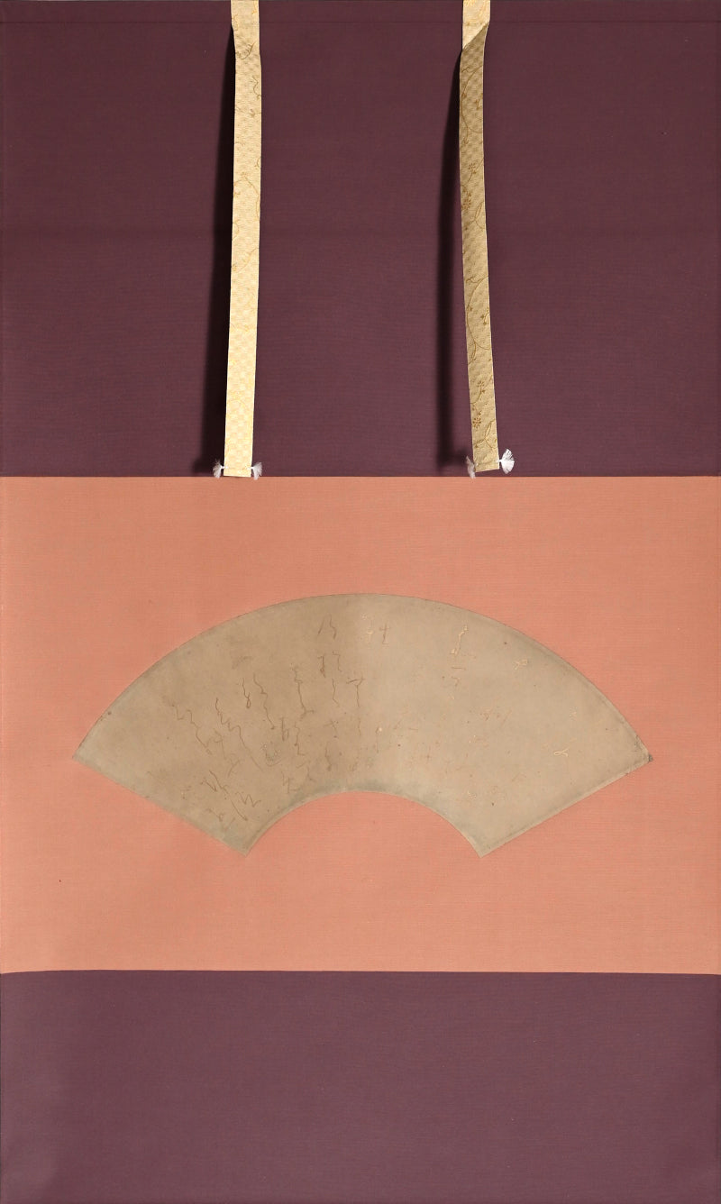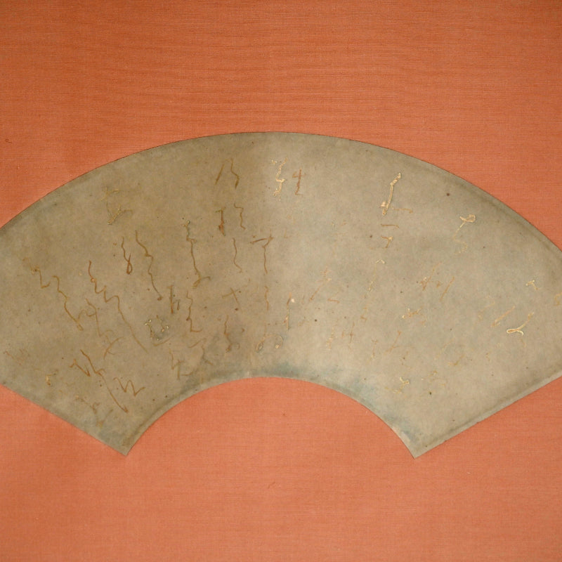 A fan shape covered in golden grass like calligraphy by the tragic Buddhist Nun Oishi Junkyo enclosed in a fine kiri-wood box. The pale paper is covered in flowing gold calligraphy, mounted on fine heavy cloth ending with lacquered wooden rollers. The scroll is 64.7 x 112 cm (25-1/2 x 44 inches) and is in excellent condition.