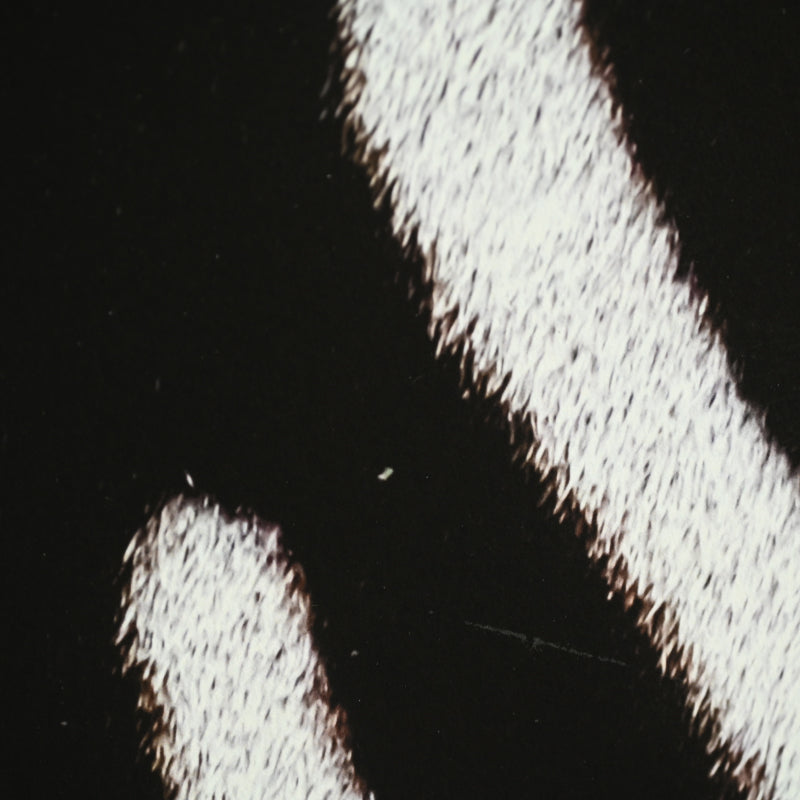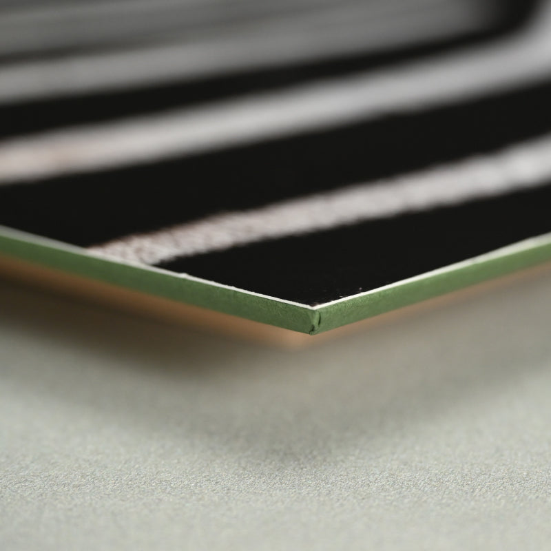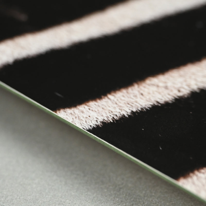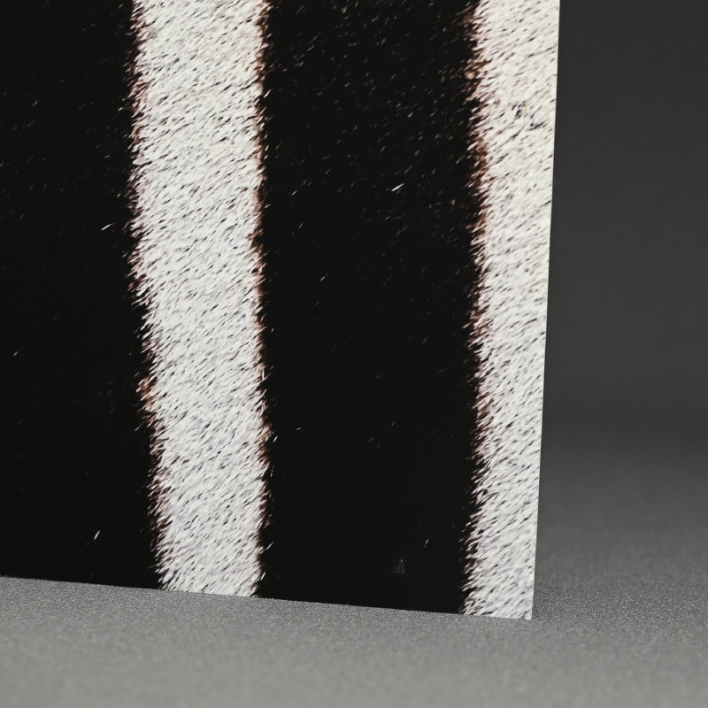 An extreme photograph of Zebra stripes mounted as a hanging panel by Horitani Shoichi signed on back and numbered 1/15. It is 55 x 36.5 x 3 cm (22 x 14-1/2 x 1 inches) and is in perfect condition, mounted on a wooden panel elevated from the wall.
