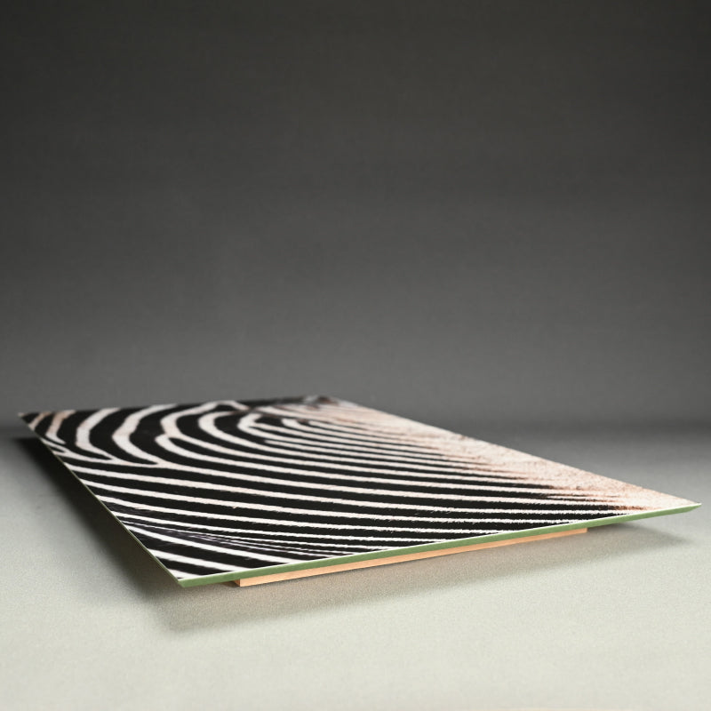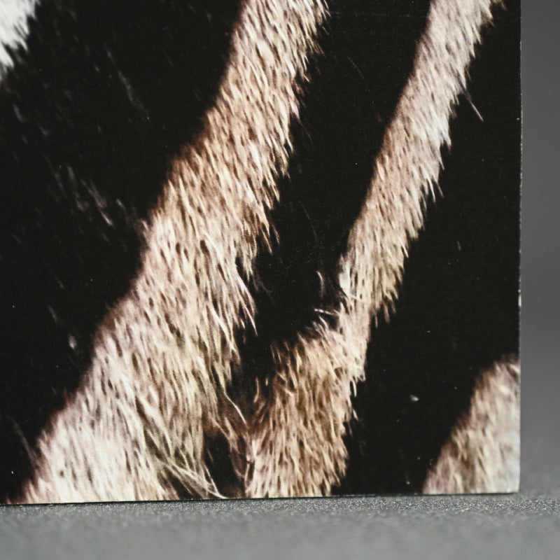 A close up of the striped skin of a Zebra mounted as a hanging panel by Horitani Shoichi signed on back and numbered 1/15. It is 36.5 x 54.5 x 3 cm (14-1/2 x 21-1/2 x 1 inches) and is in perfect condition, mounted on a wooden panel elevated from the wall.