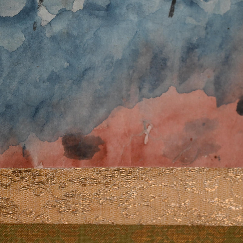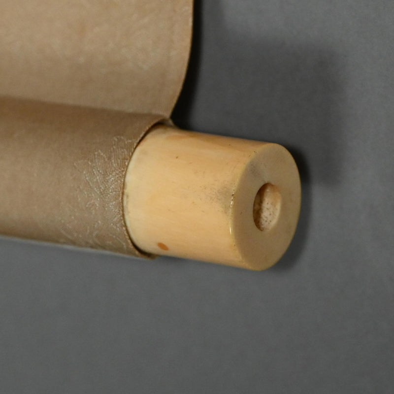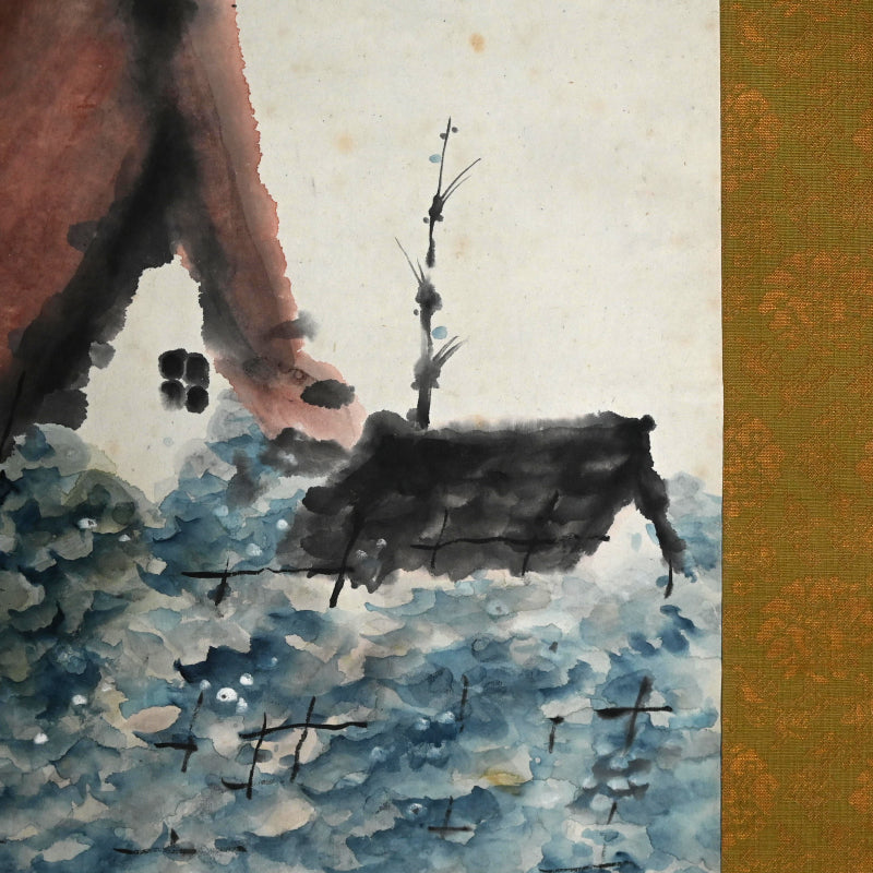 A thatched farmhouse stands guarded behind a wall of green leaves, perhaps grapes or are they morning glories? Pigment on paper in a green patterned silk border extended with beige and featuring ivory rollers (These will be changed for export) enclosed in the original signed wooden box (modified as it appears to have originally framed) and dated 1922. It is 46 x 132 cm (18-1/2 x 52 inches) and is in overall fine condition, with some pale age spots in the border material.