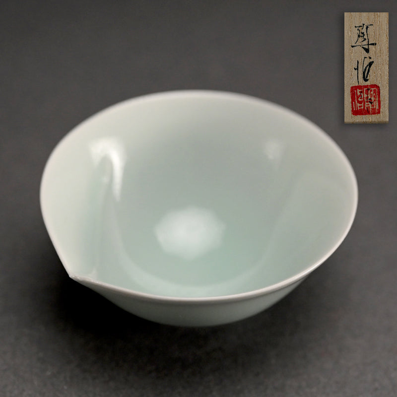 An exquisite inverted cone-shaped celadon sake cup supported by a tiny ring foot by Fukami Sueharu enclosed in the original signed wooden box titled Seihakuji Guinomi. It is 7.5 cm (3 inches), 3.5 cm (1-12 inches) tall and in perfect condition.