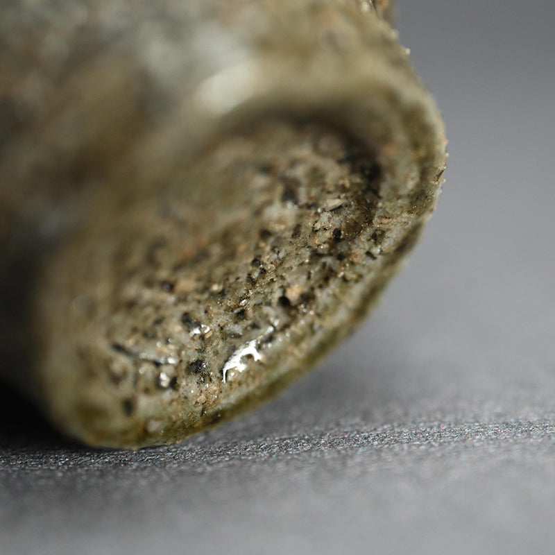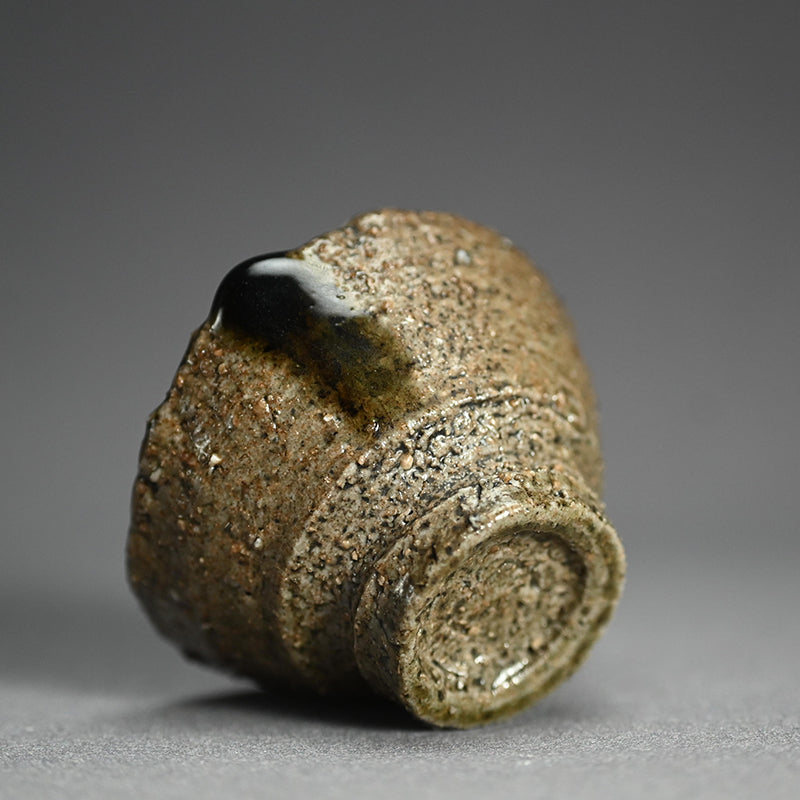 A thick bead of auburn glass clings to the earthen rim of this lovely Tsuchi-aji Sake cup by Koie Ryoji enclosed in the original singed wooden box titled simply Guinomi. It is 7 cm (just less than 3 inches) diameter, 4.5 cm (just less than 2 inches) tall and in excellent condition.