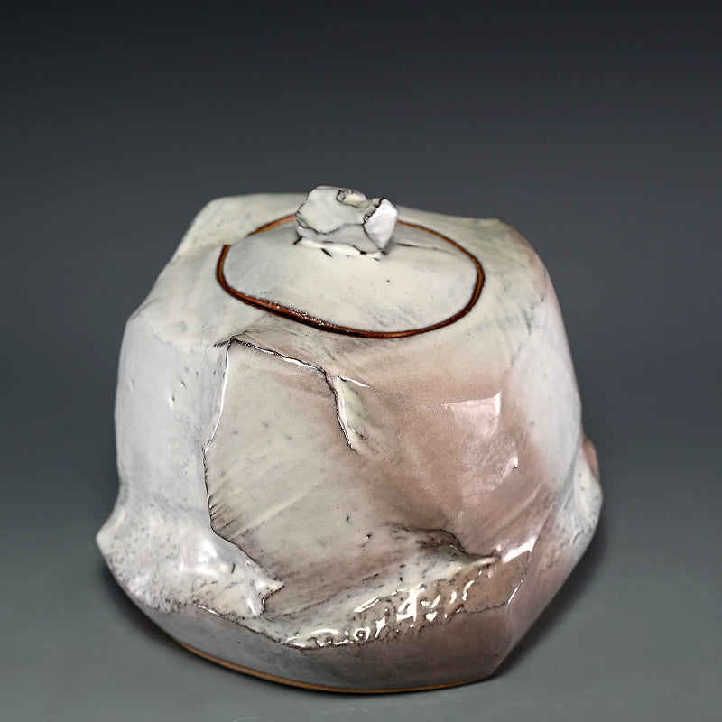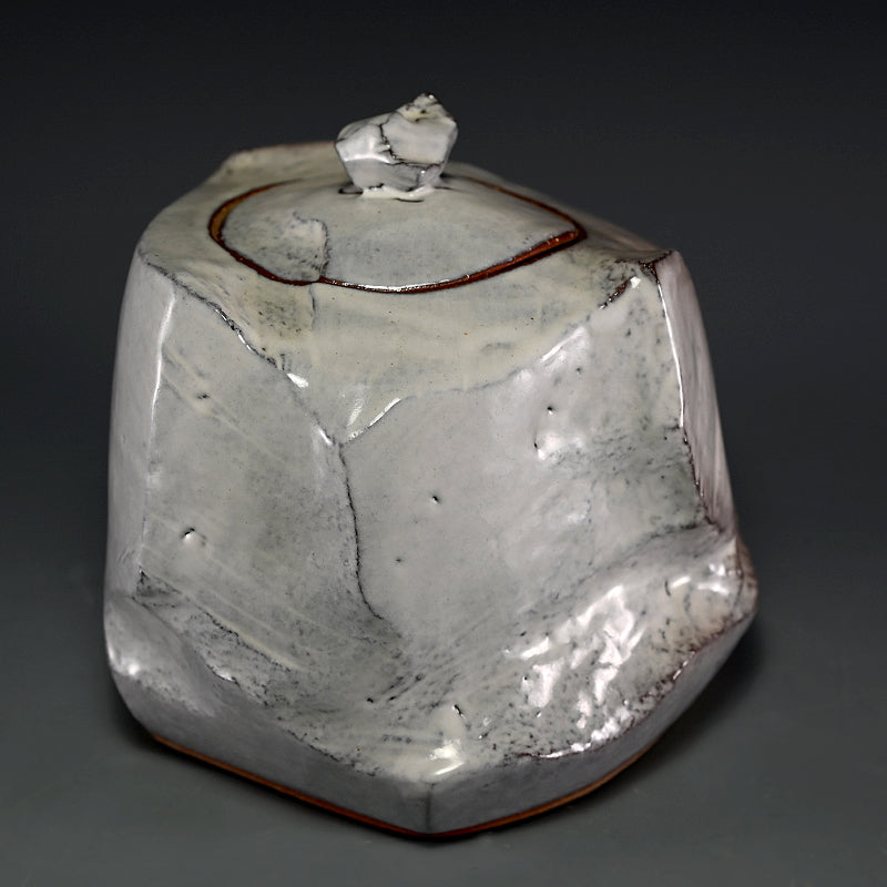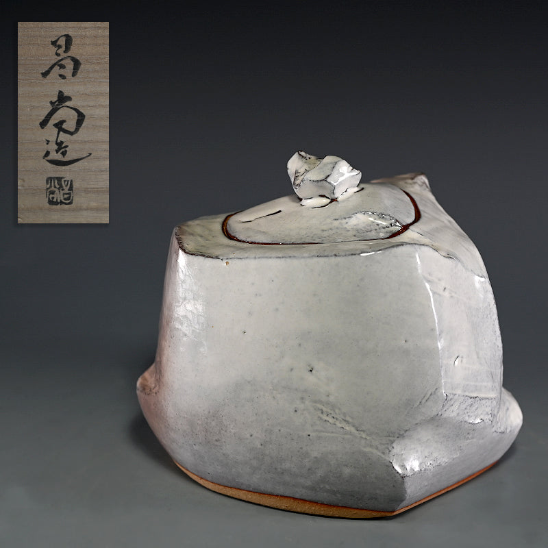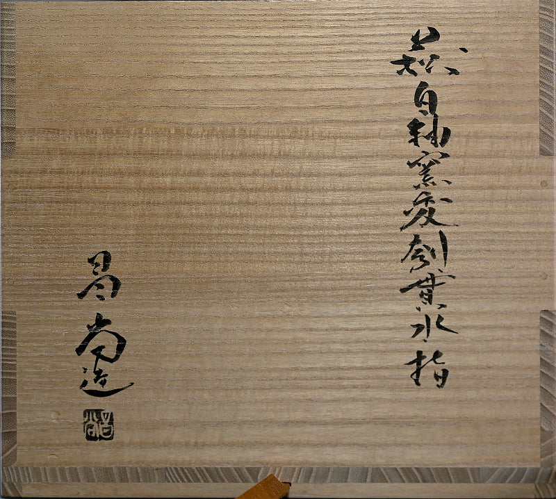 Lavender tinges the fog-gray surface of this chilling torn form by Hagi legend Kaneta Masanao enclosed in the original signed wooden box titled Hagi Haku-yu Yohen Kurinuki Mizusashi. It appears to be torn and wrestled, or perhaps chiseled from the earth, the p@ale glaze running over the ragged surface, settling into the clefts and folds. It is 20.5 x 23 x 20.5 cm (8 x 9 x 8 cm) and is in excellent condition.