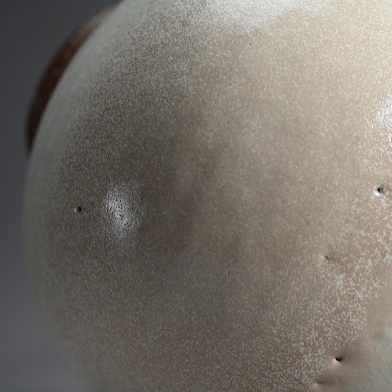 A haunting apparition in thick white glaze by Miwa Eizo enclosed in the original signed wooden box titled simply Hagi Vase. Perfectly formed, the mouth is raw earth with a thick lip of white Hagi glaze circling the rim to great effect. It is 24 cm (9-1/2 inches) diameter, roughly the same height, and in excellent condition.