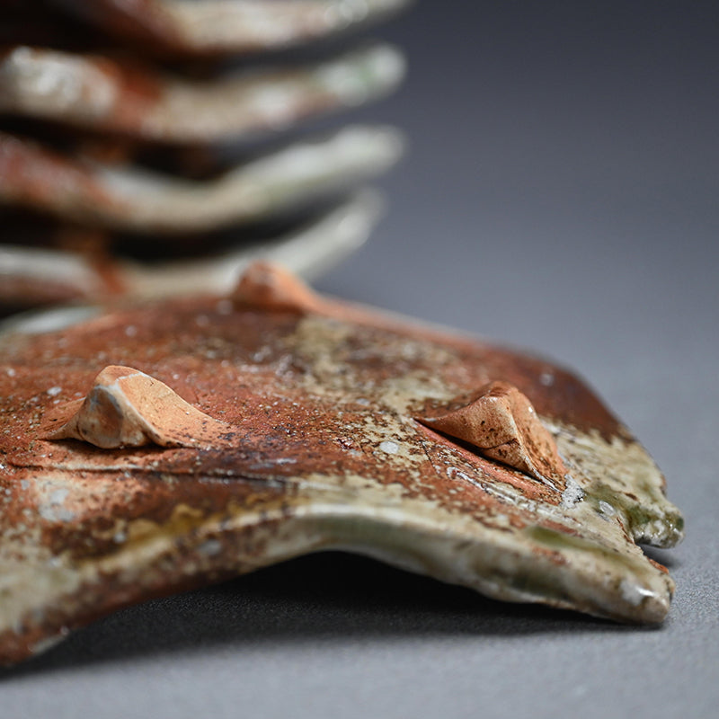 Atarashi Manabu has been growing in popularity as one of the leaders in the Iga pottery tradition since the first time I saw his work nearly 20 years ago when visiting the family showroom in Iga village. Born in 1973 in Osaka son of the second generation artist and one of the leading revivalists of the Iga tradition in post war Japan, Atarashi Kanji. He graduated the literature department of Kansai University in 1995, moving to apprentice under his father a few years later. In 2002 he built his first anagama Kiln, and held his first of a multitude of solo exhibitions. Intensely fired multiple times to achieve the bidoro glass puddles and landscape effects which define his aesthetic, the geometric works add a contemporary sensibility to the traditional Iga style and transcend the realm of utilitarian crafts breaking into the sculptural domain. His work has proven innovative and challenging to the norm, taking his fathers tradition into the 21st century.