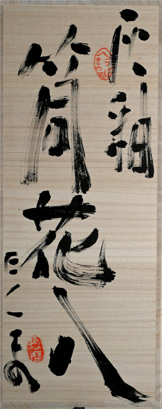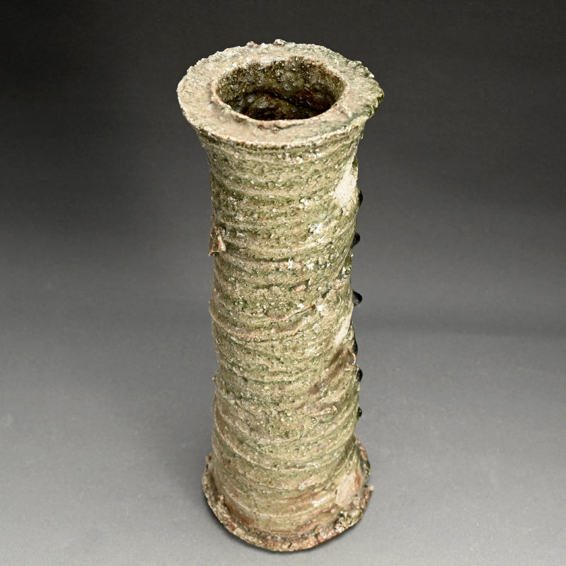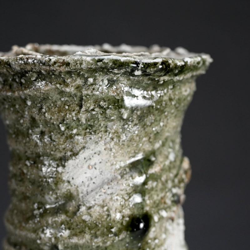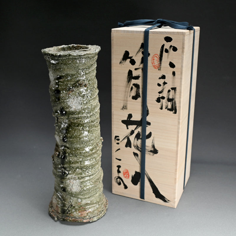 This piece has been welcoming visitors to Takumas house for a decade, an earlier work which he until now refused to sell, we put the pressure on this time and pried it from his entrance-way. It is an incredible work spiraling upward in thick, undulating walls covered in rich green glaze. It is 16.5 cm (6-1/2 inches) diameter, 46.5 cm (18 inches) tall and in excellent condition, weighing 6.8 kg (15 pounds)directly from the artist and enclosed in the original signed wooden box titled Haiyu Tsutsu Hanaire.