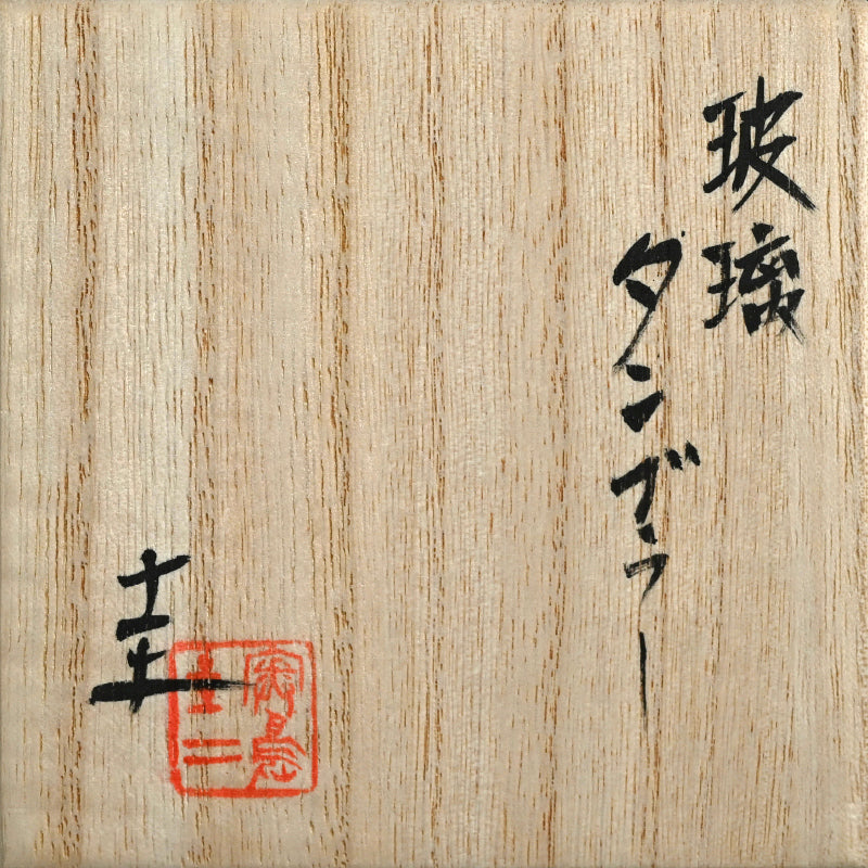 A glass cup by Okushima Keiji enclosed in the original signed wooden box titled Hari Tanbura Glass Tumbler). It is 7 cm (3 inches) diameter, 10 cm (4 inches) tall and in excellent condition.