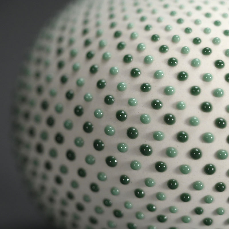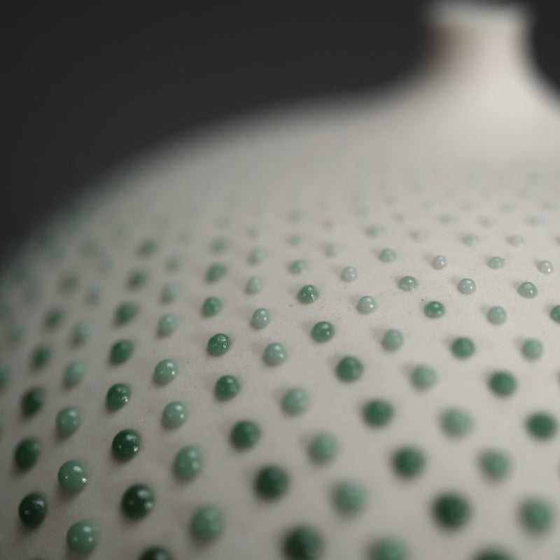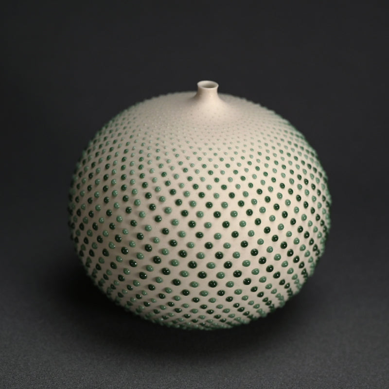 A one flower vase by rising young female star Okayasu Manami enclosed in the original signed wooden box titled Ichirin. The entire vessel is covered in a complex pattern of perfectly placed glaze pebbles, a sight to behold. It is 11.5 cm (4-1/2 inches) diameter, 11 cm tall and in excellent condition, directly from the artist this year.