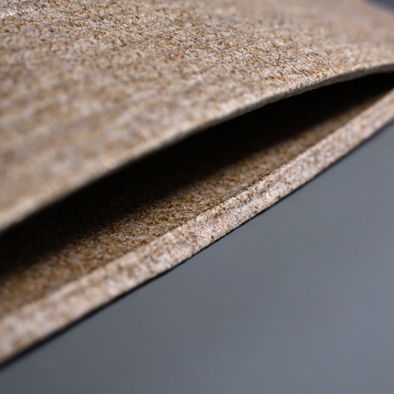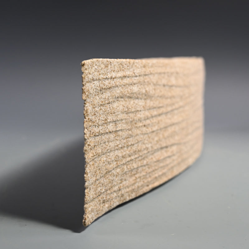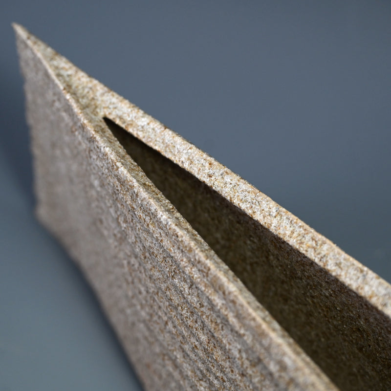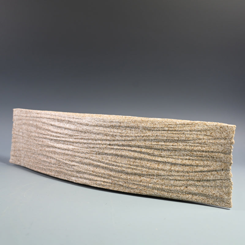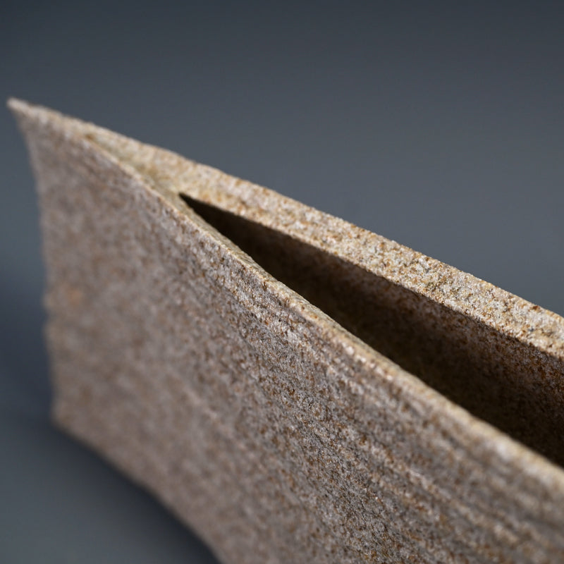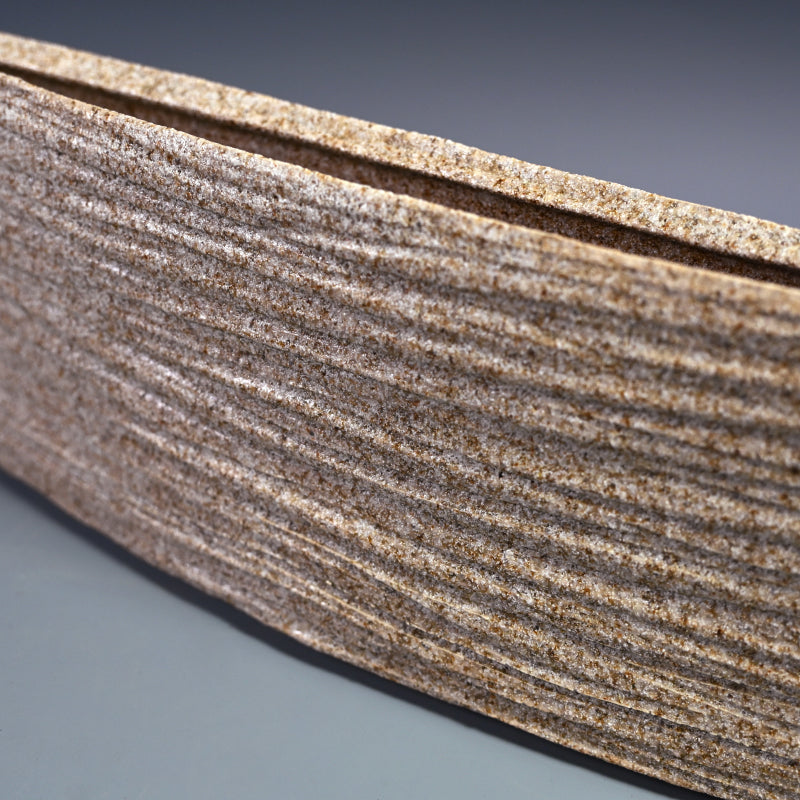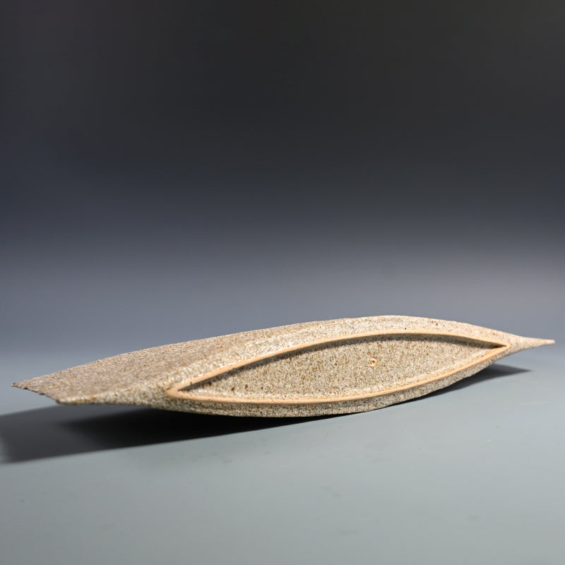 An elongated precipitous basin in sandy earth colors by Sakiyama Takayuki enclosed in the original signed wooden box titled Henko, Nami (Odd shaped vase, Waves). It is 54 x 8 x 14.5 cm (21-1/2 x 3 x 5-3/4 inches) and is in excellent condition.