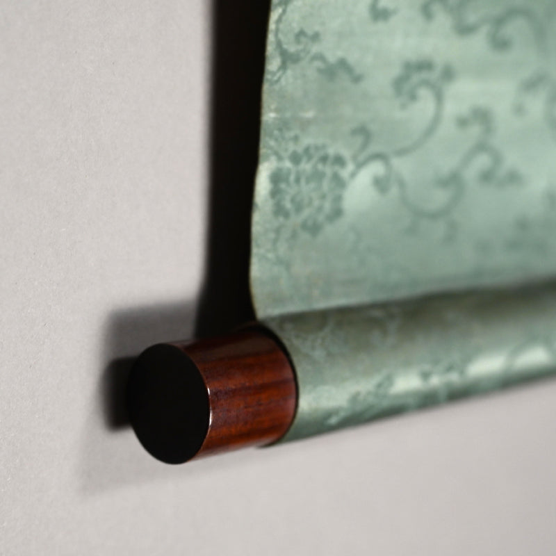 In the collection, two hanging scrolls by Fukuda Kodojin, while composed almost identically, reveal dramatically different expressive intentions through brushwork, ink handling, and spatial rhythm. They offer a rare glimpse into Kodojin’s evolving approach to literati painting, and his subtle negotiation between disciplined restraint and spontaneous expression. In this first scroll, the brushwork is restrained, lyrical, and highly controlled. Kodojin builds the cliffs and mountains with crisp, vertical strokes, carefully modulated in tone and moisture. The bamboo grove below is drawn with precise, elegant leaf clusters and tall, evenly spaced stalk. The little thatched hut beside the bamboo, its circular window revealing a solitary scholar within, evokes the archetypal image of the recluse in harmony with nature. Atmospherically, this painting feels quiet and ascetic: the ink tones are cool and the spatial intervals generous, inviting the viewer into a tranquil reverie. Every brush mark is deliberate, revealing the artist’s reverence for tradition and composure of mind. Ink on paper, in deep green patterned silk border with dark hard-wood rollers, wooden box. The scroll is 48 x 200.5 cm (19 x 79 inches) and is in overall excellent condition.
