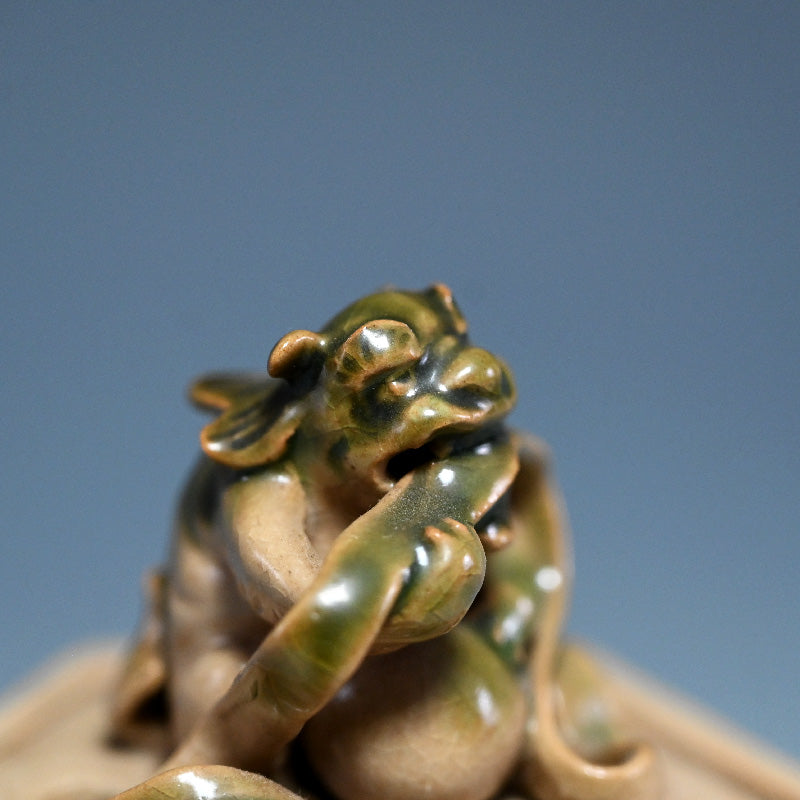 A shishi lion bites into a tangle of ribbon on the pierced lid of this pottery koro by Ito Tozan enclosed in the original signed wooden box. The six sided bosy is decorated with alternating designs of gees and florals among lattice-work. It is 8.5 x 8.5 x 14.5㎝ and in excellent condition.
