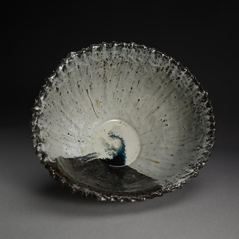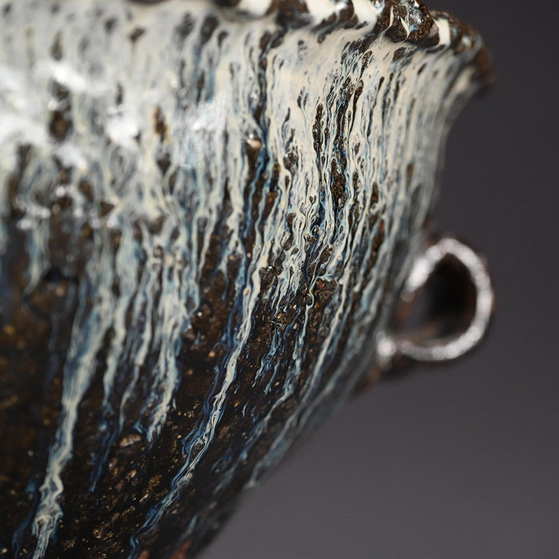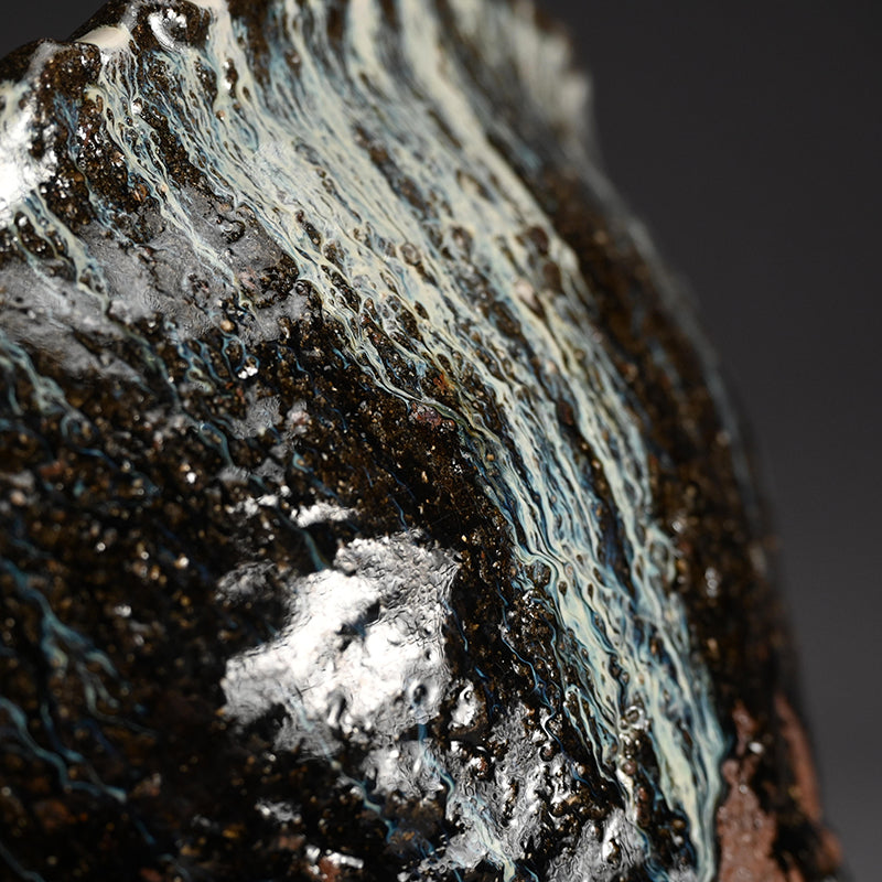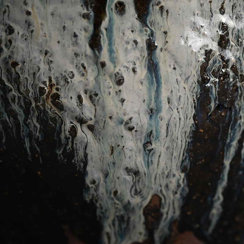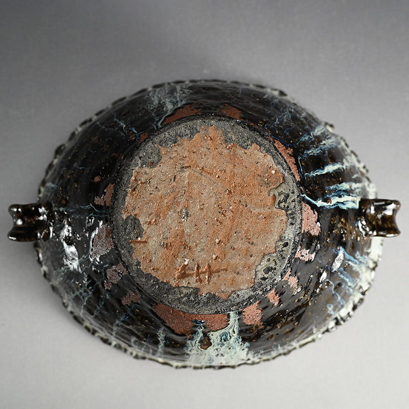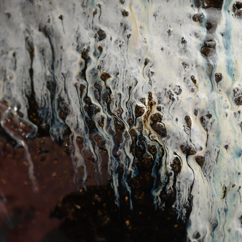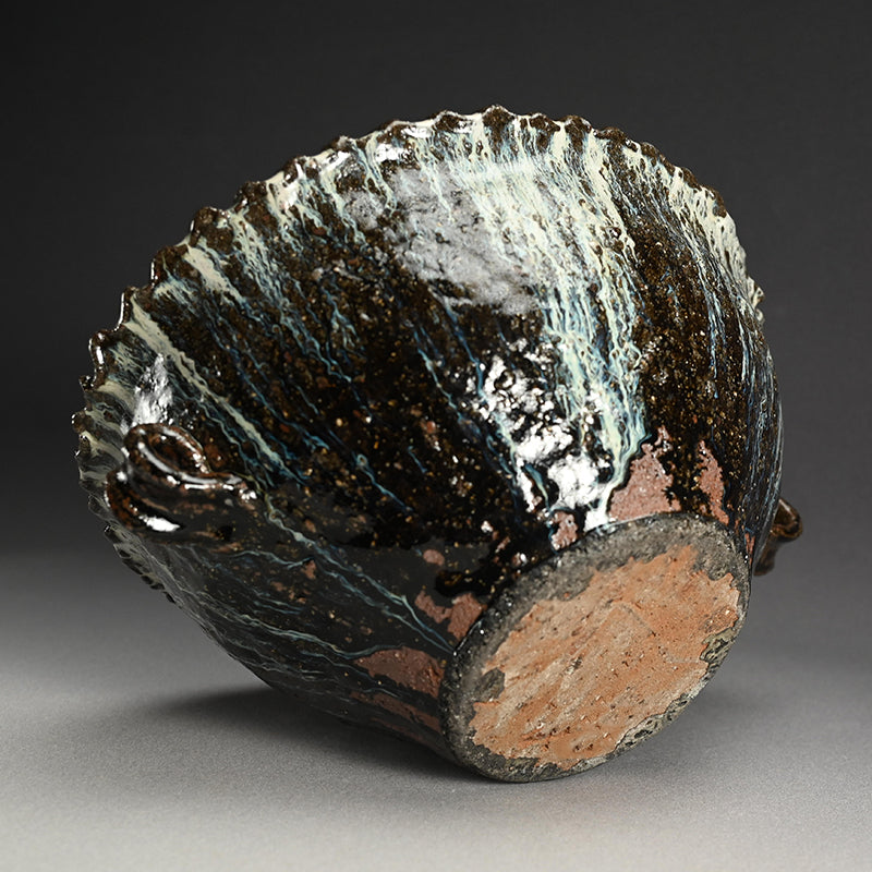Nakagawa Jinenbo (1953-2011) was a celebrated Japanese ceramic artist always fascinated with Karatsu ware. He studied under the great Inoue Toya from the age of 24. Several years later he returned to his hometown to establish a climbing kiln of his own, which he put to great use. From there, not satisfied with his own skills, he went to Tanaka Sajiro for an additional apprenticeship. Afterwards, as many Chajin artists, he concentrated on private exhibitions as an outlet for his work, shunning the world of mass competition and retail. Known for his inventive surface treatments, he applied dark brushwork onto red iron-rich clay bodies, creating dynamic, textured finishes that spoke to both tradition and spontaneity. His work features richly textured glazes and organic forms reflective of the Karatsu tradition, especially the distinctive Madara Karatsu style, noted for its mottled, natural glazes ranging from milky white to bluish or reddish hues, achieved through wood firing and experimentation with firing techniques. His life and career were cut short far too early, making his work both highly valued and hard to find.