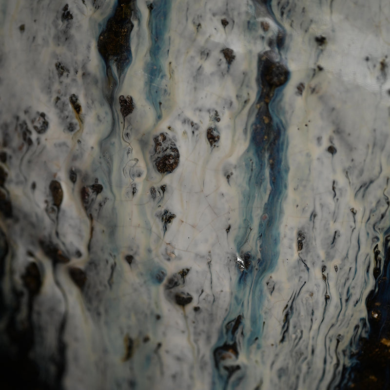An incredible large Basin covered in frothy foam and tempestuous blue by Nakagawa Jinenbo enclosed in the original signed wooden box titled Chossen Karatsu Nami Hachi. It is 36 x 31 x 16.5 cm (14-1/2 x 12-1/2 x 6-1/2 inches) and is in excellent condition.
