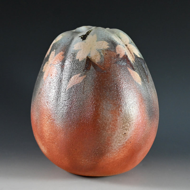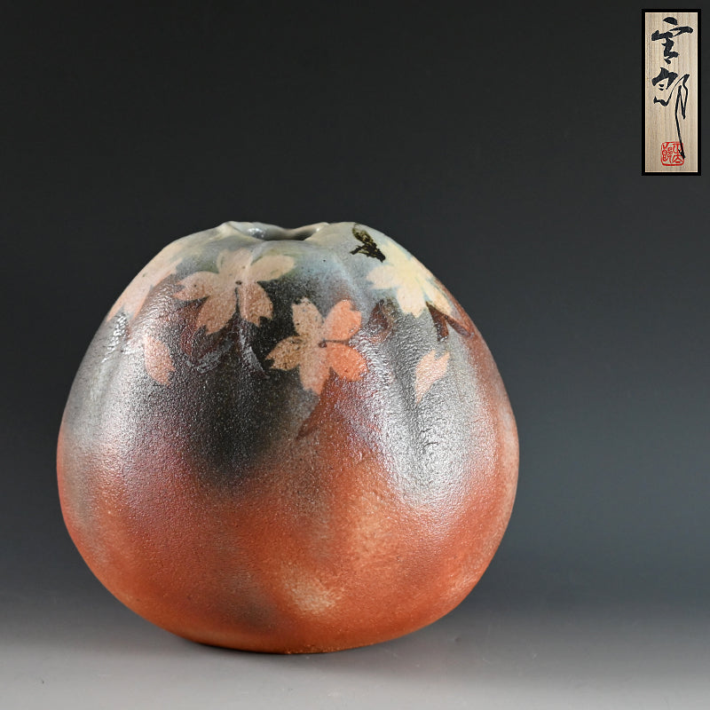 Sakura blossom on the foggy surface of this large vessel by Hayashi Shotaro enclosed in the original signed wooden box titled Manyo Nezumi Shino Sakura-mon Tsubo. It is (22.5 x 30 x 28 cm ( 9 x 12 x 11 inches) and is in excellent condition.