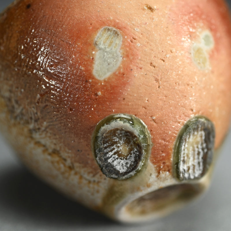 A natural ash glazed guinomi showing off fine hi-iro flame coloration on the raw clay by Tanimoto Yo enclosed in the original signed wooden box titled Iga Guinomi Kaze no Ne (The sound of the wind). It is 8 cm (3 plus inches) diameter, 6 cm (2-1/2 inches) tall and in excellent condition.