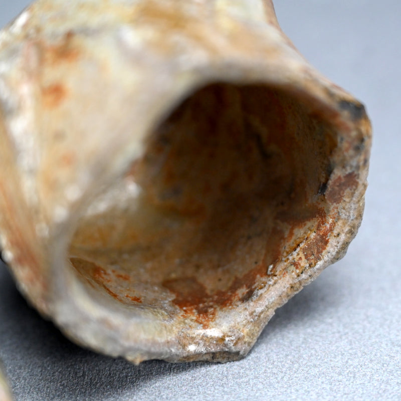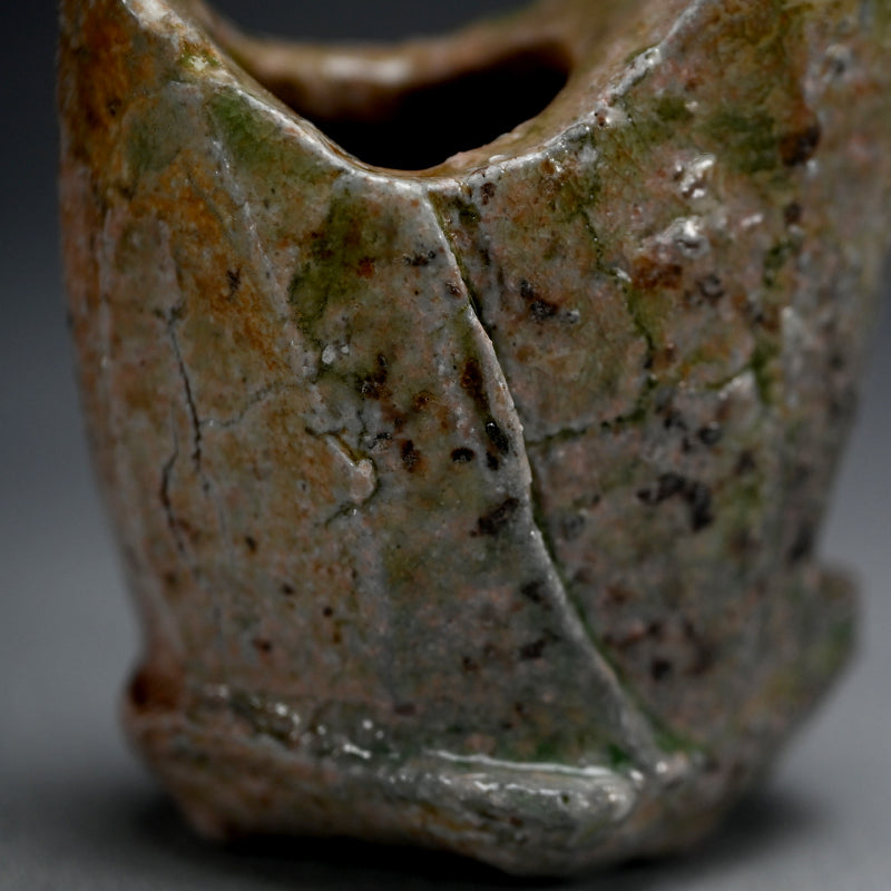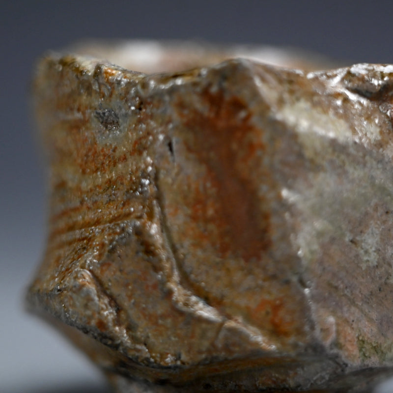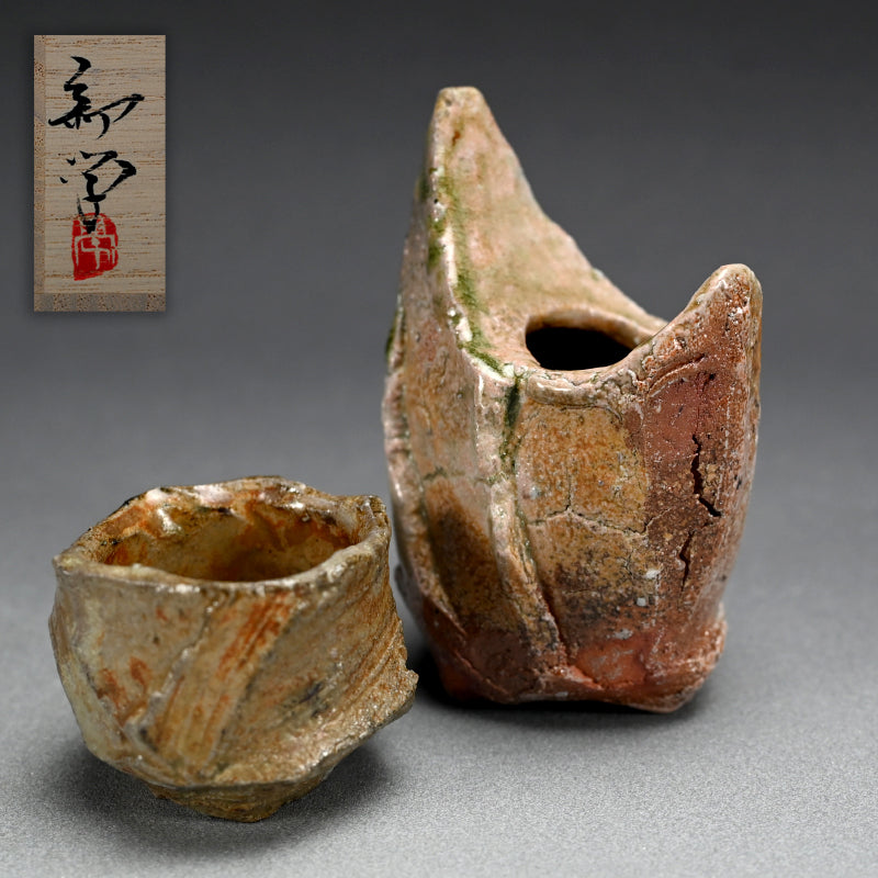 An unusual spouted Sake server with guinomi by Atarashi Manabu, both enclosed in the original signed wooden boxes titled Iga Shinogi Shuchu (Faceted Sake Vessel) and Iga Guinomi respectively. Shinogi is this method of cutting away portions of the surface, in this case in sweeping patterns like the arcing stroke of a Katana. This both allows the natural ash glaze a foot hold as it blows through the kiln, and as it cools, allows the molten ash to flow and create striking patterns on the surface. The flask is 9 x 6.5 x 13 cm (3-1/2 x 2-1/2 x 5 inches) tall. The cup is 7 cm (3 inches) diameter, 6 cm (2-1/2 inches) tall and both are new, directly from the artist.