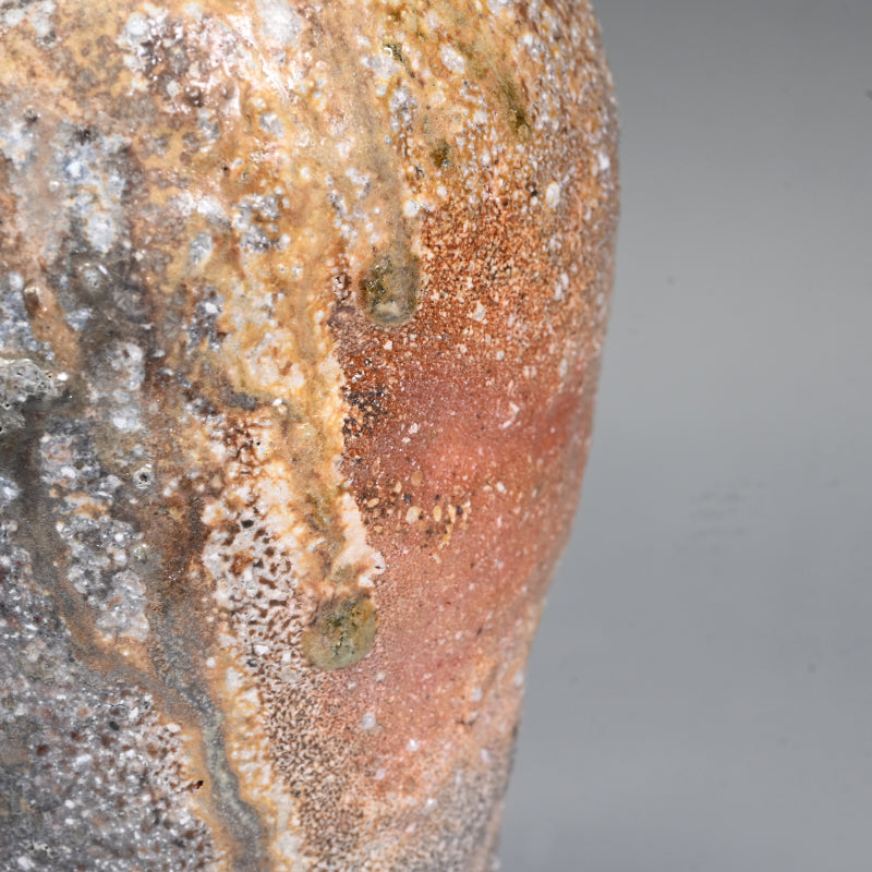 A grand blast of green ash grows gray as it congeals and meanders into rivulets flowing into the embers on this beautifully potted and deceptively light vessel by Kishino Kan enclosed in the original signed wooden box titled Iga Yakishime Hana-ire. It is 24.5 cm (just under 10 inches) tall and in excellent condition.