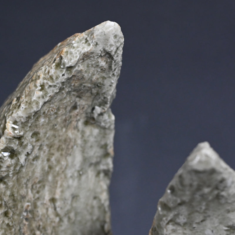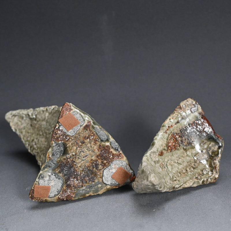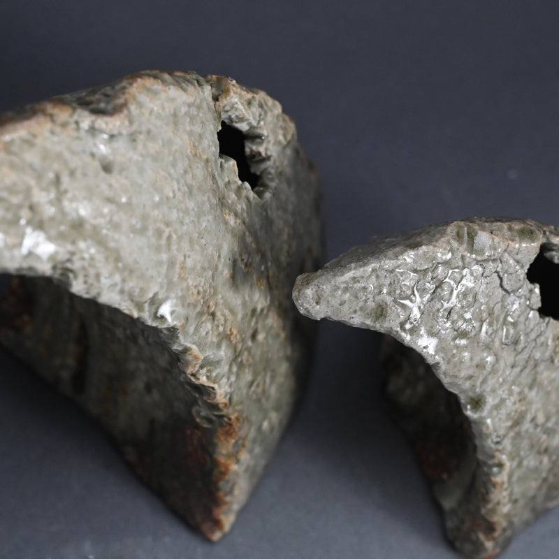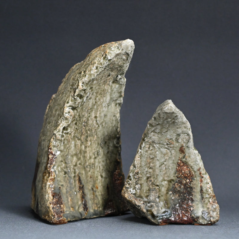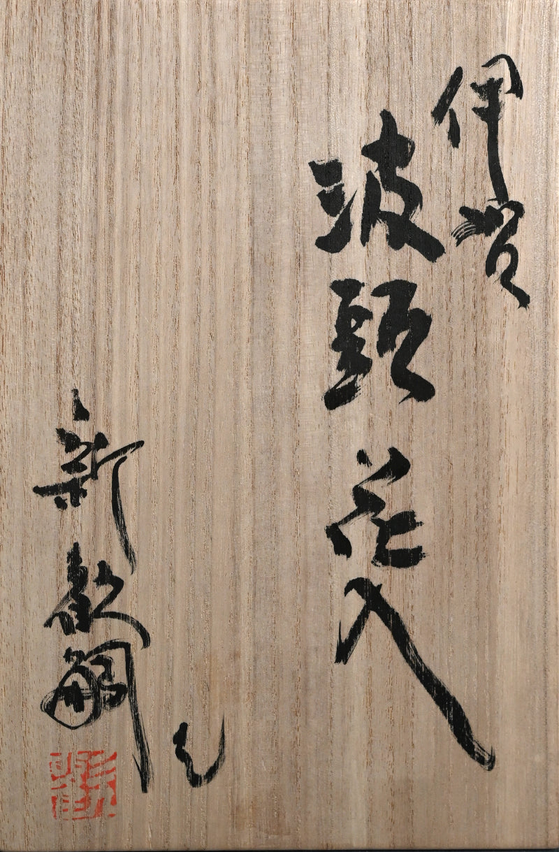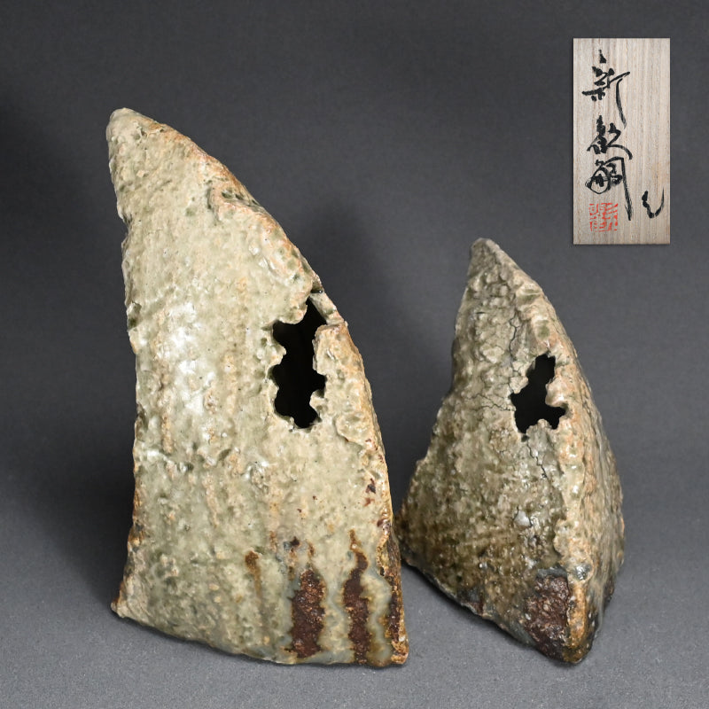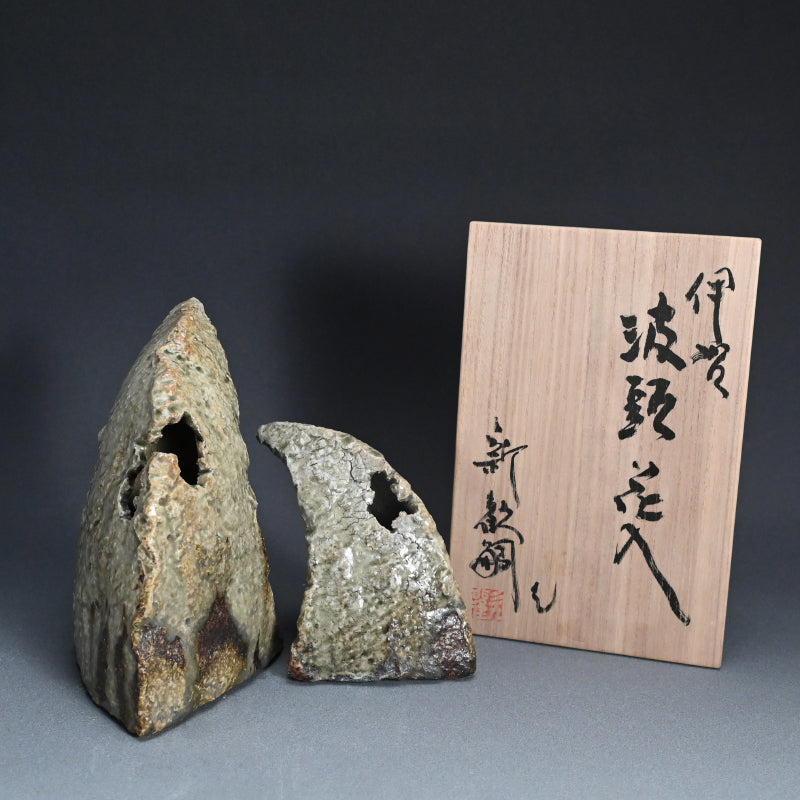 A set of two half crescent receptacles by Iga legend Atarashi Kanji enclosed in the original signed wooden box titled Iga Hamon Hana-ire (Wave Peak Vase). The smaller work is 16 x 13 x 16 cm (6-1/2 x 5 x 6-1/2 inches), the larger is 20 x 15 x 24 cm (8 x 6 x 9-1/2 inches) and both are in excellent condition.