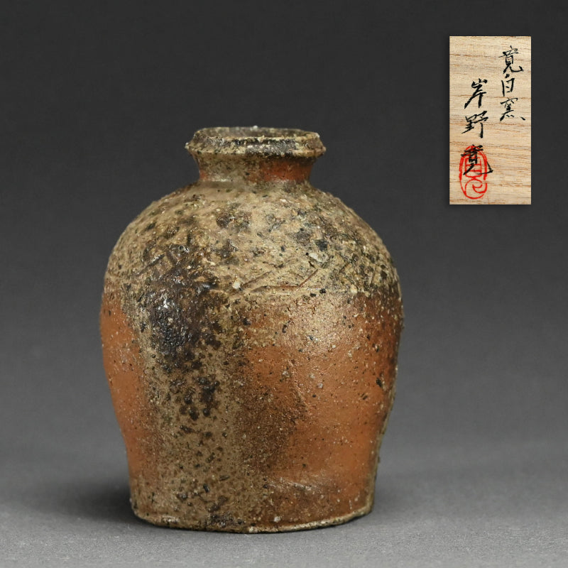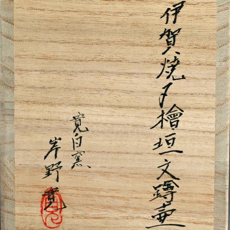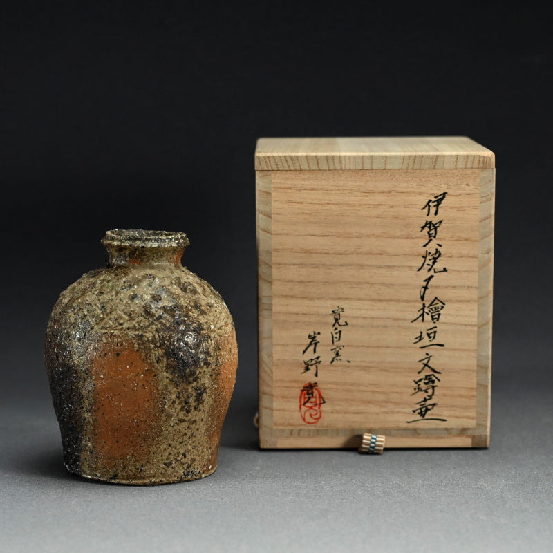 Crossed “Fence” patterns are scored about the shoulder of this ash encrusted vase by Kishino Kan enclosed in the original signed wooden box titled Iga Yakishime Higakimon Uzukumaru Tsubo. It is 11 cm (4-1/2 inches9 diameter 13.5 cm 5-1/2 inches) tall and in excellent condition.