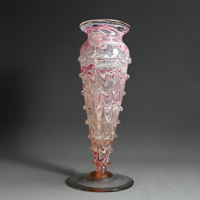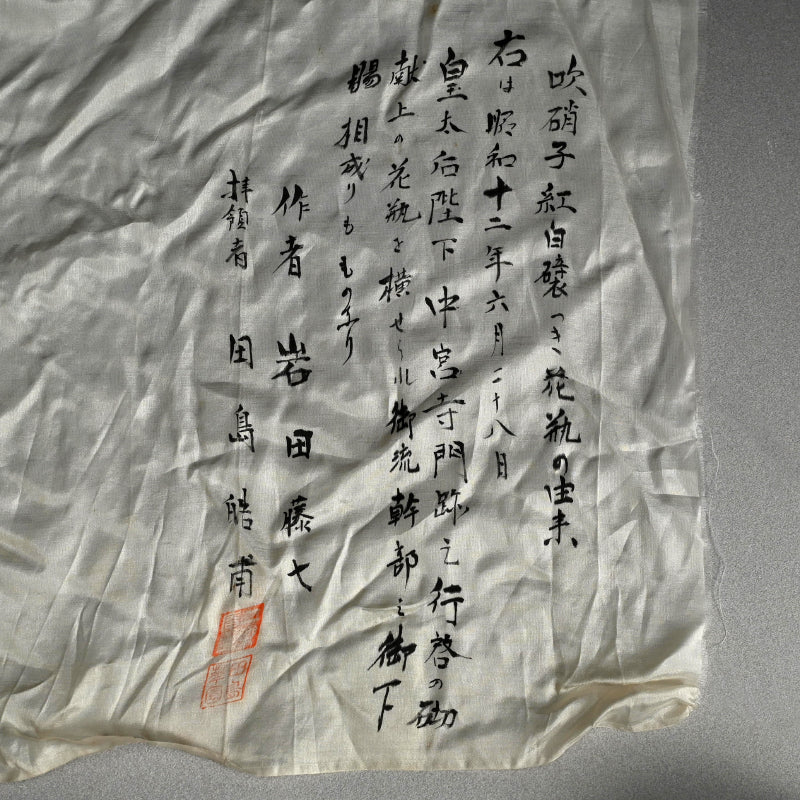 This red-and-white blown glass vase with pleated surface decoration is the work of Iwata Toshichi (1893–1980), a seminal figure in the emergence of modern Japanese art glass who not only helped research and revive ancient Japanese glass techniques, but also blended Western glassmaking techniques with Japanese sensibilities of color and form. It comes enclosed in the original signed wooden box titled Fuki Garasu Kohaku Hidatsuki Kabin wrapped in a silk cloth upon which is repeated the title followed by: “On June 28, Showa 12 (1937), upon the occasion of Her Majesty the Empress Dowager’s visit an identical vase of this type was presented as an offering to the Chuguiji Monzeki,. Another was subsequently bestowed upon a senior member of the imperial floral school. Artist: Iwata Toshichi; Recipient: Tajima Koho.” The import of these imperial gifts is indicative of the stature of Iwata’s workshop at a time when glass was increasingly recognized not only as an industrial material but as a medium of fine craft. One of the presentation vases from this offering was conferred as an imperial bestowal upon a senior figure within the court floral tradition; the present example was received by Tajima Koho, marking its connection to both imperial patronage and court ceremonial culture. As an early imperial commission, it represents a rare and historically significant early work by Iwata, demonstrating the refinement and prestige associated with Japanese studio glass on the eve of the postwar craft renaissance. The vase is 13.5 cm (5-1/2 inches) diameter, 32 cm (13 inches) tall and in excellent condition.