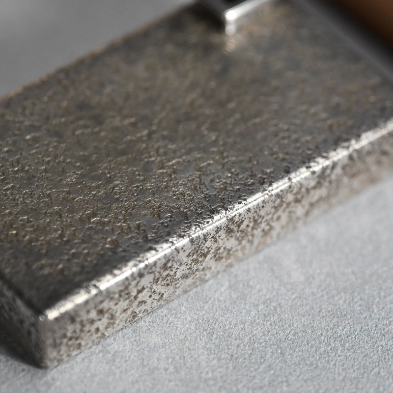 Autumnal grasses in hira-maki-e slightly obscure the inlayed silver calligraphic character of “Moon” rising in the darkness beyond on this Rimpa inspired Suzuri Bako writing box by Kamisaka Yukichi enclosed in the original signed wooden box titled Maki-e Suzuribako. The appearance of an imperial Chrysanthemum crest indicates this was likely Sagarimono, an Imperial Gift. It features a large Suzuri writing stone inset into the interior accompanied by a large silver suiteki weighing 84 grams. A silk bound pillow protects the inside. The box is 26 x 23.5 x 5.5 cm (10-1/4 x 9-1/2 x 2 inches) and the lacquer is in overall excellent condition. There is some bubbling in the surface of the suzu (pewter) rim that encases the edges (see close-up photos for details.