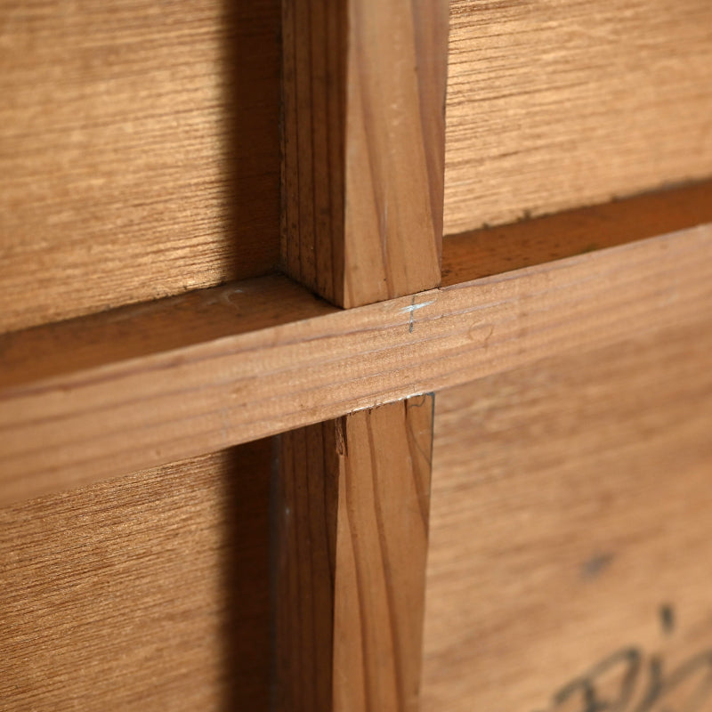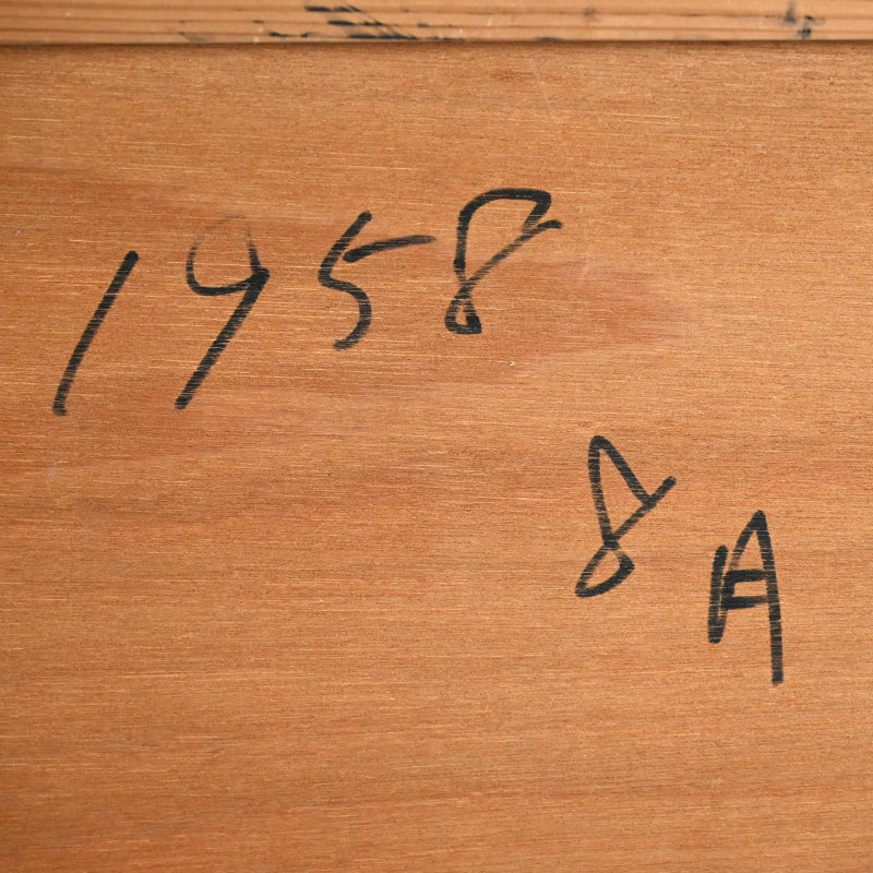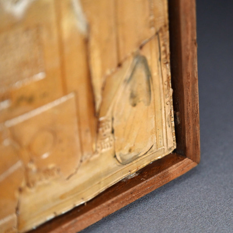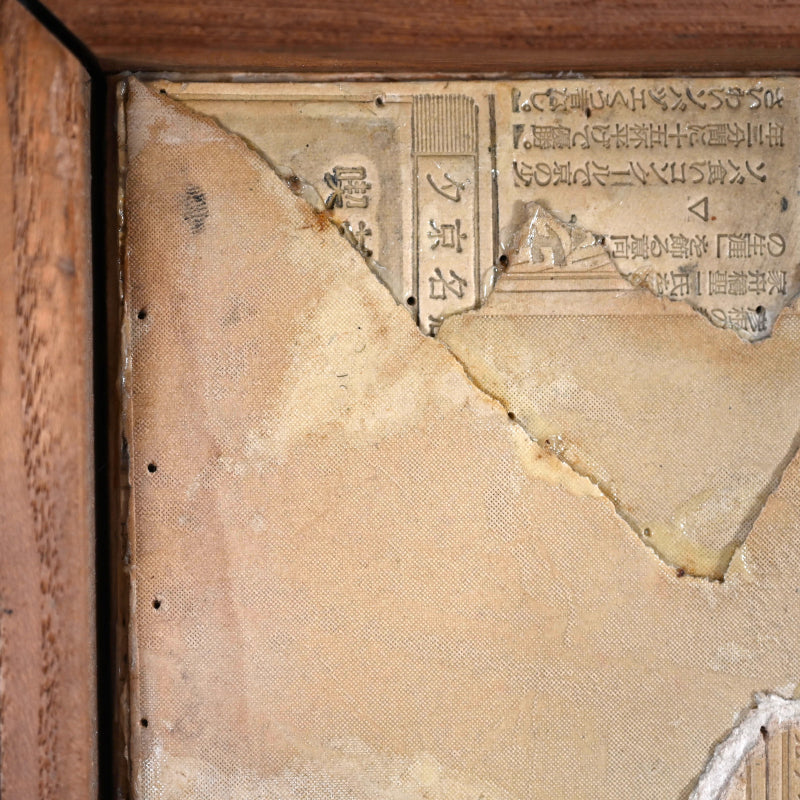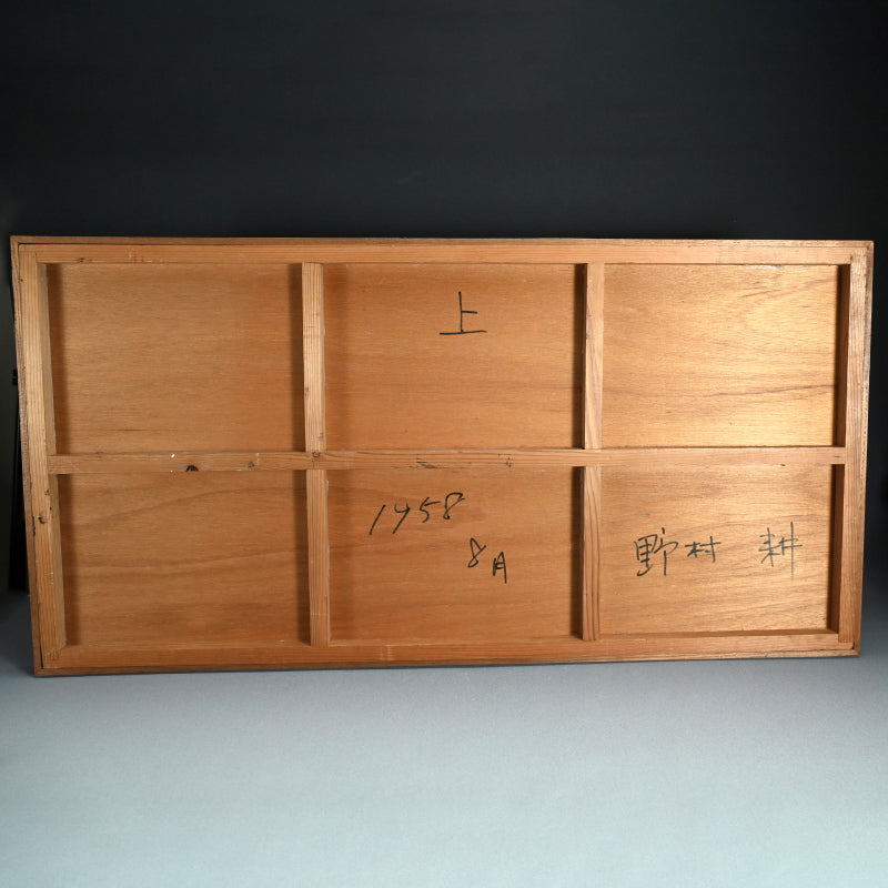 A large collage of torn print-work flongs on wood panel in an artist made frame, the work is inscribed on the reverse with the date August 1958 and the artist’s name, Nomura Kō, written in kanji. It was Exhibited in a 1981 retrospective at galerie 16 in Kyoto. The frame is 62.5 x 125 x 4 cm (25 x 73 x 1 inches) and is in overall excellent condition. A flong is a type of paper mold impressed with imagery or newsprint used in the pre-digital printing process which would have been discarded after production. Nomura made use of these as his signature collage base.
