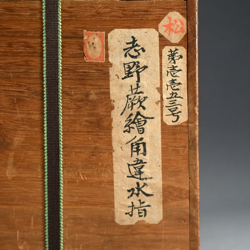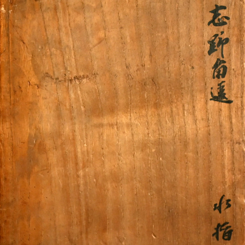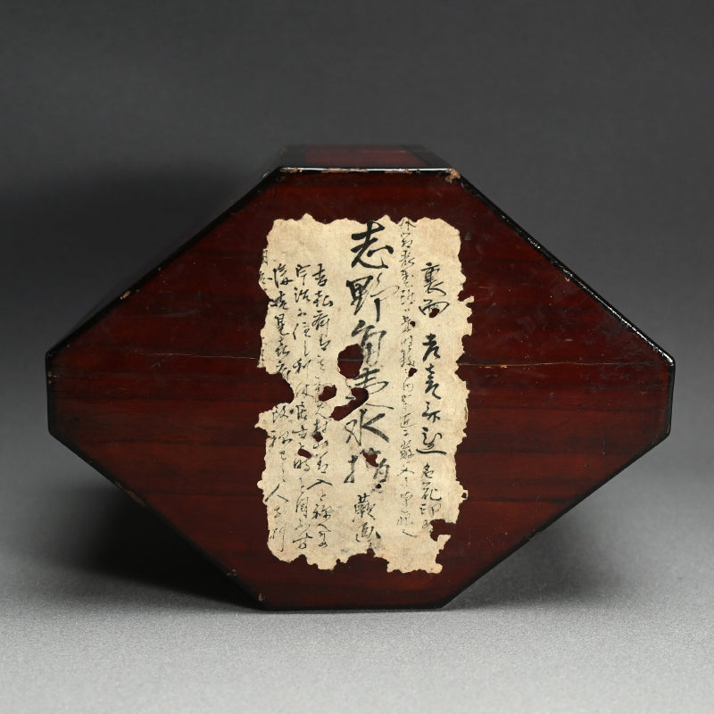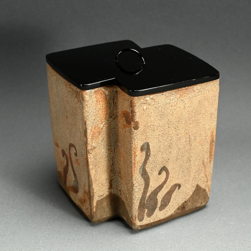 An incredible early Shino Mizusashi enclosed in a lozenge shaped red lacquered wooden storage box in turn enclosed in an outer heavy storage box showing the value placed upon it. The vessel is created in a lightning shape, with abstract incense clock designs and fern fronds in iron under the thin feldspathic glaze. It features a black lacquered wooden lid. The water storage vessel is 20 x 15 x 18 cm (8 x 6 x 7 inches) and is in excellent condition. There is a crack in the lacquer and one old repair to the corner of the wooden lid.