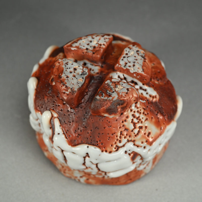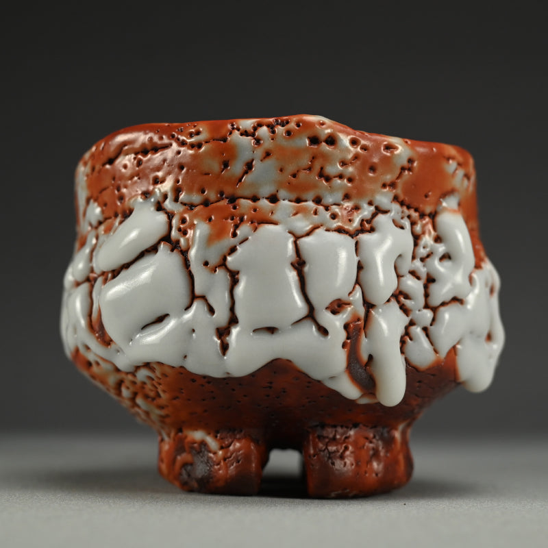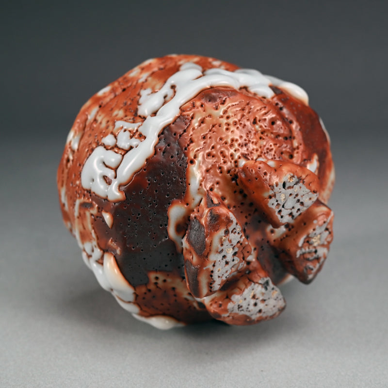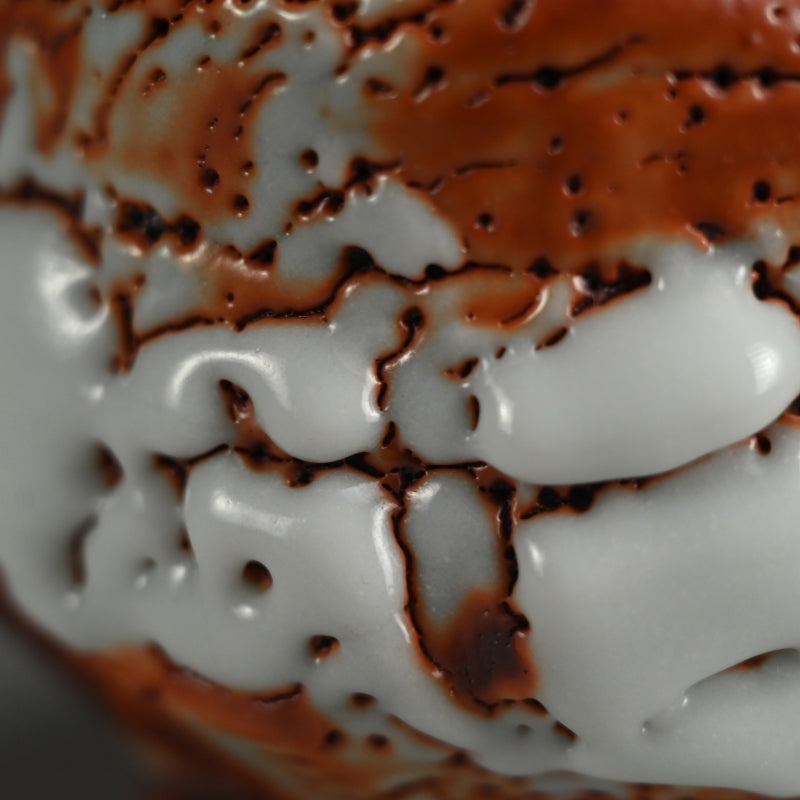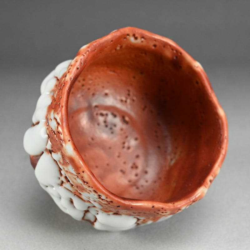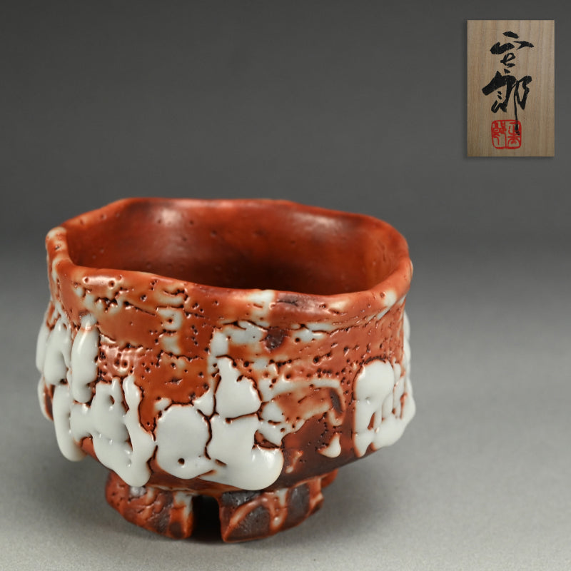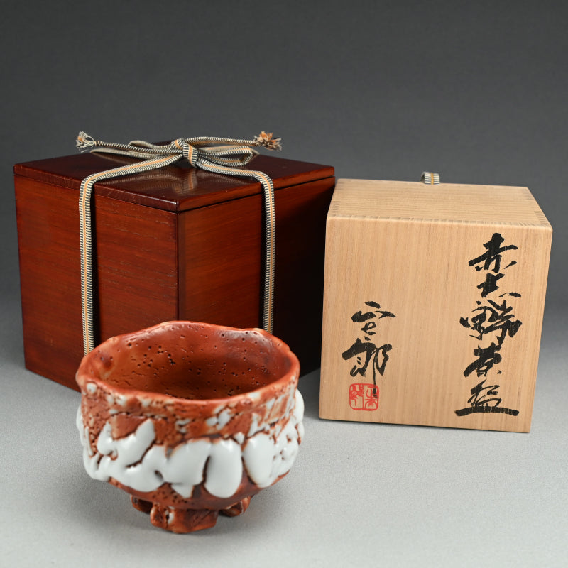 Ultra thick white glaze seems to exude in thick marshmallow puffs from the flame red surface of this huge Tea bowl set high on a cross-cut base by Hayashi Shotaro enclosed in the original signed Ni-ju-bako (Double) wooden box titled Aka-Shino Chawan. The outer box is lacquered in a rich translucent red. The bowl is 15 cm (6 inches) diameter, 11 cm (4-1/4 inches) tall and in perfect condition, a museum quality work showing the best of this artist.