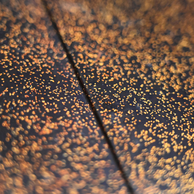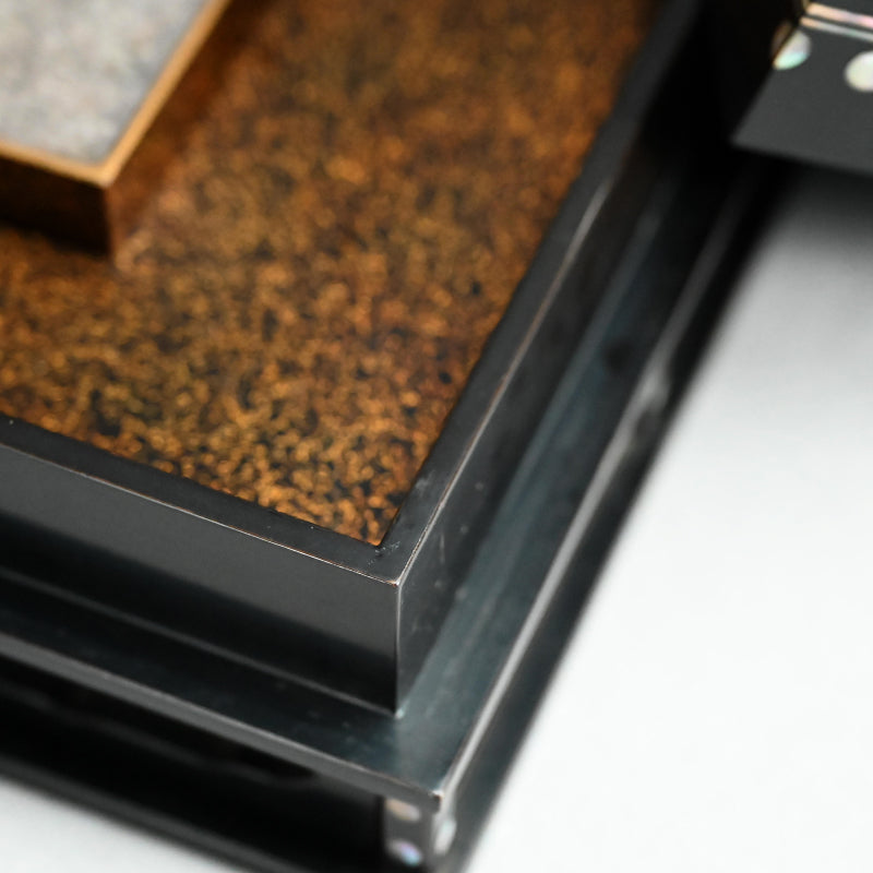 A radical design of flowers intertwined with fines and heraldic crests inlayed in mother of pearl into black lacquer in the style of work held in the collection of Shosoin. With a matching silver suiteki water-dropper in the shape of a flowering vine.