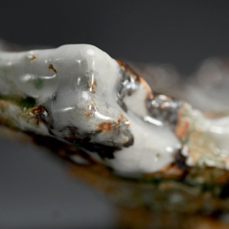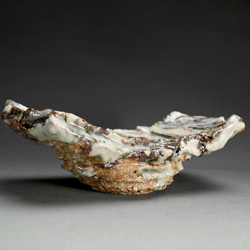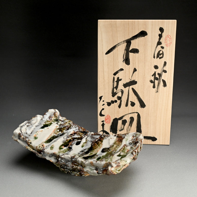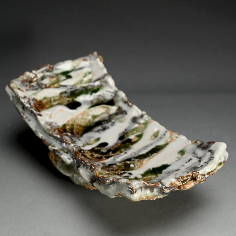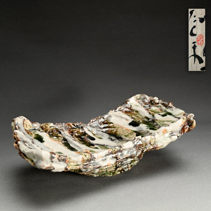 One of his most popular new forms, this starkly arching elevated dish is by Murakoshi Takuma is covered in white over shadows of iron with areas of thin green revealing the clay beneath, weeping giant droplets onto the swirling center. It comes enclosed in the original signed wooden box titled Shunju Geta-zara. It is called a Geta-zara, named after the traditional elevated wooden sandals worn in Japan in previous eras. Quite large it is 39 x 21.5 x 12.5 cm (15-1/2 x 8-1/2 x 5 inches) weighing in at 5.2 kg (almost 12 pounds!) in perfect condition, directly from the artist.