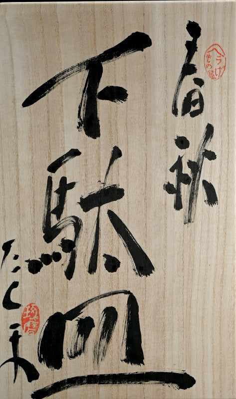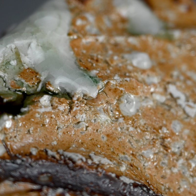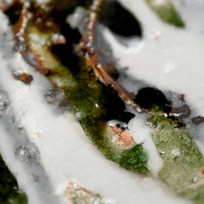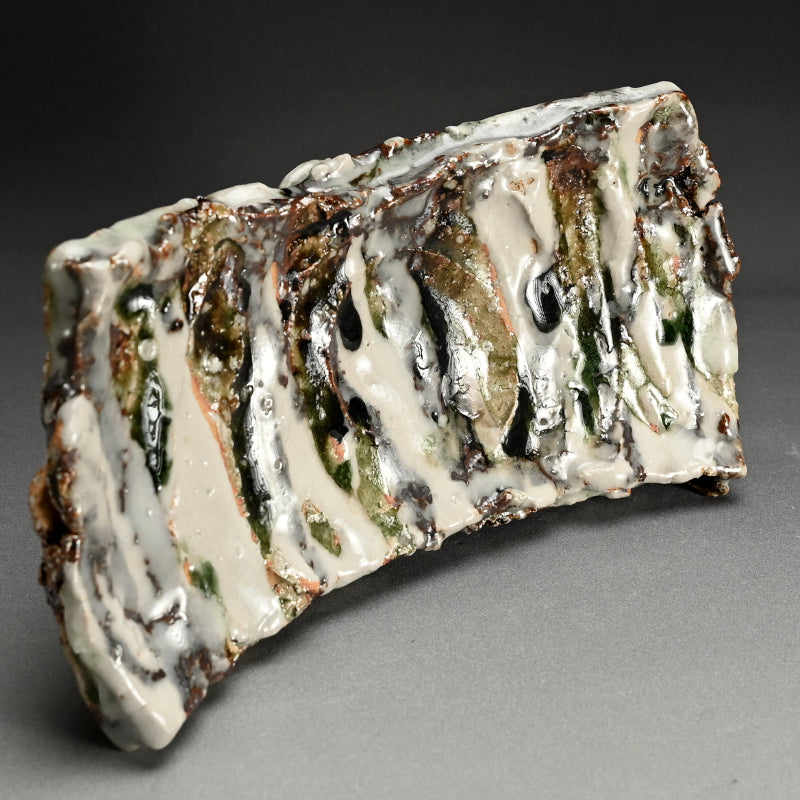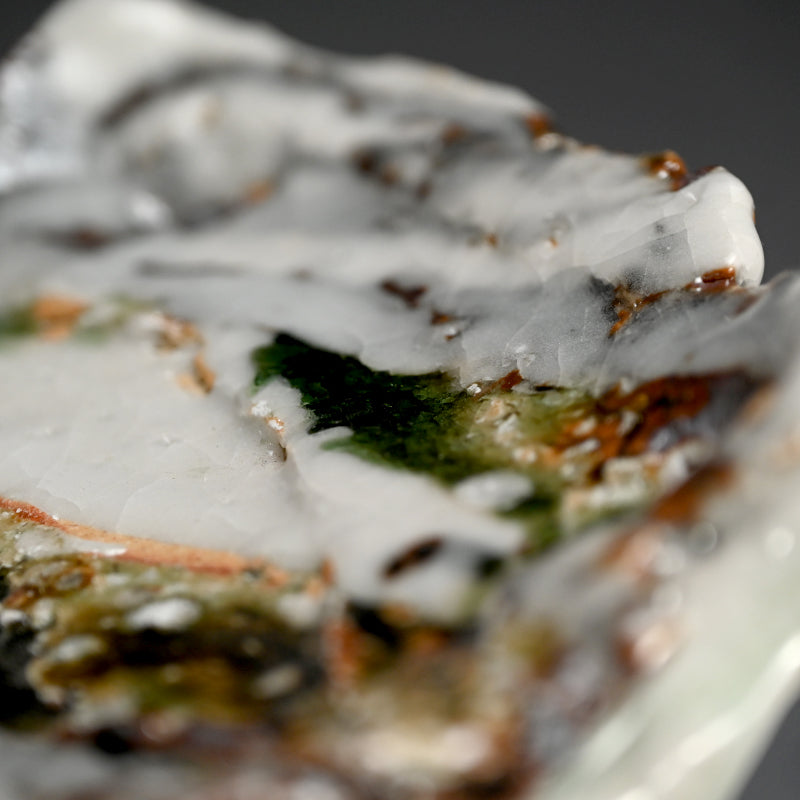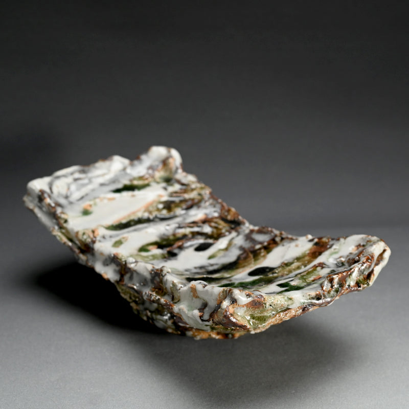 One of his most popular new forms, this starkly arching elevated dish is by Murakoshi Takuma is covered in white over shadows of iron with areas of thin green revealing the clay beneath, weeping giant droplets onto the swirling center. It comes enclosed in the original signed wooden box titled Shunju Geta-zara. It is called a Geta-zara, named after the traditional elevated wooden sandals worn in Japan in previous eras. Quite large it is 39 x 21.5 x 12.5 cm (15-1/2 x 8-1/2 x 5 inches) weighing in at 5.2 kg (almost 12 pounds!) in perfect condition, directly from the artist.