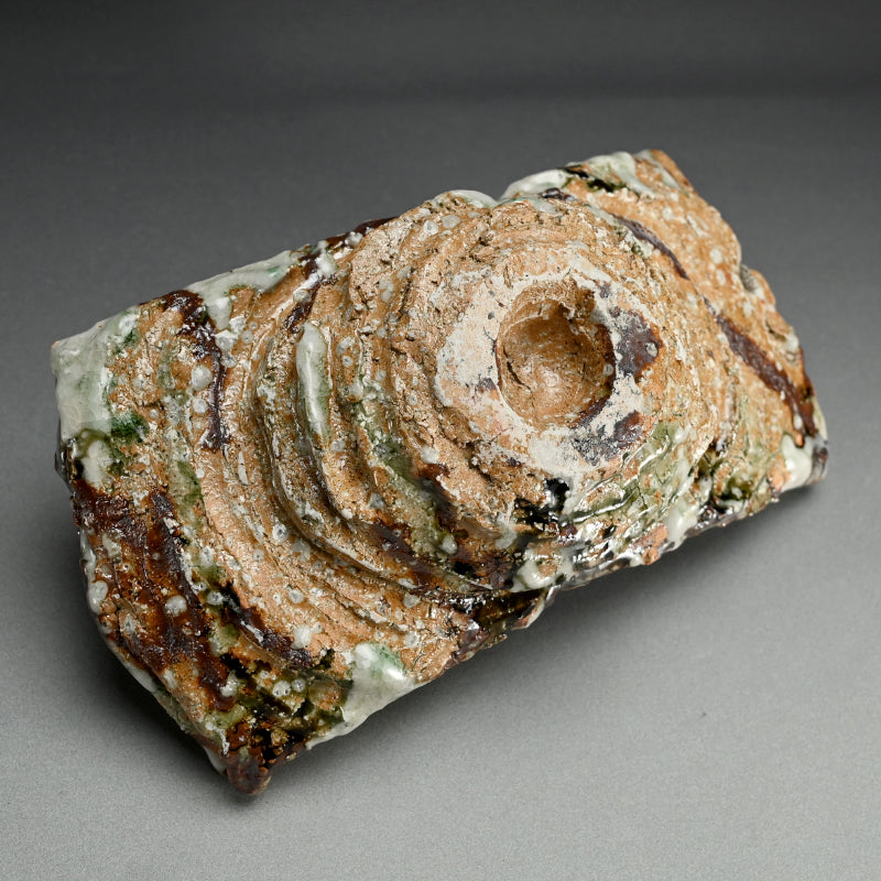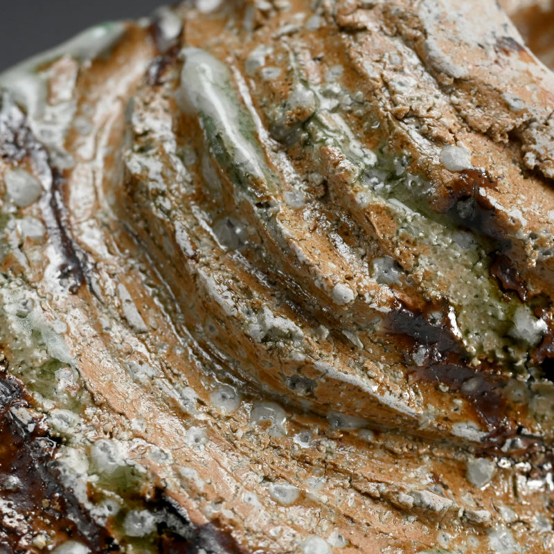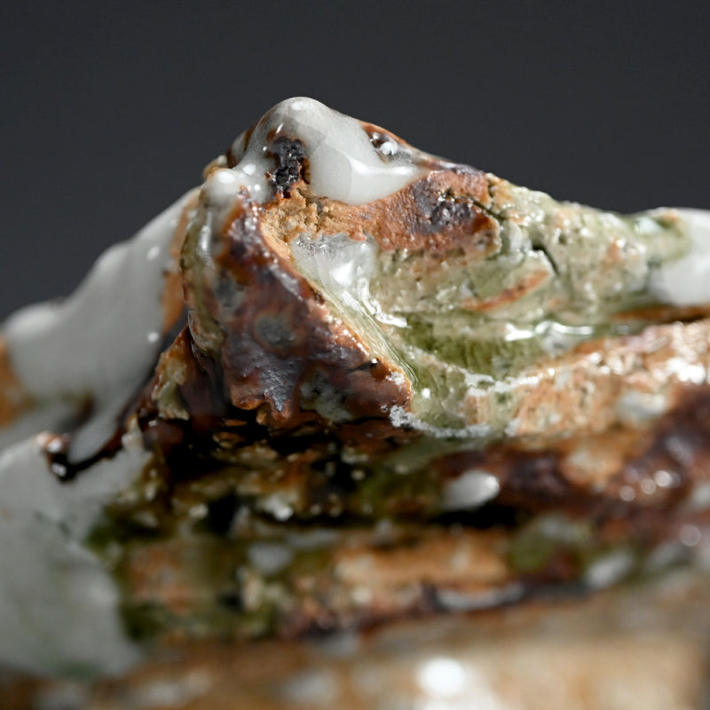 Murakoshi Takuma is one of those enigmas who simply lives to work with clay. He does not seek to make a living through pottery, but through his primal approach has earned a following which keeps his work in high demand. He was born in Aichi prefecture in 1954 and began his stroll down the pottery path in 1980 under the tutelage of Kyoto potter Umehara Takehira. Favoring very rough Shigaraki glaze, he established his own kiln in 1997 in the Kiyomizu pottery district of Kyoto, then moved to Nagaoka in 2002. Although eschewing the world of competitive exhibitions, he has been picked up by many of Japan’s preeminent galleries, including private exhibitions at the prestigious Kuroda Toen of Tokyo’s Ginza District.