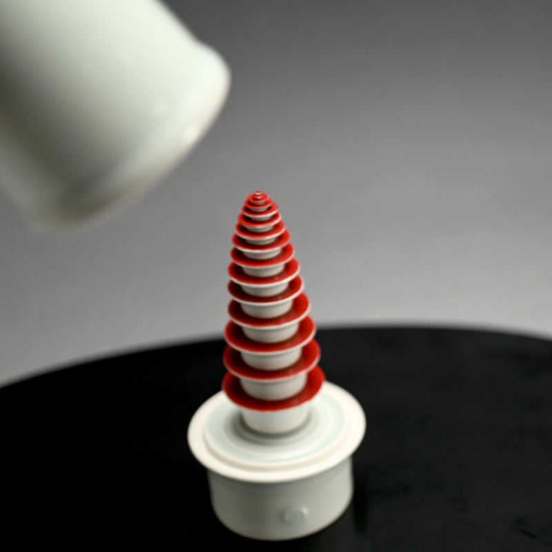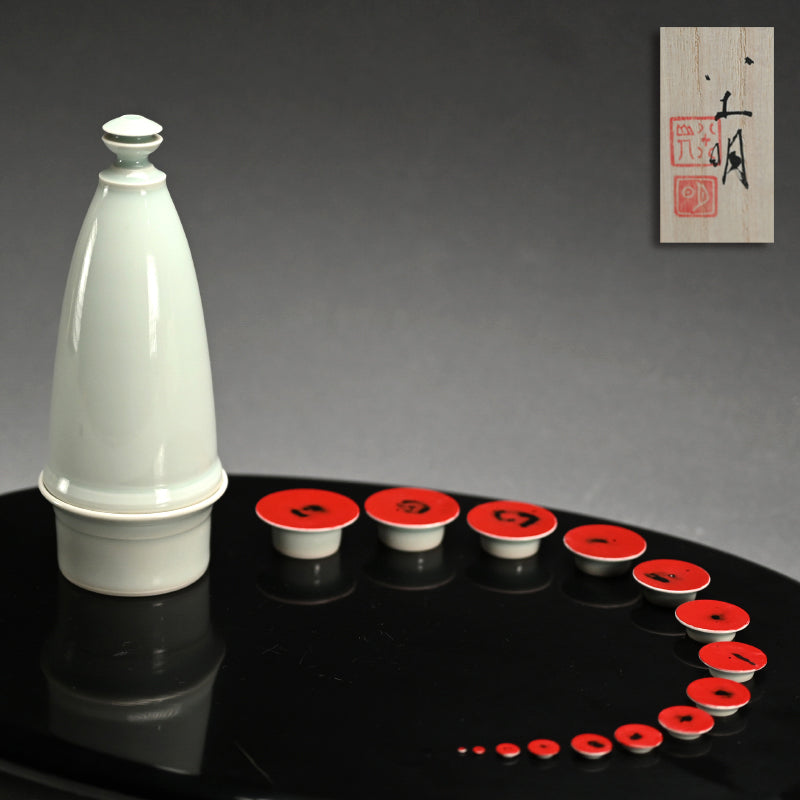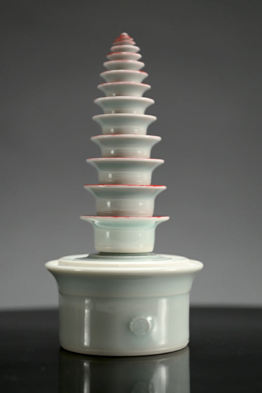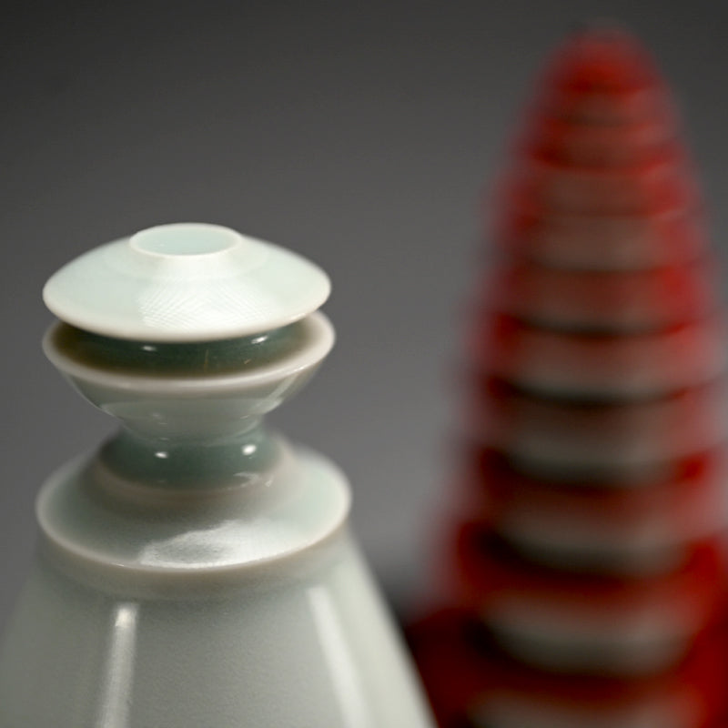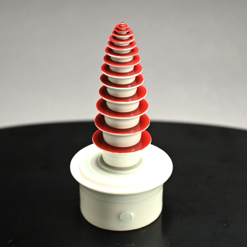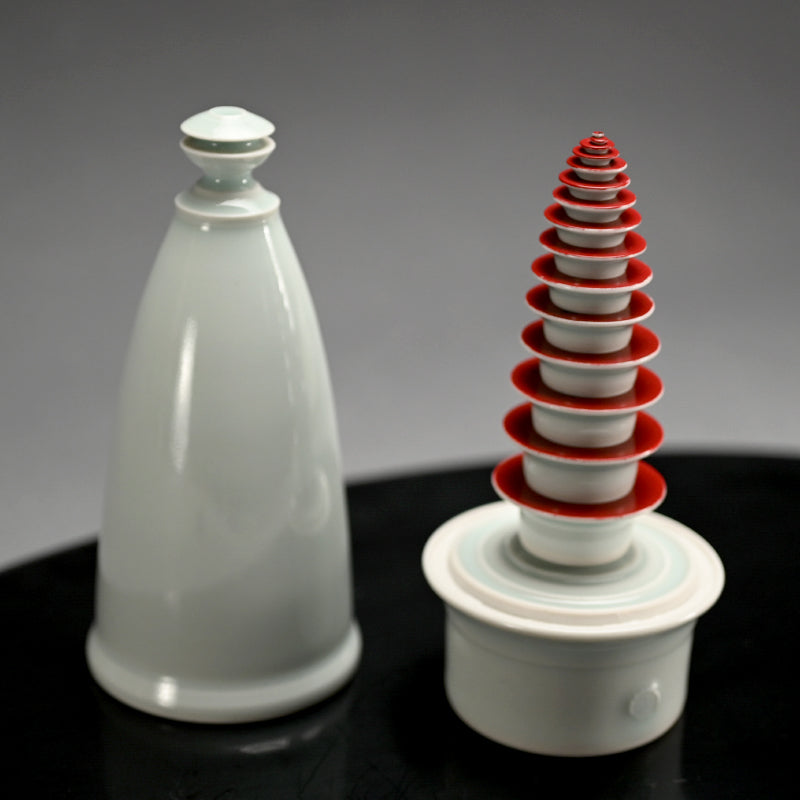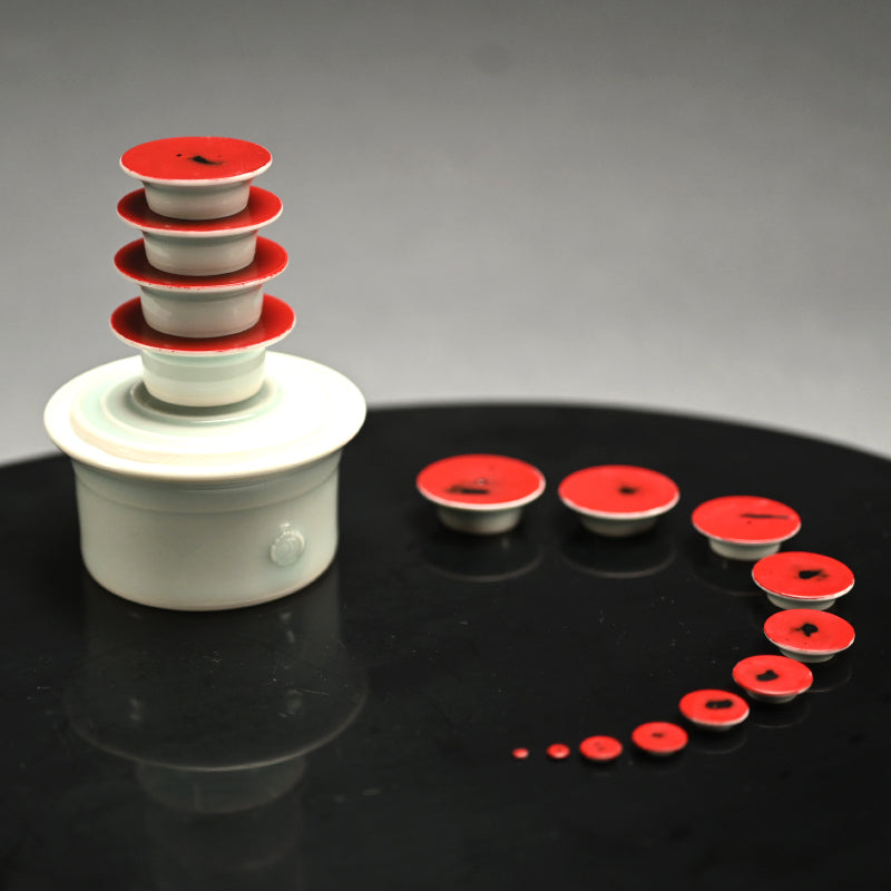 A 15 piece set of concentric dishes in celadon with Negoro red and black lacquered upper surfaces in a celadon tower by Yagi Akira enclosed in the original signed wooden box titled Ireko. The container is 18 cm (over 7 inches) tall and is in perfect condition. The largest dish is 4.5 cm (just less than 2 inches) diameter, The smallest dish is 2 mm (1/16th of an inch) and all are in perfect condition, directly from the artist.