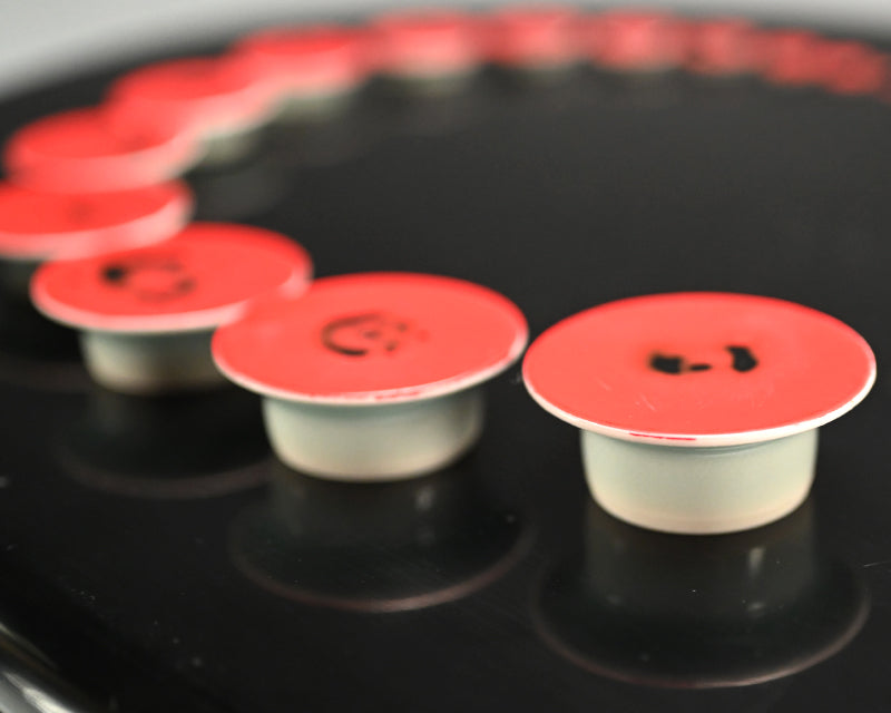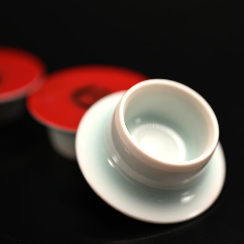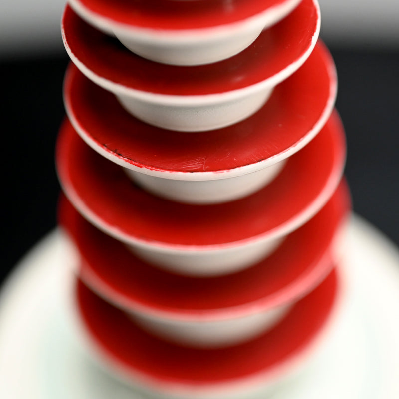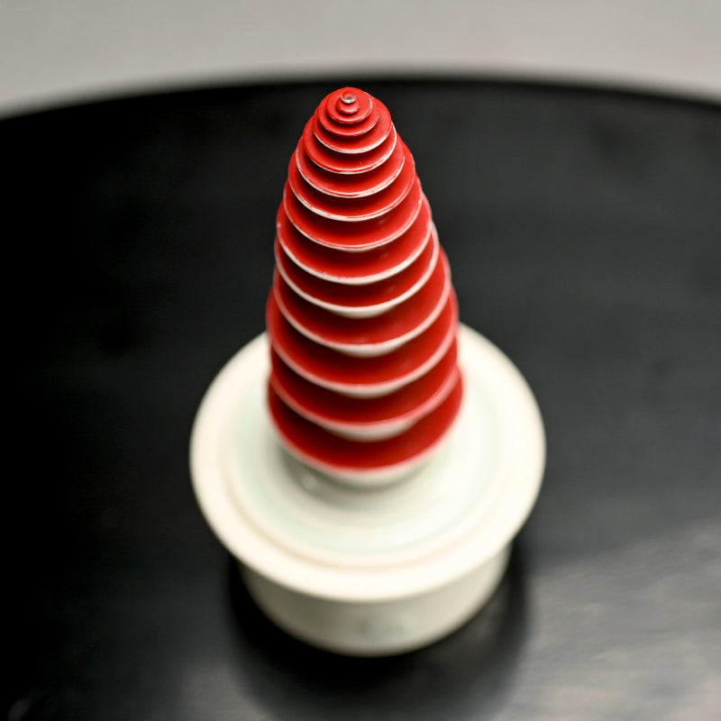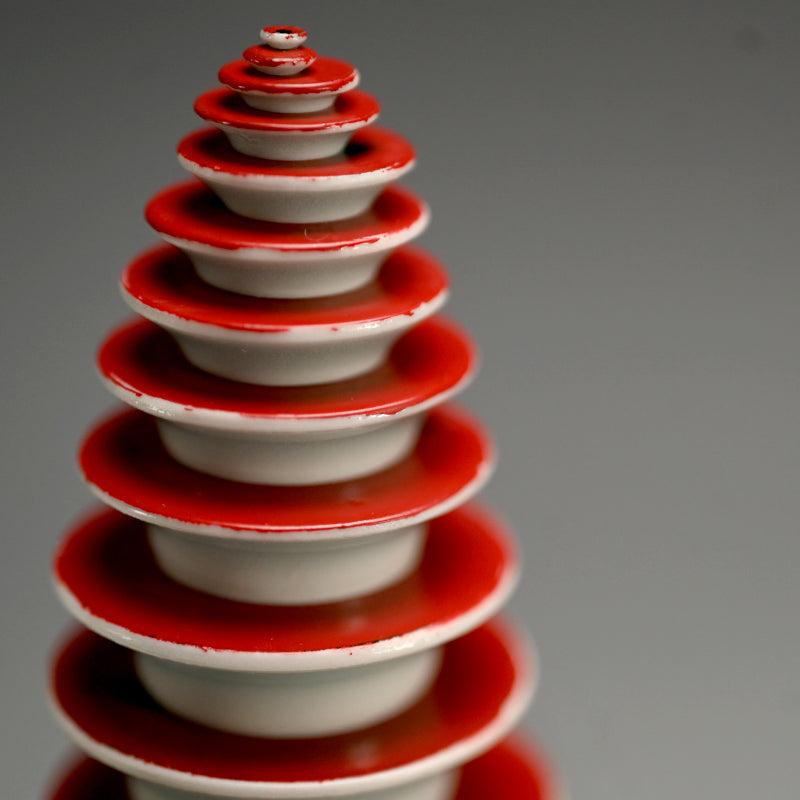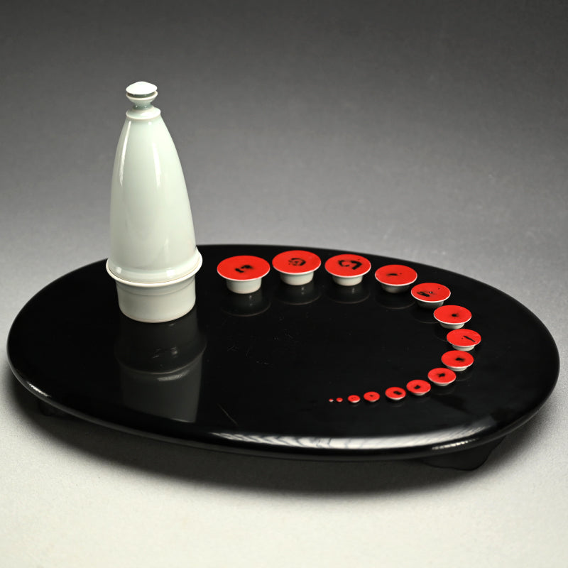 A 15 piece set of concentric dishes in celadon with Negoro red and black lacquered upper surfaces in a celadon tower by Yagi Akira enclosed in the original signed wooden box titled Ireko. The container is 18 cm (over 7 inches) tall and is in perfect condition. The largest dish is 4.5 cm (just less than 2 inches) diameter, The smallest dish is 2 mm (1/16th of an inch) and all are in perfect condition, directly from the artist.