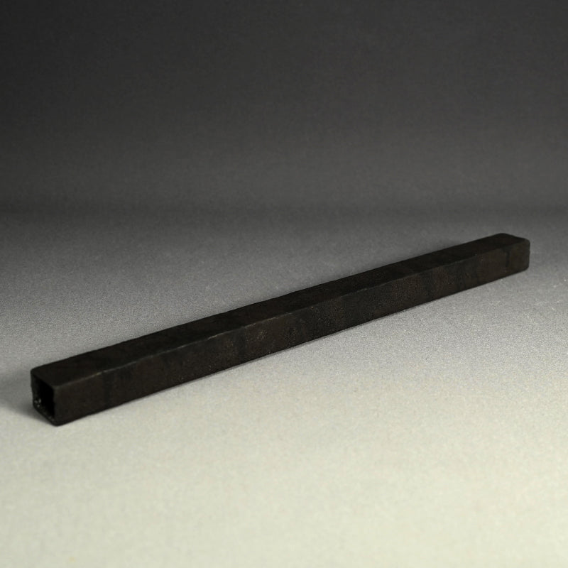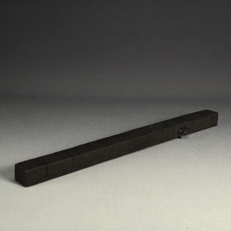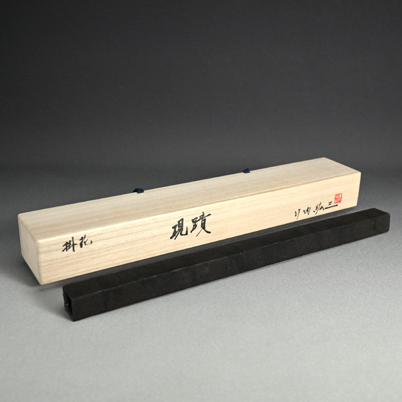 A modernist black glazed hanging wall vase by Takeuchi Kouzo enclosed in the original signed wooden box titled Kakehana Genseki. It is 3 x 4.7 x 48.7 cm (19 inches long) suspended by a ring of wire on back and is in perfect condition, directly from the artist.