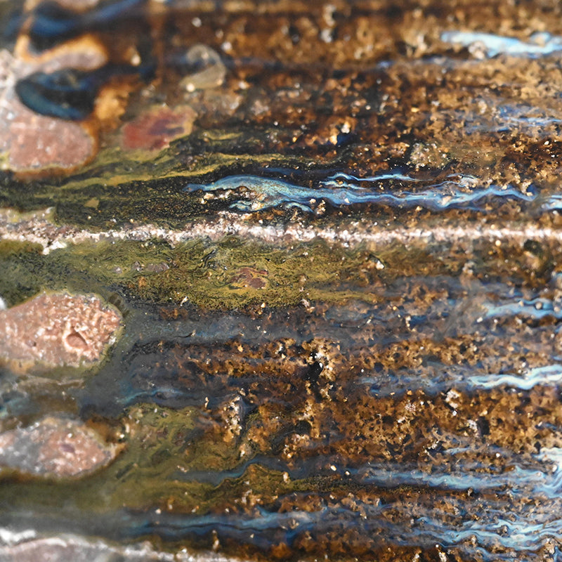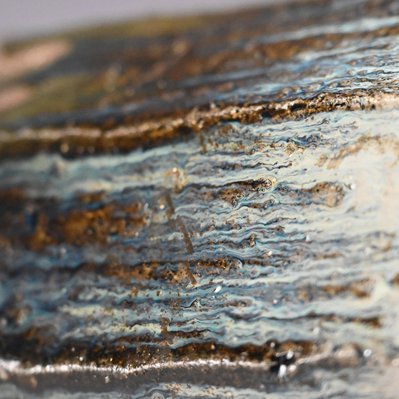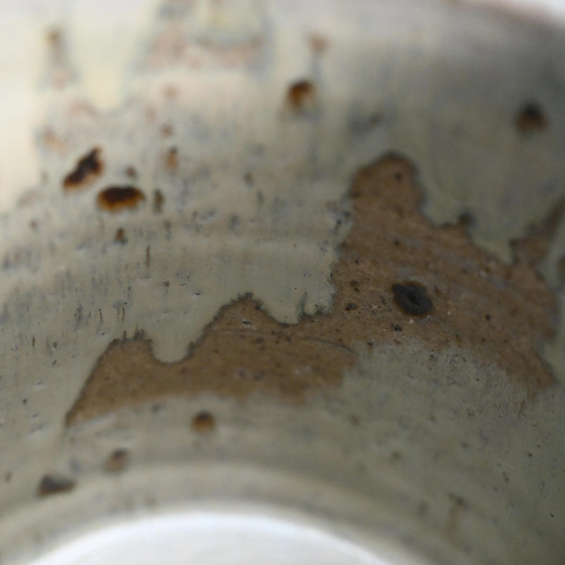 Nakagawa Jinenbo (1953-2011) was a celebrated Japanese ceramic artist always fascinated with Karatsu ware. He studied under the great Inoue Toya from the age of 24. Several years later he returned to his hometown to establish a climbing kiln of his own, which he put to great use. From there, not satisfied with his own skills, he went to Tanaka Sajiro for an additional apprenticeship. Afterwards, as many Chajin artists, he concentrated on private exhibitions as an outlet for his work, shunning the world of mass competition and retail. Known for his inventive surface treatments, he applied dark brushwork onto red iron-rich clay bodies, creating dynamic, textured finishes that spoke to both tradition and spontaneity. His work features richly textured glazes and organic forms reflective of the Karatsu tradition, especially the distinctive Madara Karatsu style, noted for its mottled, natural glazes ranging from milky white to bluish or reddish hues, achieved through wood firing and experimentation with firing techniques. His life and career were cut short far too early, making his work both highly valued and hard to find.