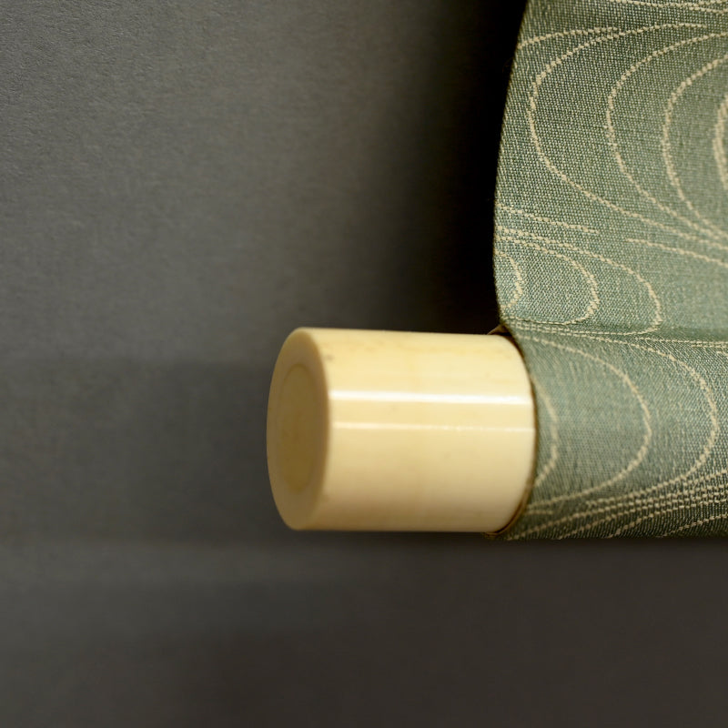 A kingfisher (poetically known in Japanese as the Jade Bird), its brilliant plumage contrasting with the dried lotus leaves upon which it is perched, alights effortlessly balanced on this ink and light color painting by Ikeda Keisen enclosed in an old wooden box. It is bordered in green silk patterned with golden ripples, with an ichimonji patterned with minows reflecting both the seasonal connotations and theme of the painting. It is 46.5 x 210 cm (18-1/2 x 82-1/2 inches). The scroll hangs beautifully, there is light scattered foxing typical of the age.